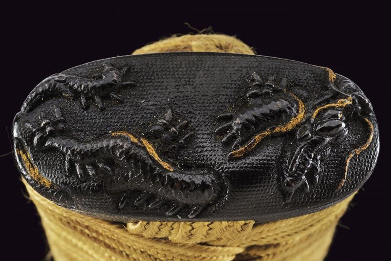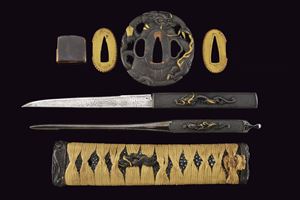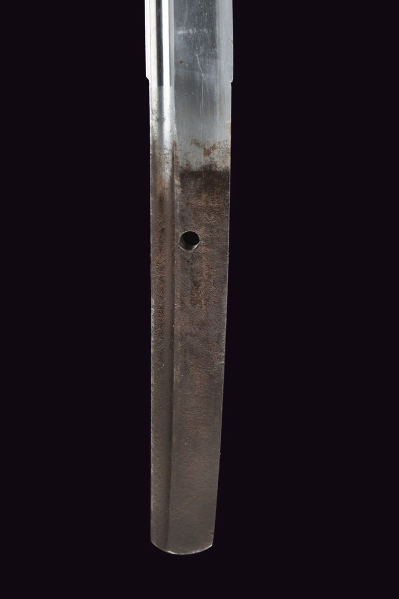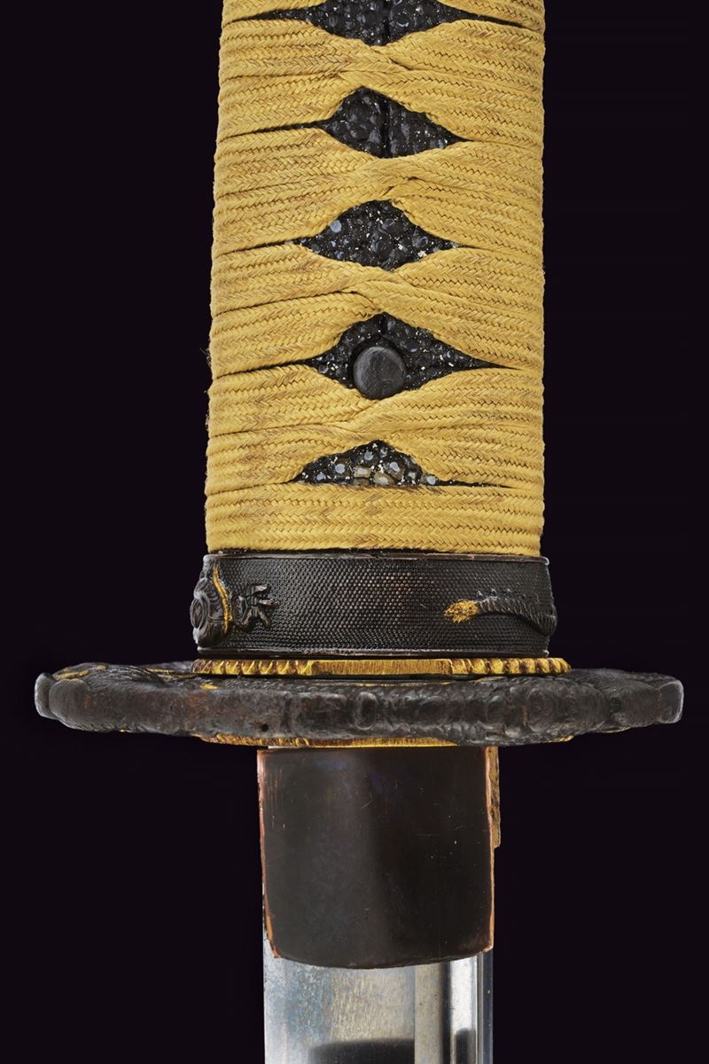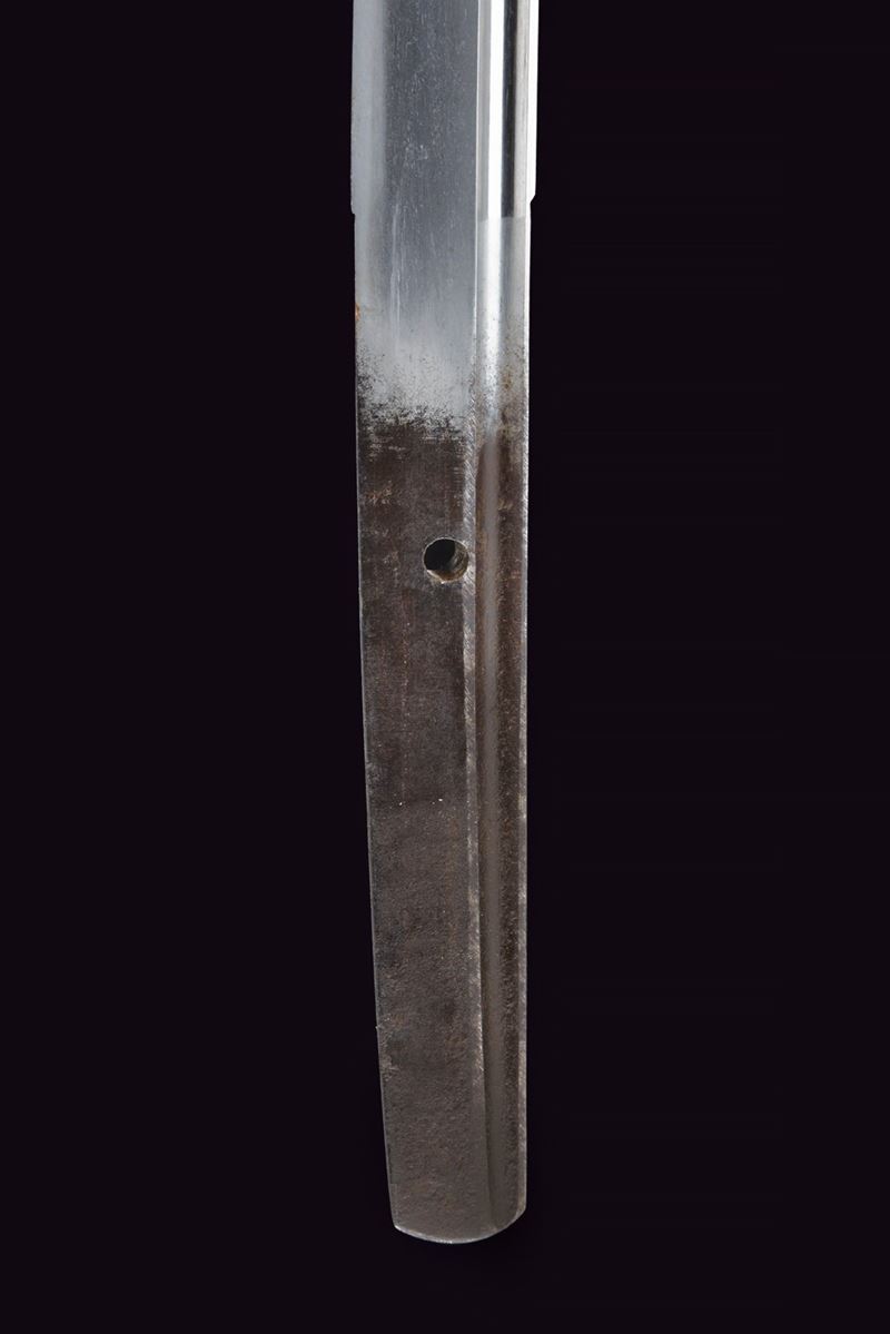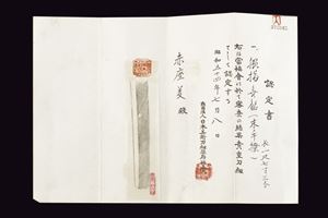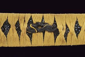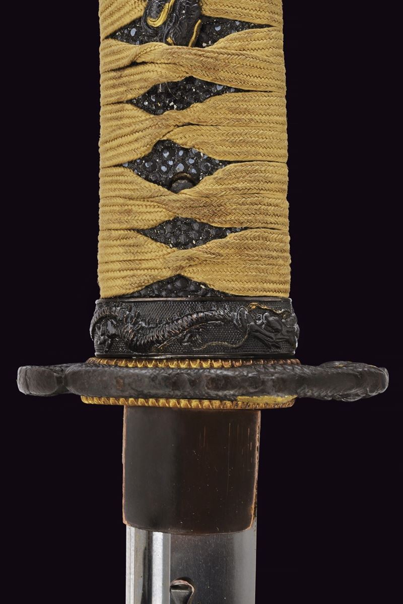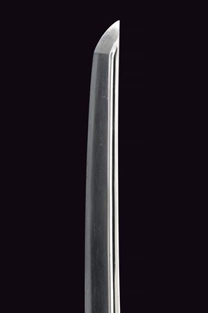 Nagasa (length 52.2 cm), with hi on both sides that continues onto the nakago. Copper habaki. Nakago mumei with a mekugi-ana. Koshirae with iron tsuba, sukashi-bori, maru-bori depicting a dragon. The gold parts are restored. Fuchi-kashira and menuki blackened and partially gilded (restored). Modern saya in painted wood with Kogai and Kozuka (blade mei). With NBTHK certificate.