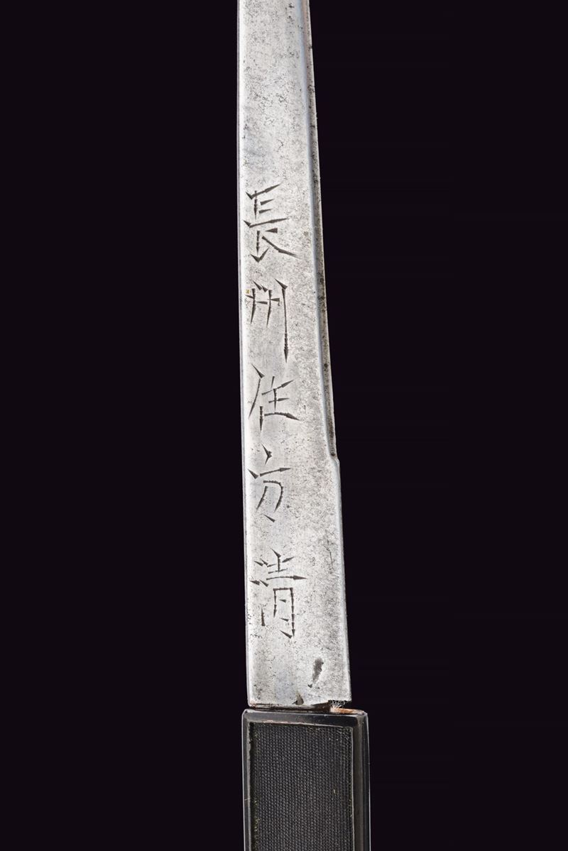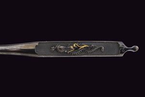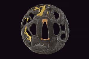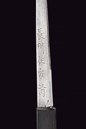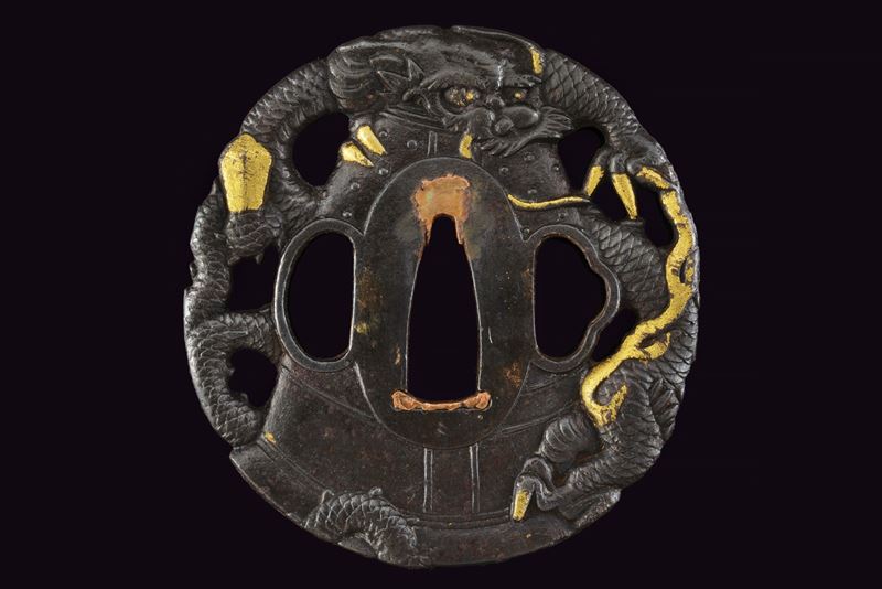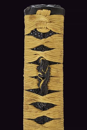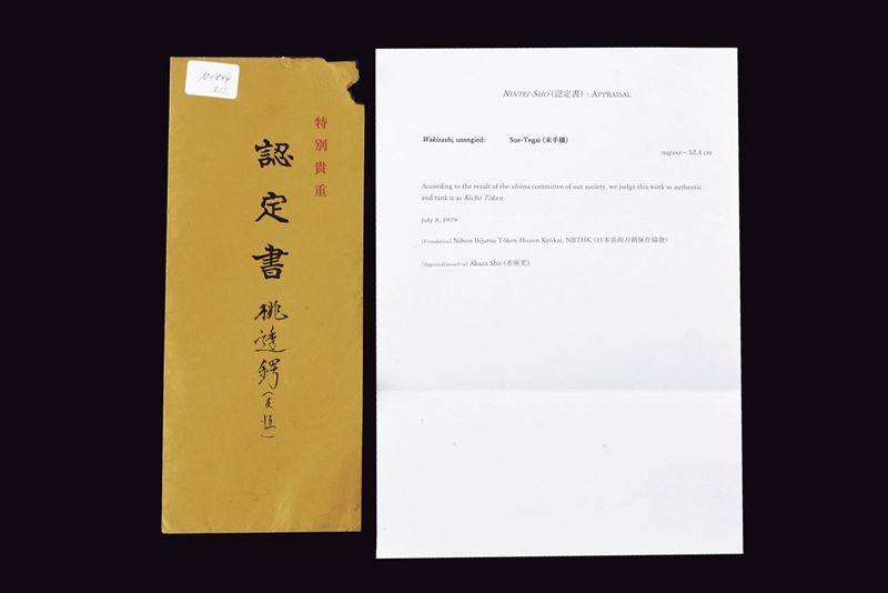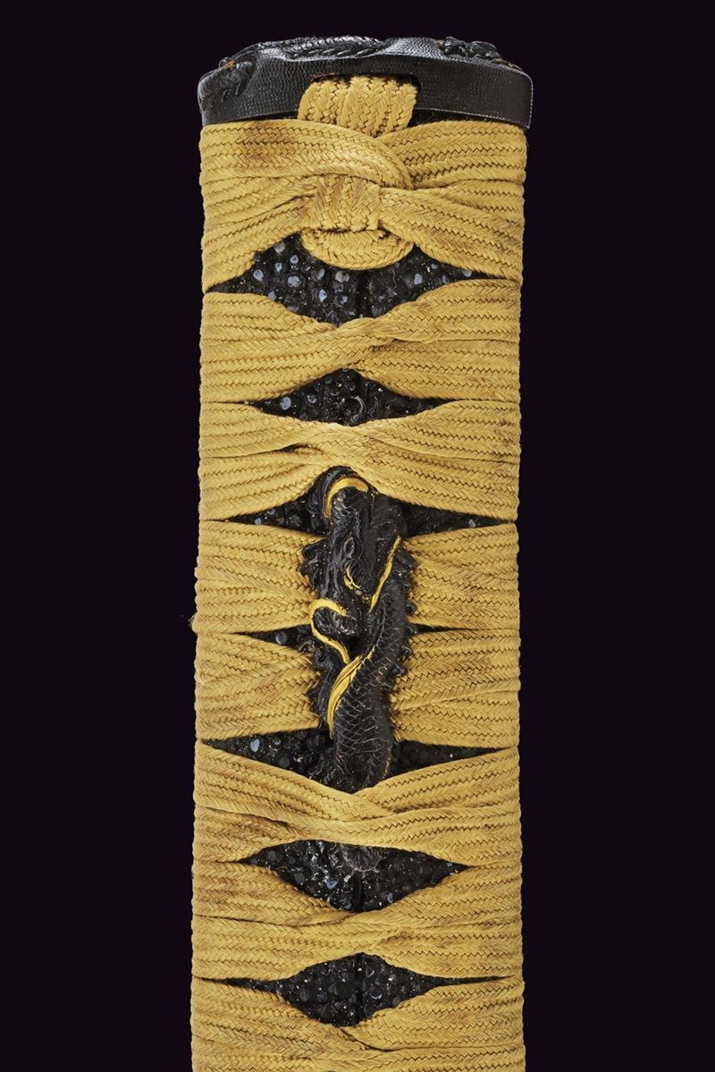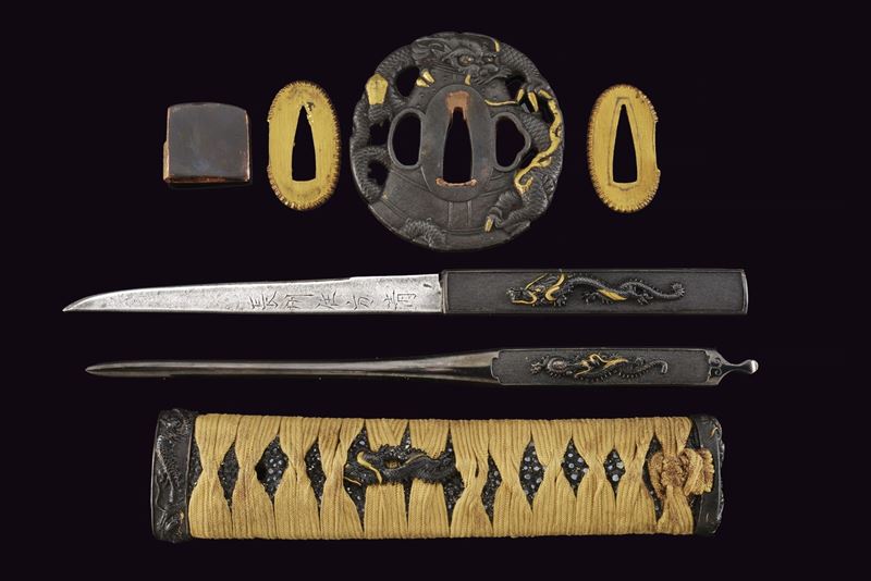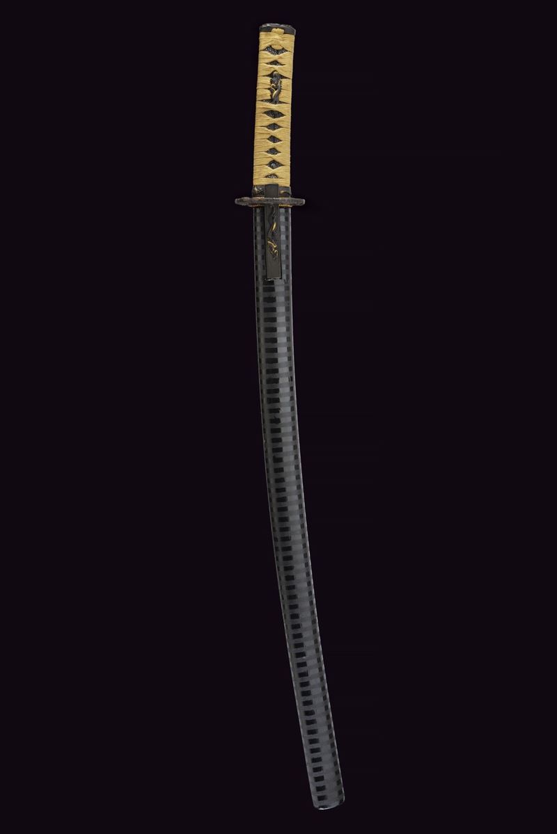 Nagasa (length 52.2 cm), with hi on both sides that continues onto the nakago. Copper habaki. Nakago mumei with a mekugi-ana. Koshirae with iron tsuba, sukashi-bori, maru-bori depicting a dragon. The gold parts are restored. Fuchi-kashira and menuki blackened and partially gilded (restored). Modern saya in painted wood with Kogai and Kozuka (blade mei). With NBTHK certificate.
