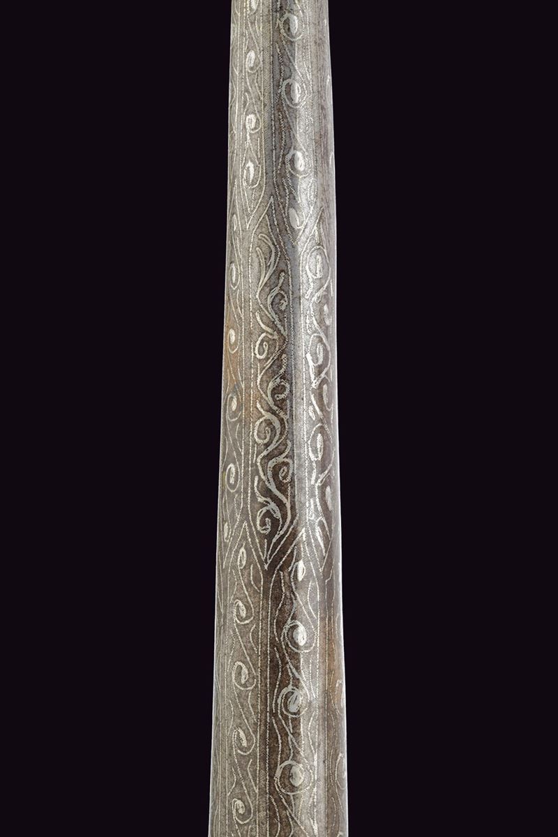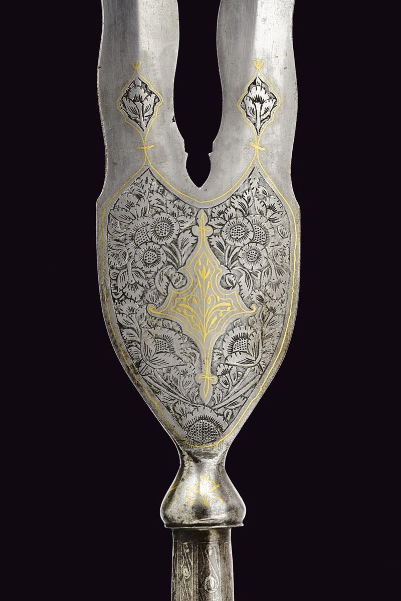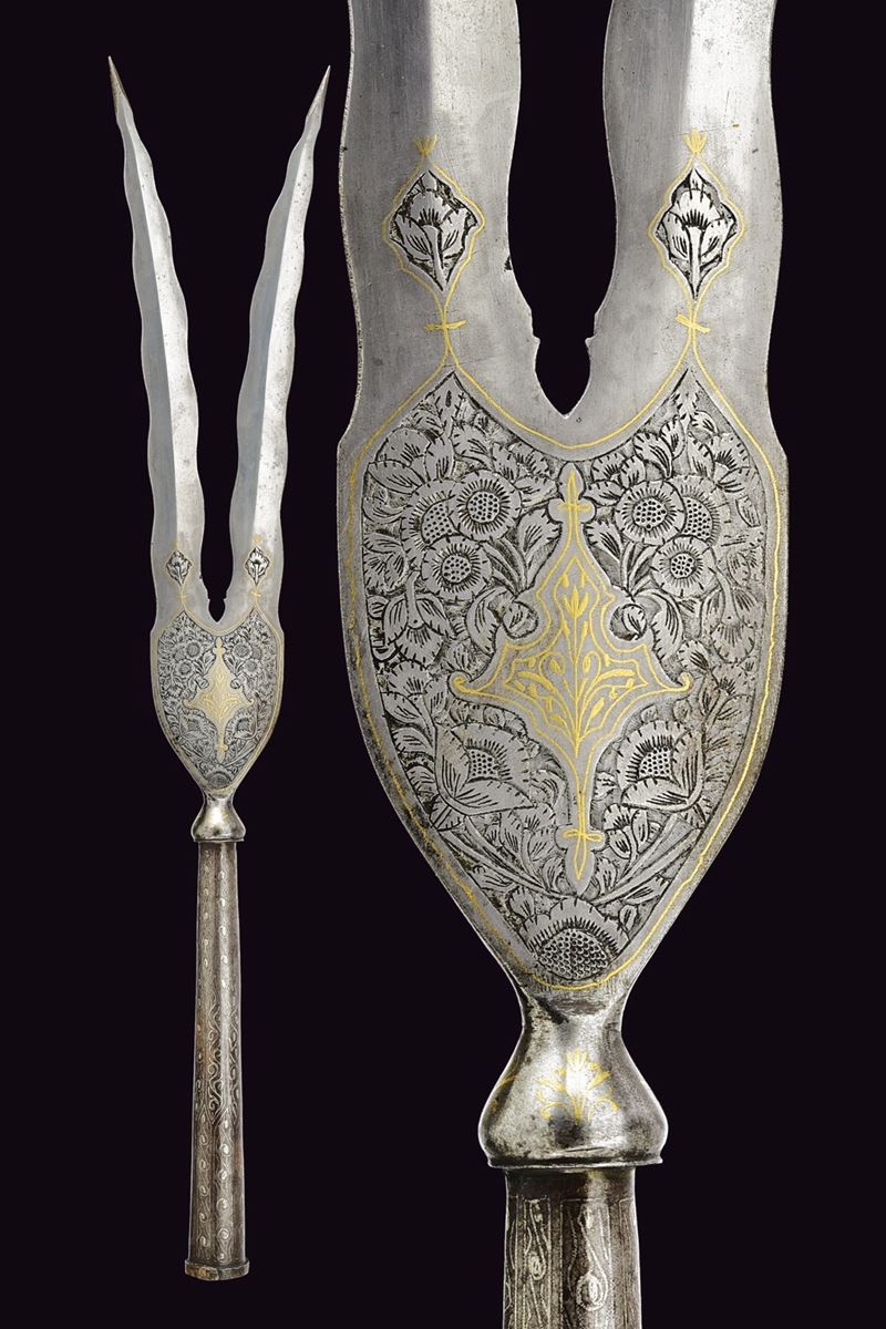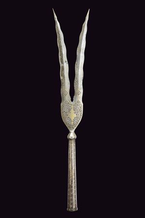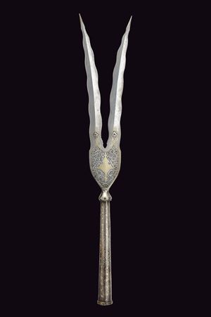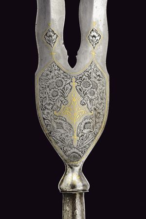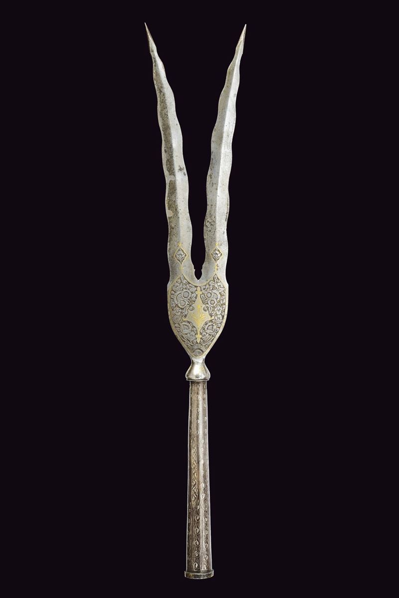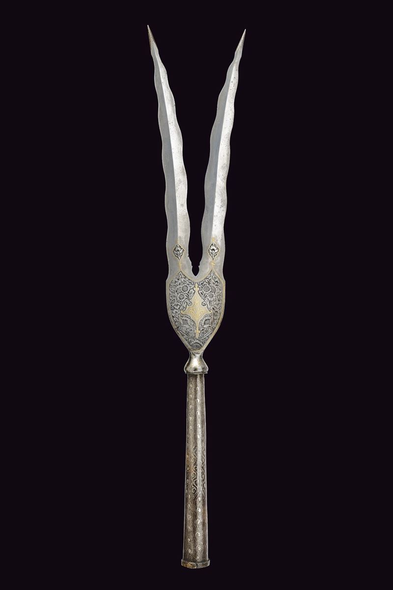 Double-tipped, iron cusp forming a "V"shape, each with undulated, double-edged blade and reinforced tip, engraved and carved with floral motifs and gilded elements at the base, base shaped as an inverted pear decorated with gold floral motifs, ferrule shaped as a truncated cone decorated with silver geometric motifs.