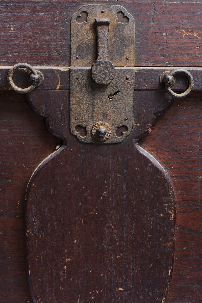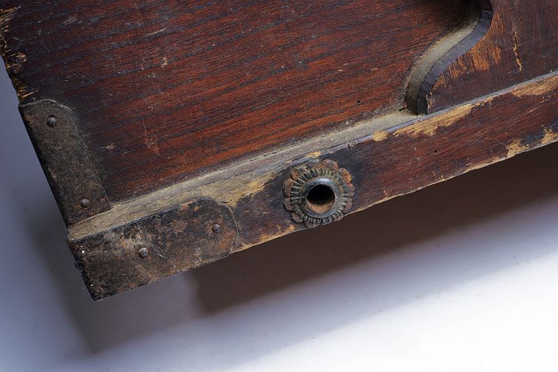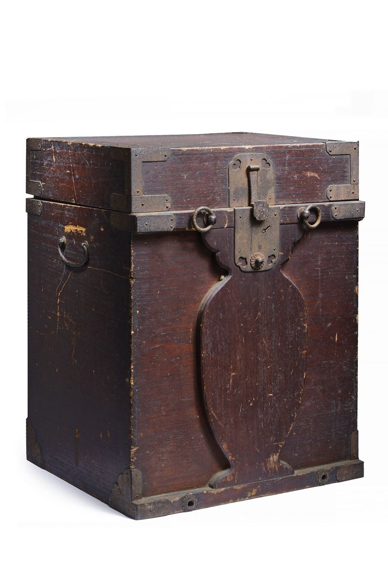 Wooden case to transport and store the Yoroi of a high-ranking Samurai. With iron rings, handles and mounts, it is also provided with a lock (missing key) and a thick, reinforced, wooden panel so that it can be carried on the shoulders like a rucksack. Various signs of use and of time, pitting in the metal parts. Edo period.