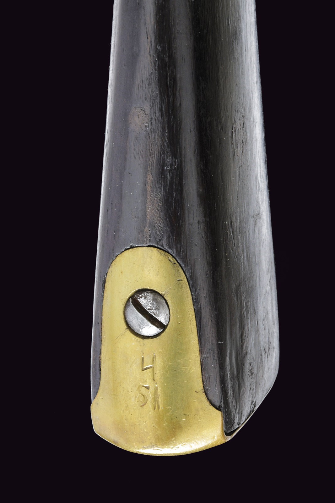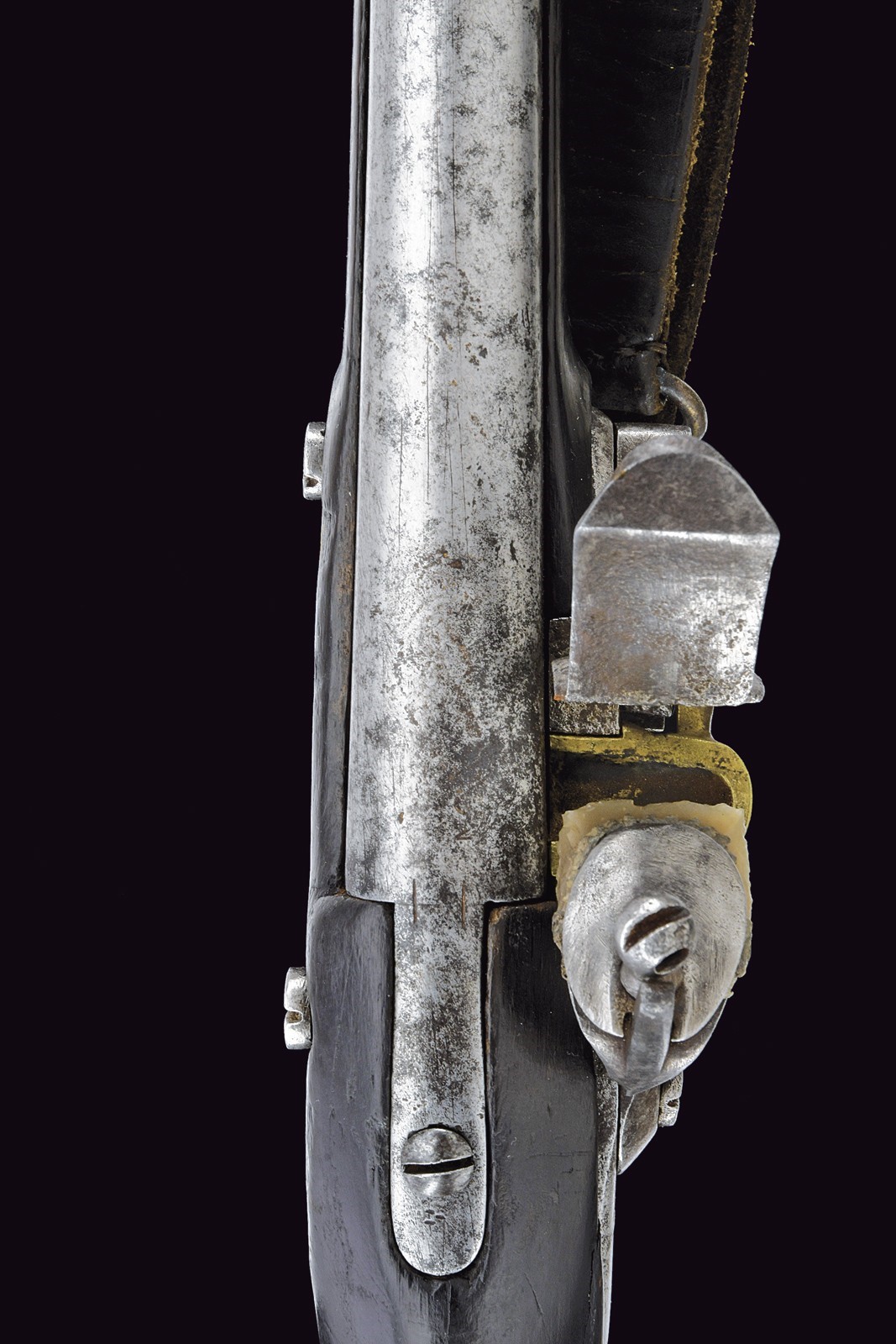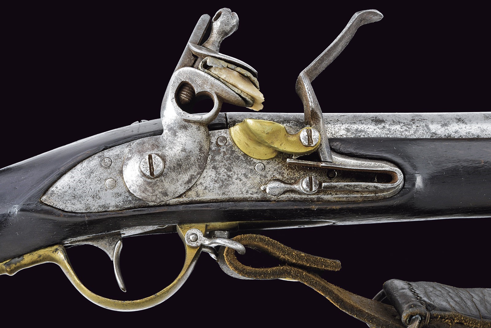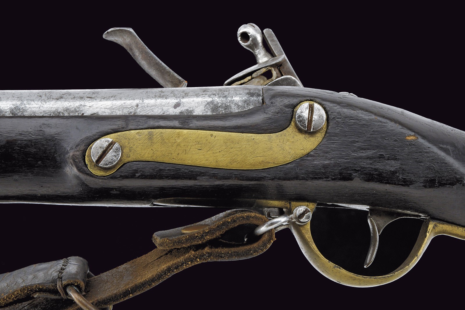Round, smoothbore, 17 mm cal. barrel, slightly squared at the sides of the base, with remains of markings; foresight on the barrel bracket; clutch for the bayonet. Flintlock with brass pan. Wooden full stock with brass mounts and iron ramrod. First model.