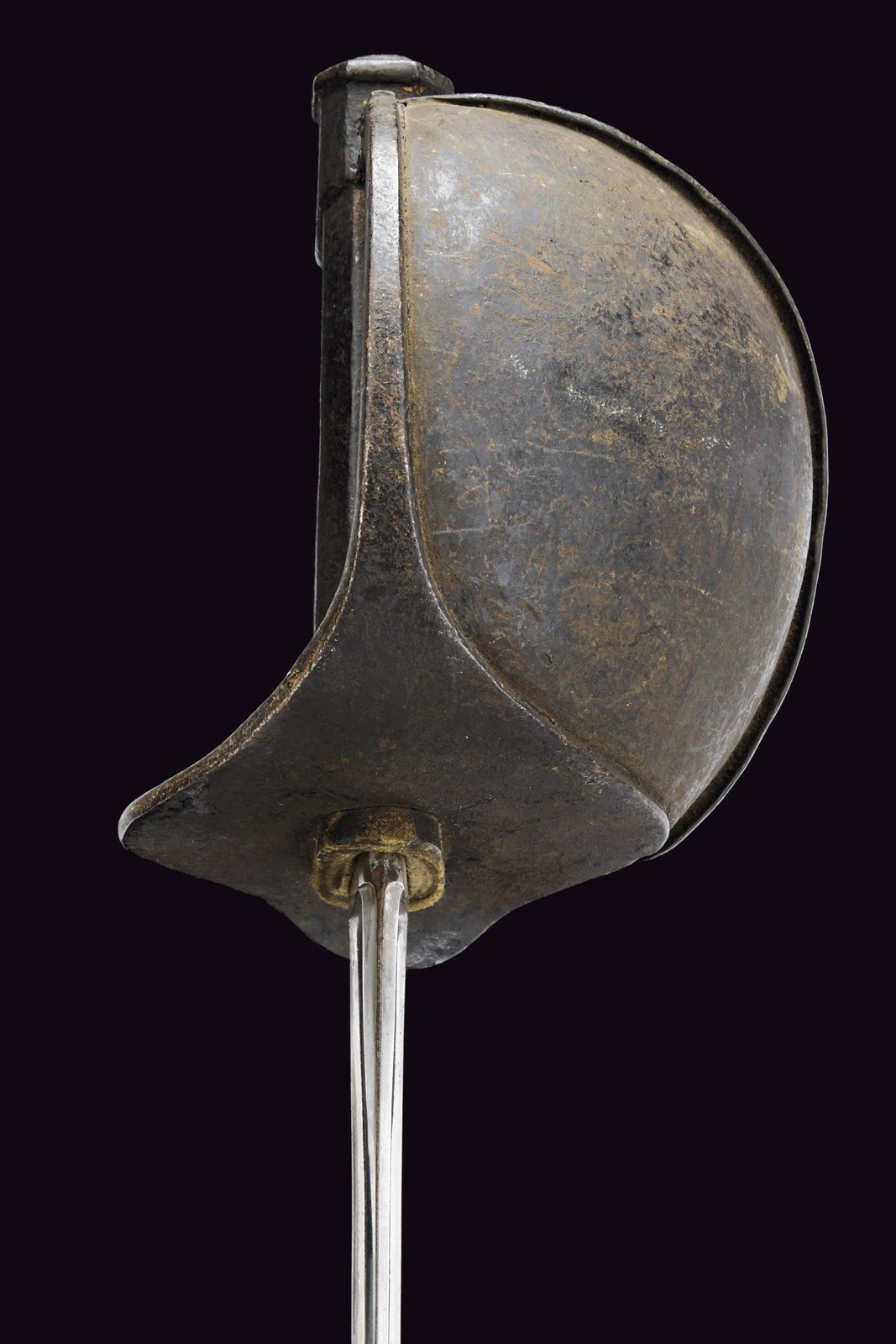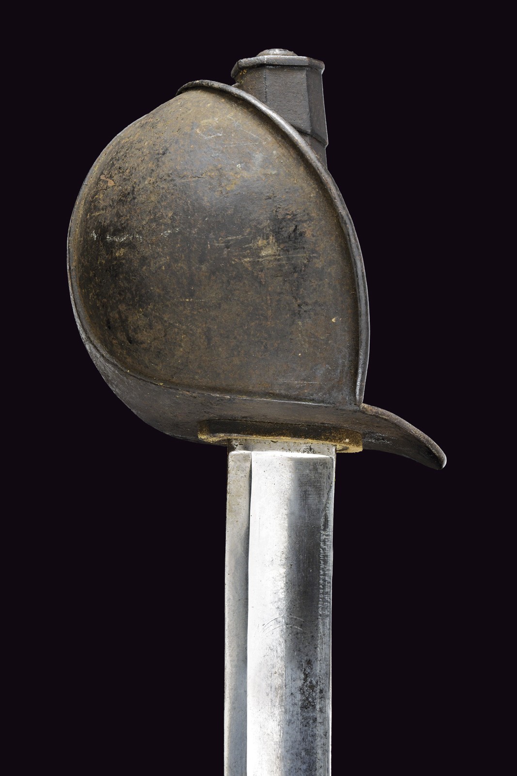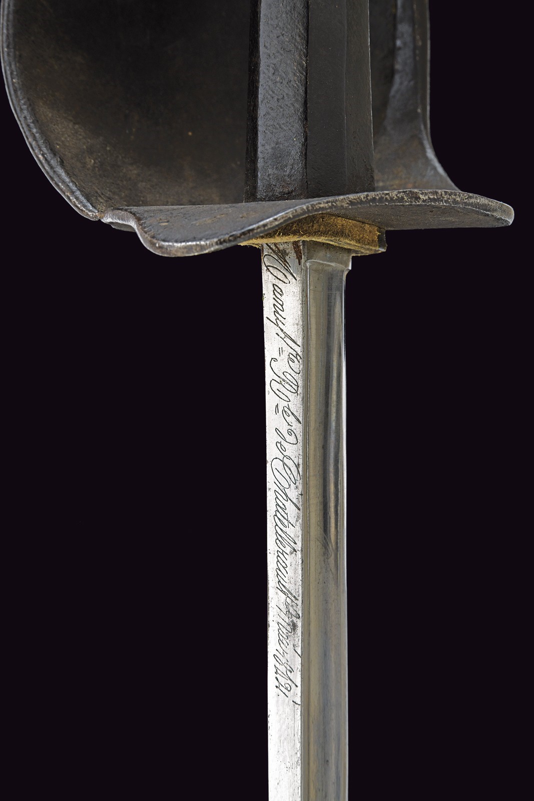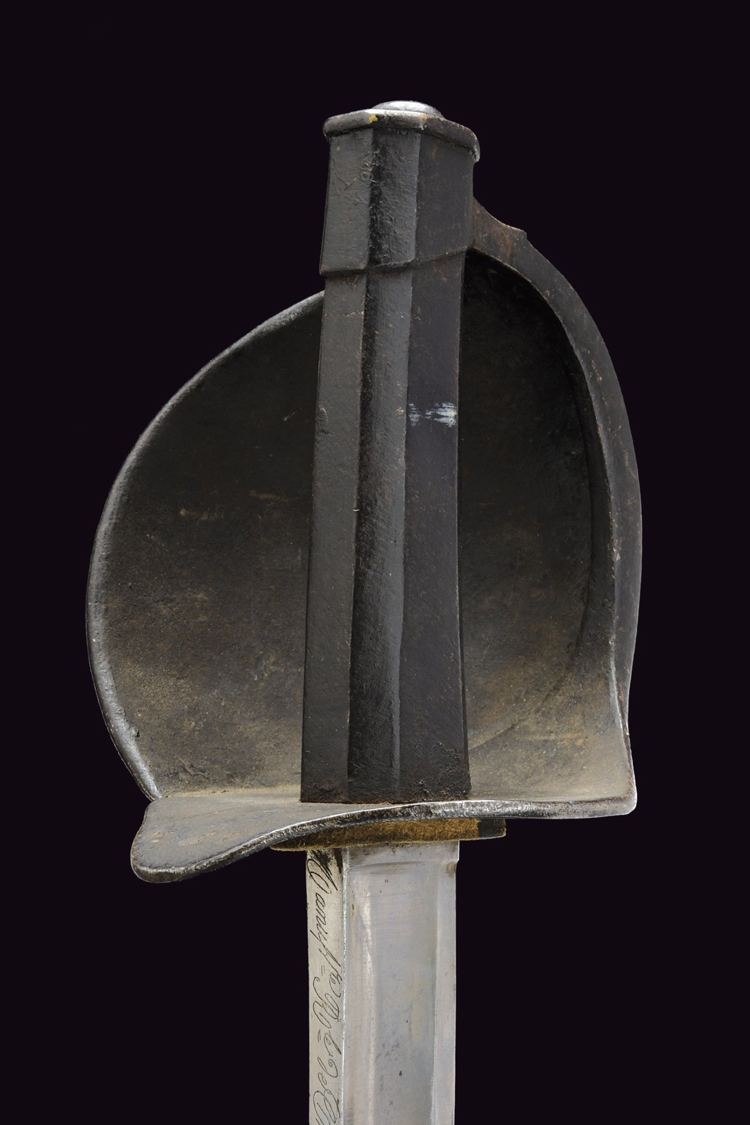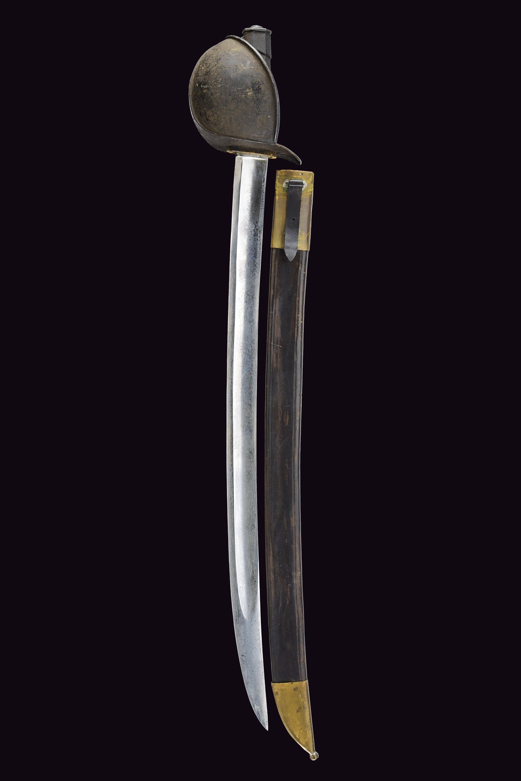 Curved blade with a fuller running along most of its length, bearing on both sides faint remains of an engraved anchor. On the spine, the marking "M.re R.le de Chatellerault, mars 1842." Iron hilt finished with black bituminous varnish, featuring a broad sail-shaped guard. Octagonal-section metal grip with short backstrap, also coated with bituminous varnish. Leather scabbard (possibly antique) with brass mounts.