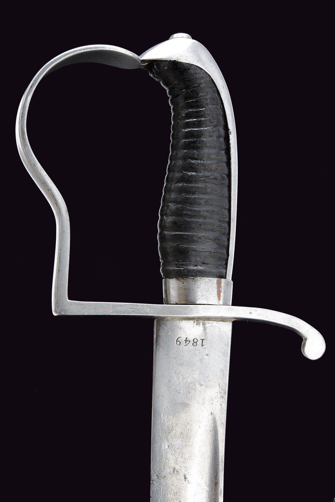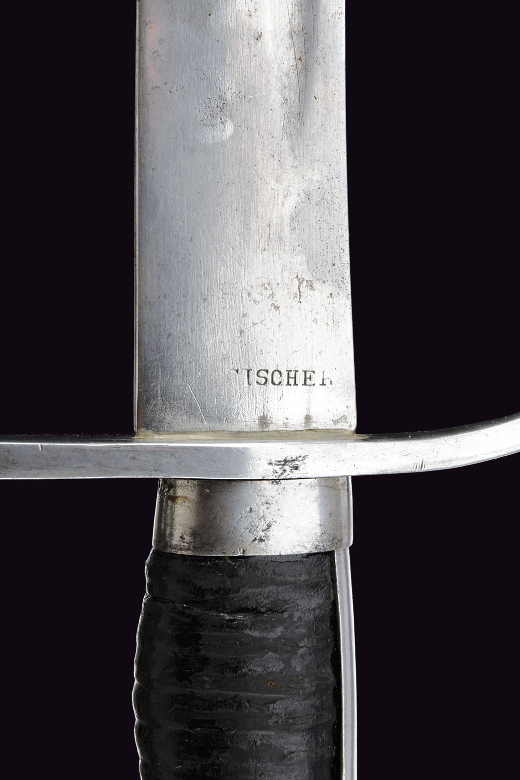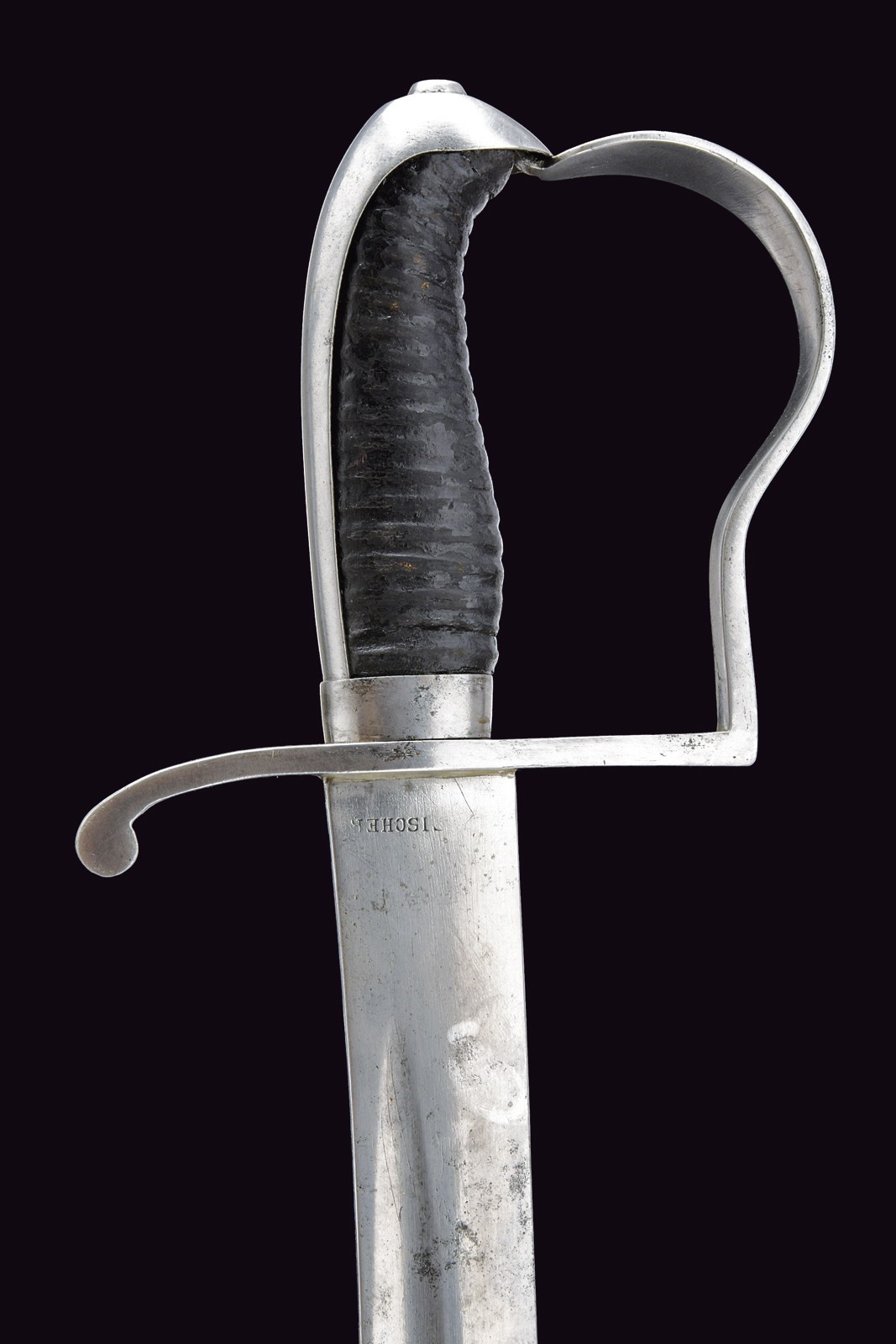 Curved, single-and-false-edged blade with fuller under the back, tang marked "FISCHER" and dated "1849", one-quillon iron hilt, wooden grip covered with leather, leather scabbard with iron mounts.
