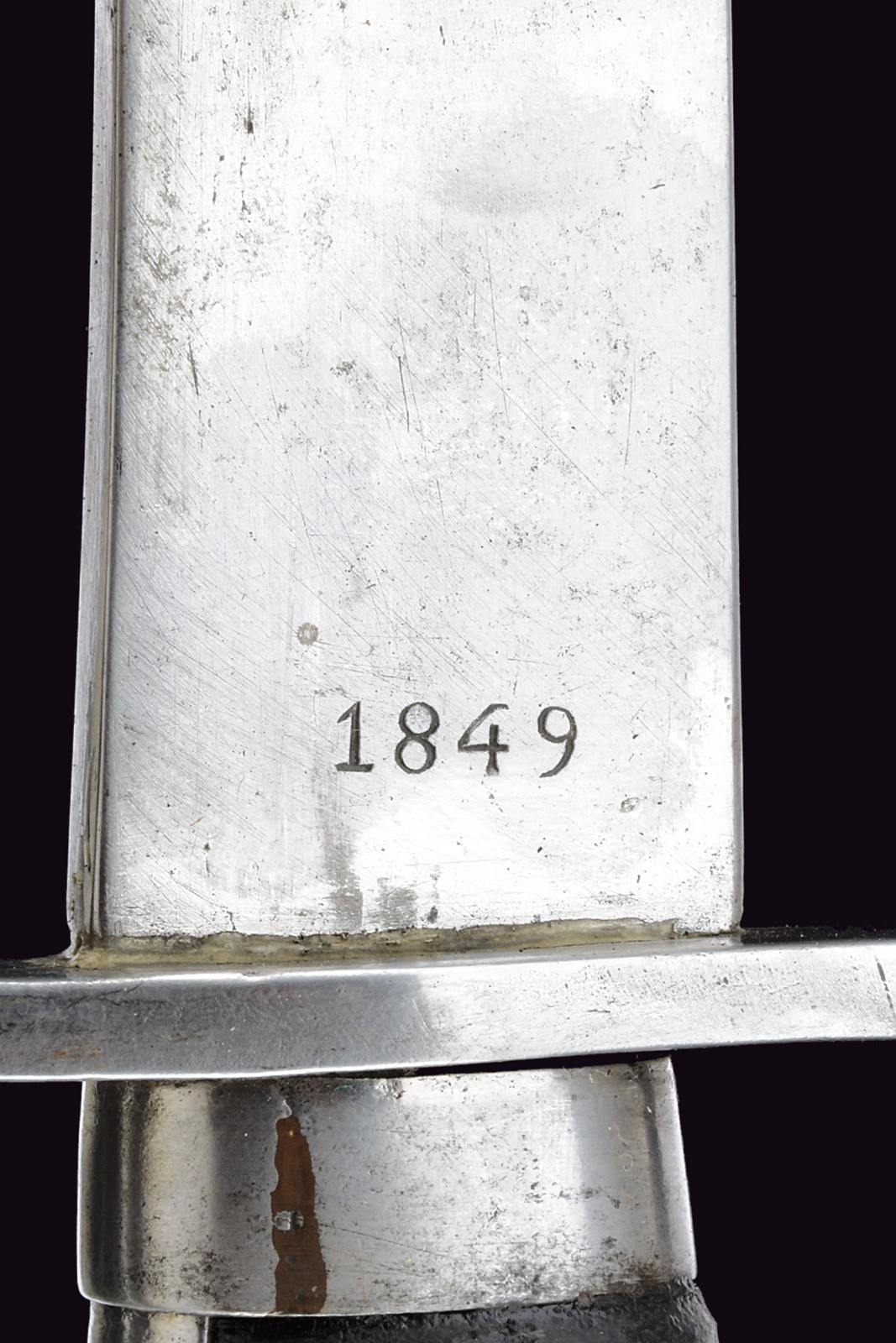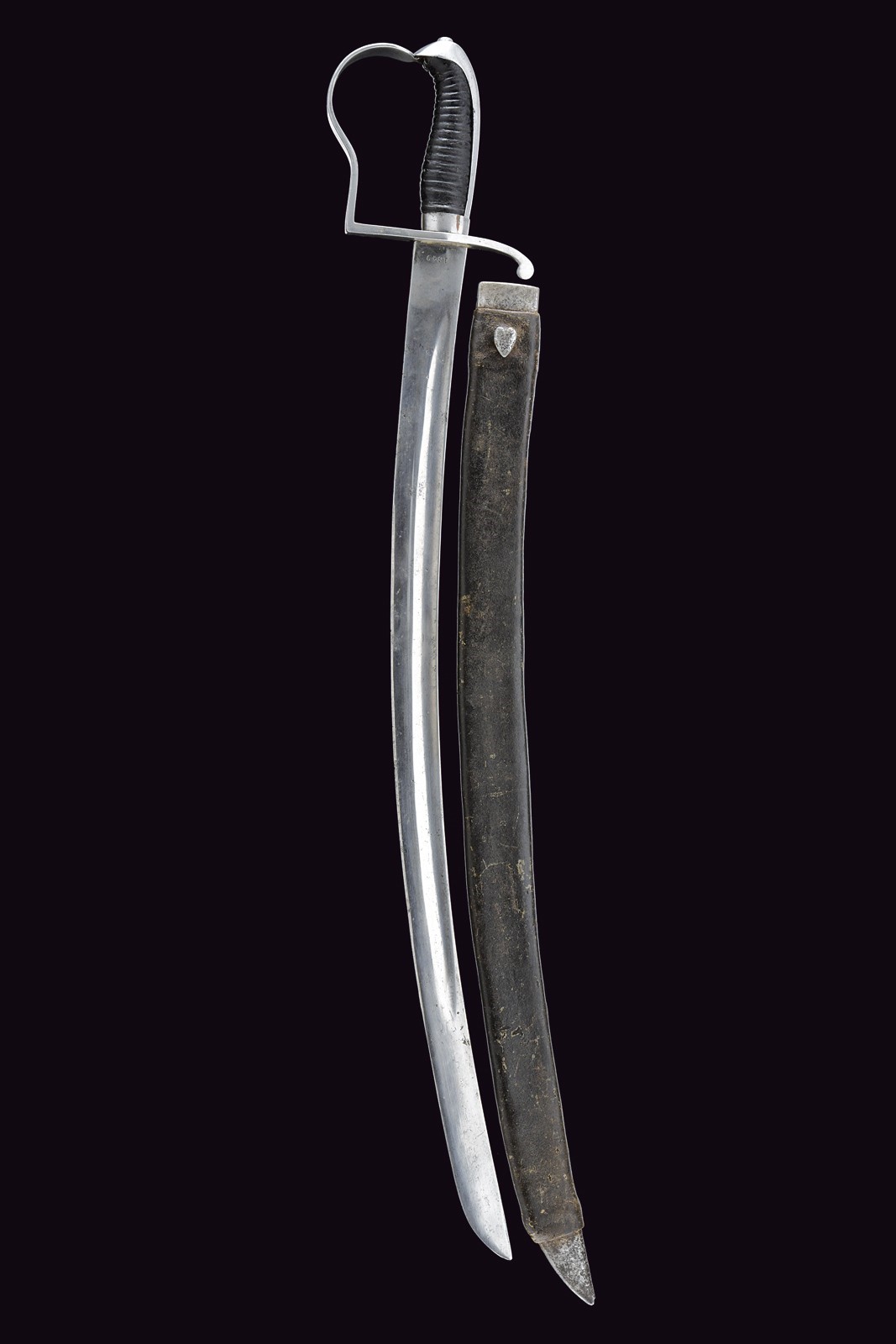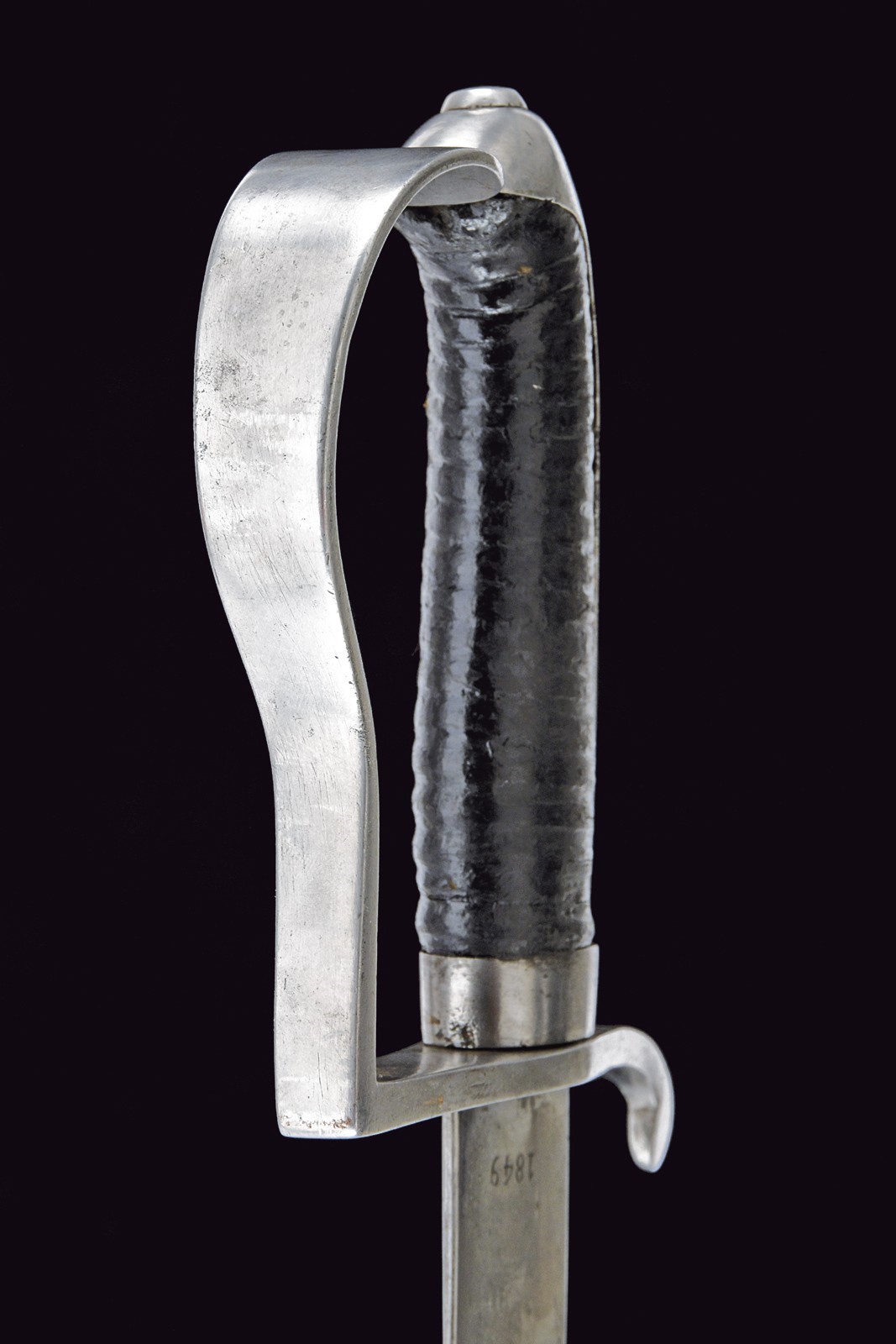 Curved, single-and-false-edged blade with fuller under the back, tang marked "FISCHER" and dated "1849", one-quillon iron hilt, wooden grip covered with leather, leather scabbard with iron mounts.