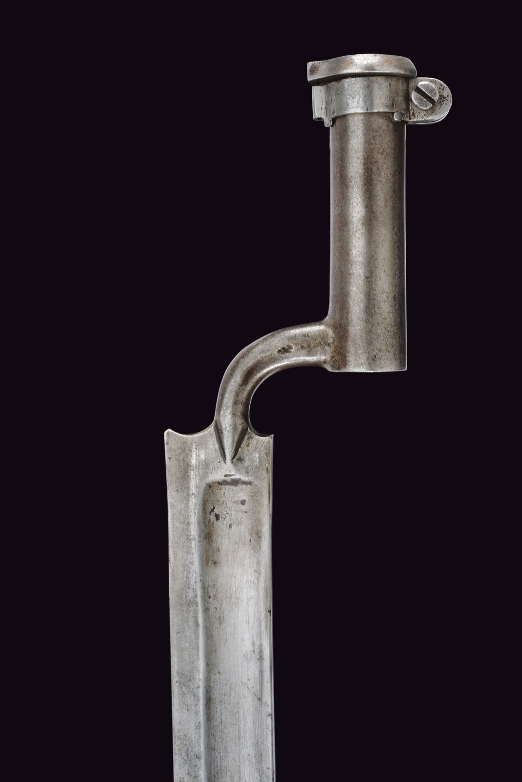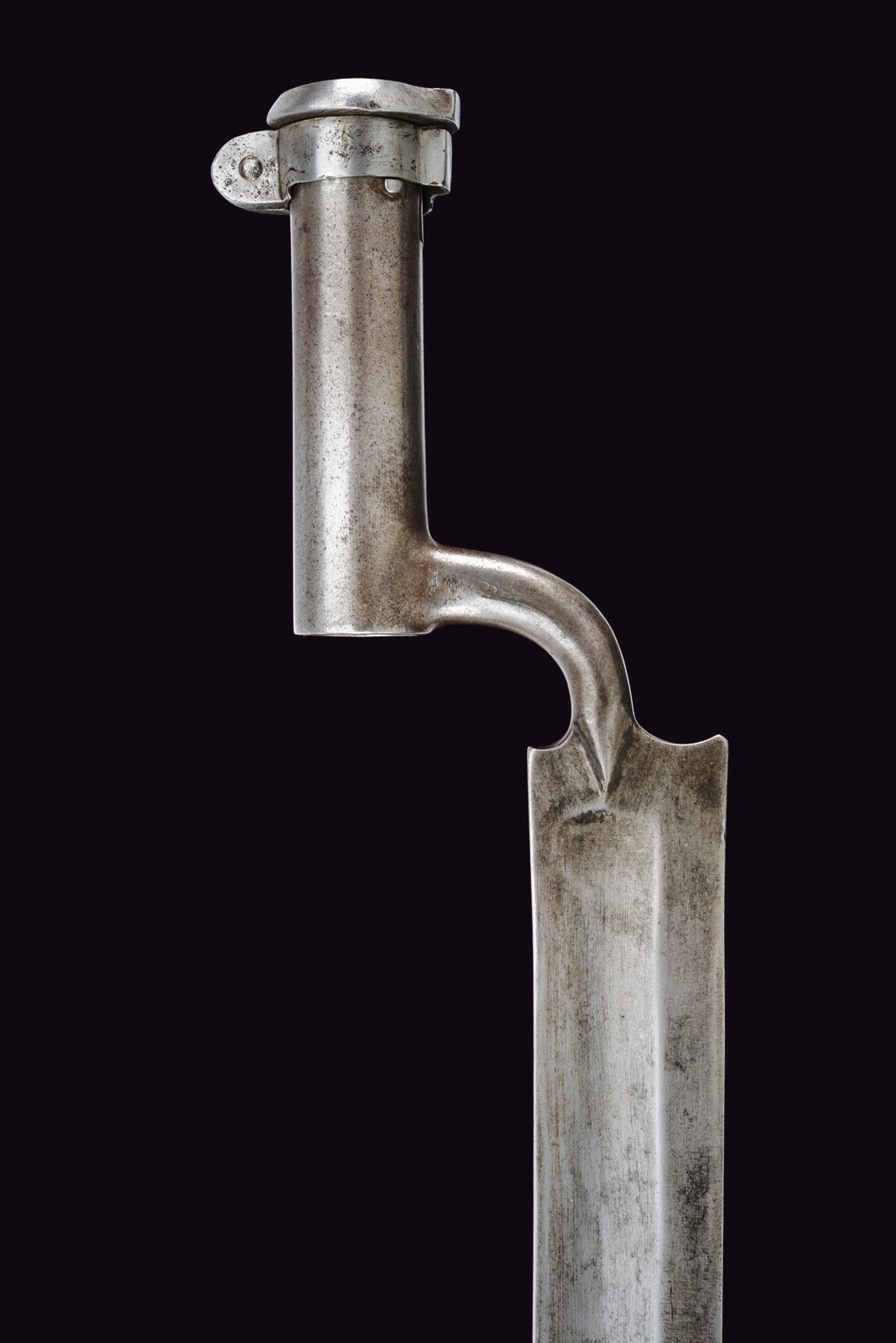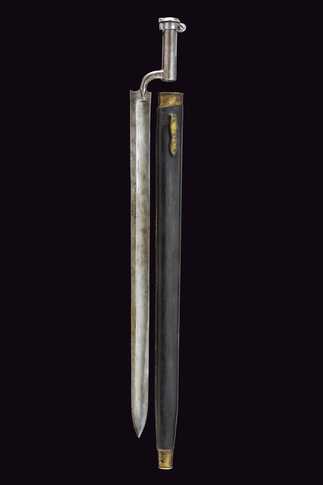 Long, straight, single-and-false-edged blade, with wide central fuller. Complete with leather-covered wooden scabbard, with brass mounts and hook.
