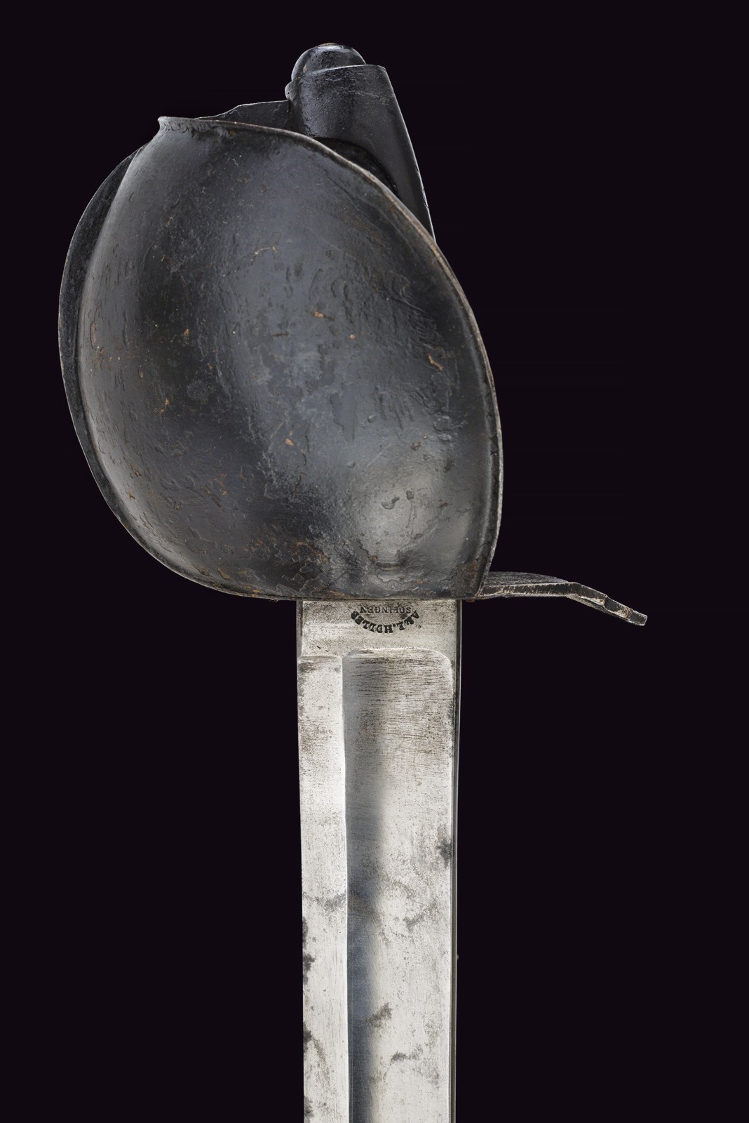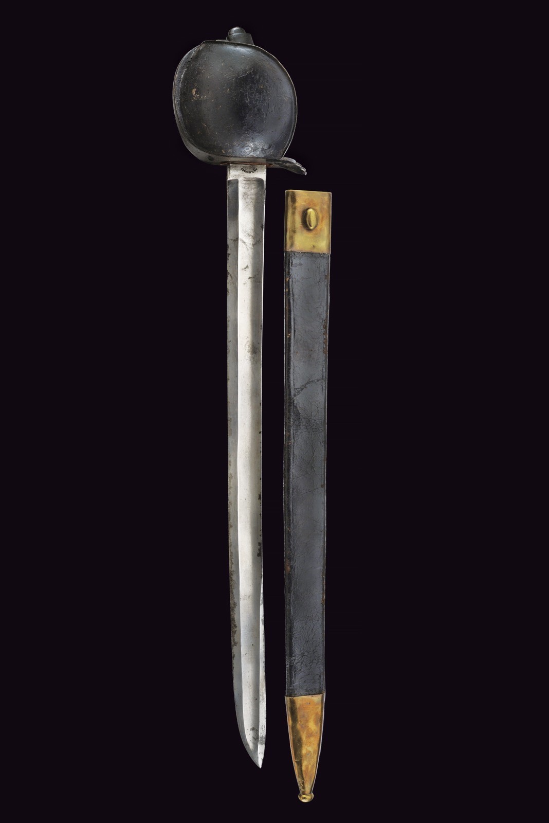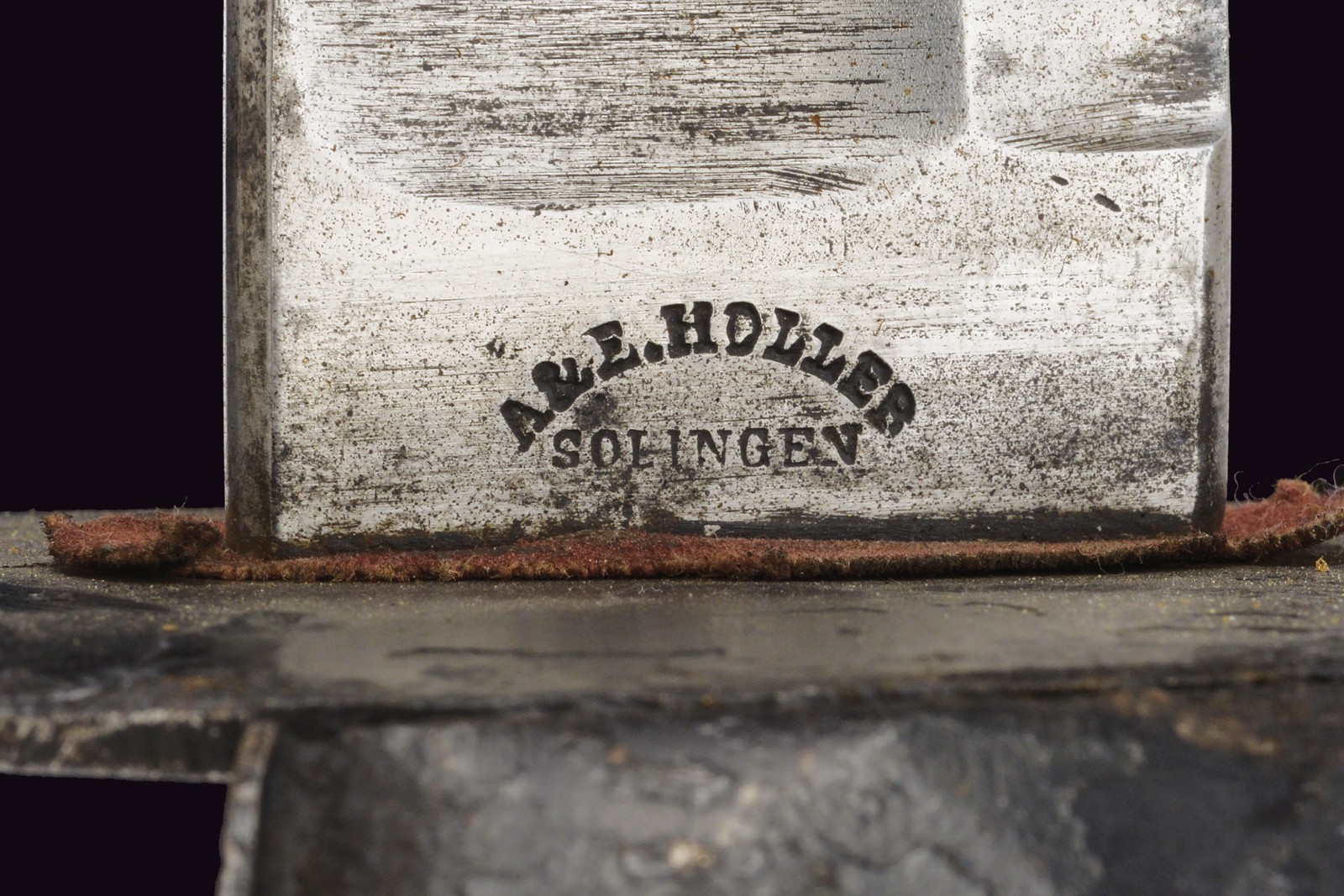 Wide, nearly straight blade with fuller, marked on the ricasso "A. & E. HOLLER SOLINGEN" and marked "EC." Iron mounts finished with black bituminous varnish, featuring a wide knuckle guard. Black-painted, iron grip with a long smooth cap. Complete with a leather scabbard, likely of older manufacture (showing evident signs of wear and age), with brass mounts featuring remains of stamps, not clearly legible.