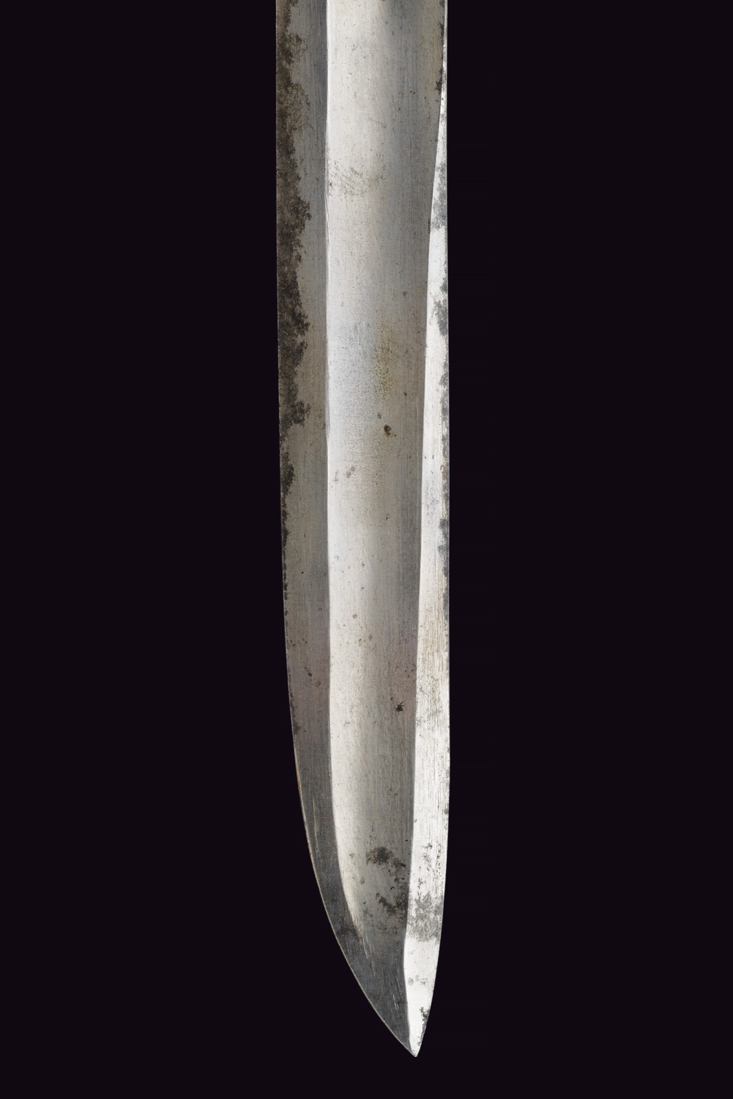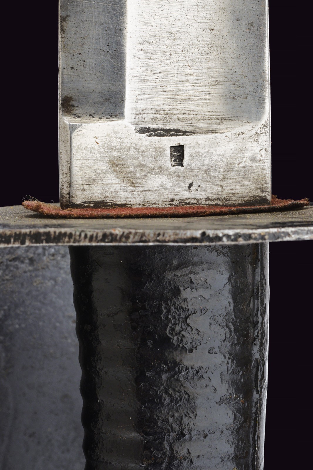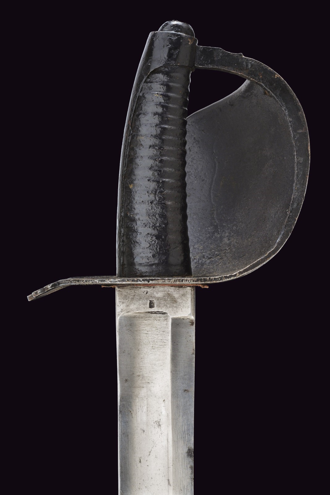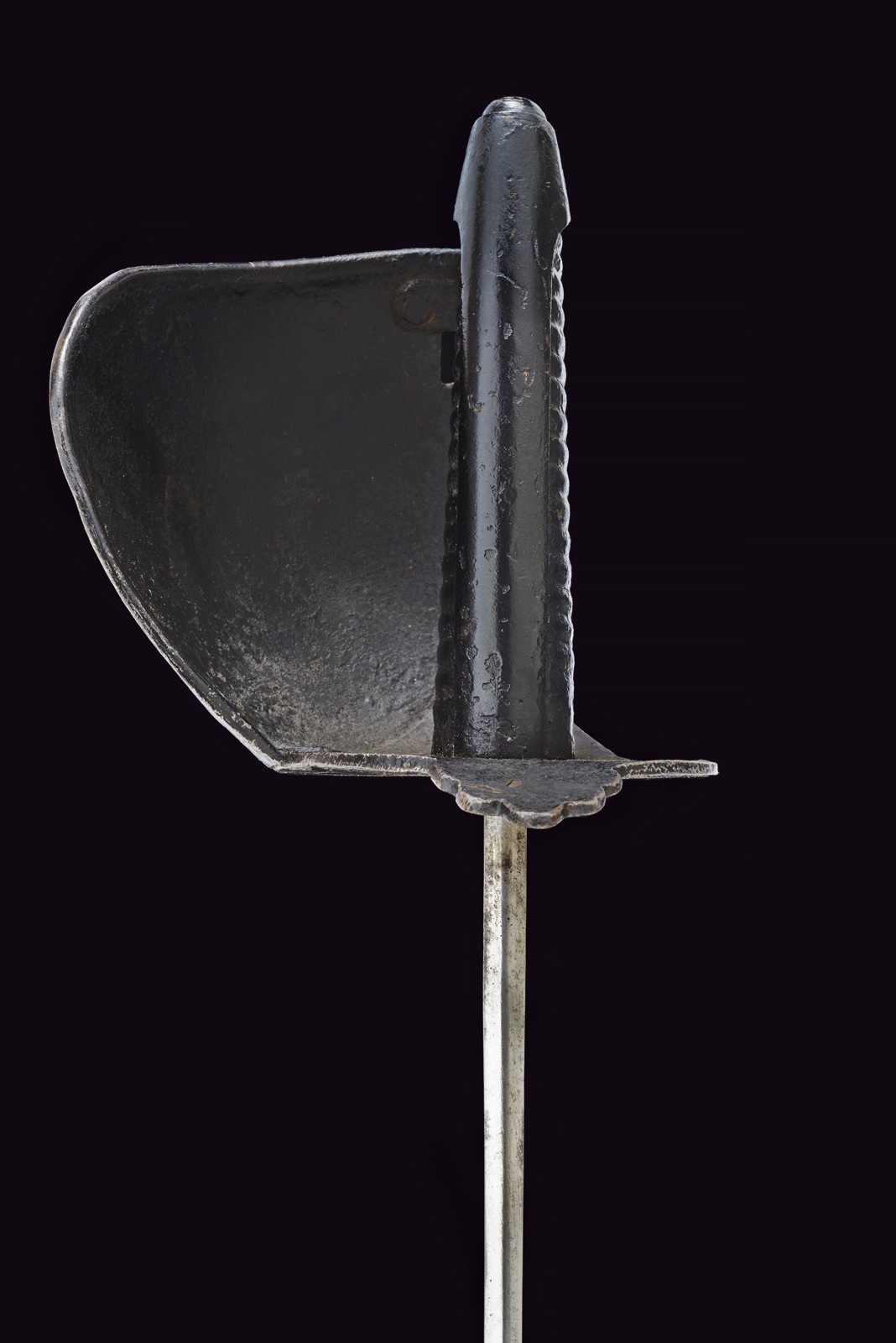 Wide, nearly straight blade with fuller, marked on the ricasso "A. & E. HOLLER SOLINGEN" and marked "EC." Iron mounts finished with black bituminous varnish, featuring a wide knuckle guard. Black-painted, iron grip with a long smooth cap. Complete with a leather scabbard, likely of older manufacture (showing evident signs of wear and age), with brass mounts featuring remains of stamps, not clearly legible.