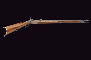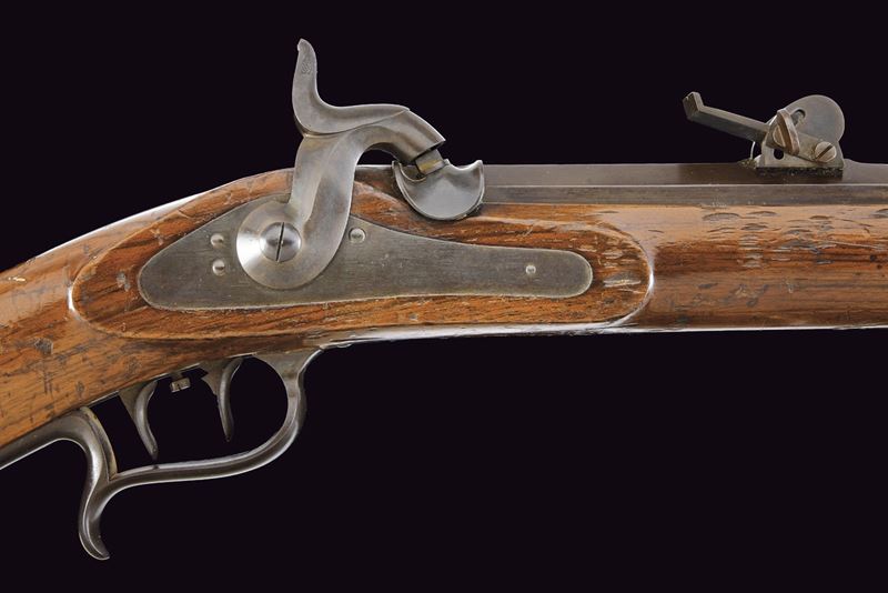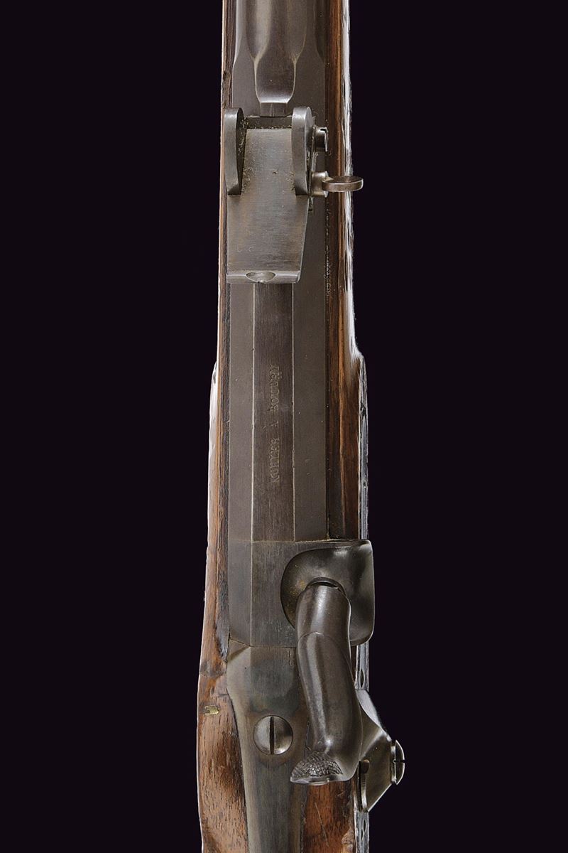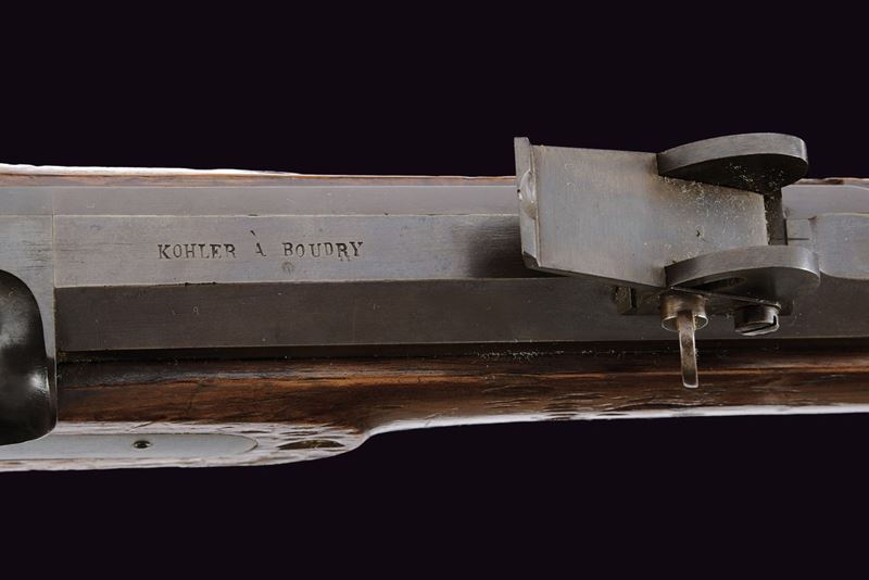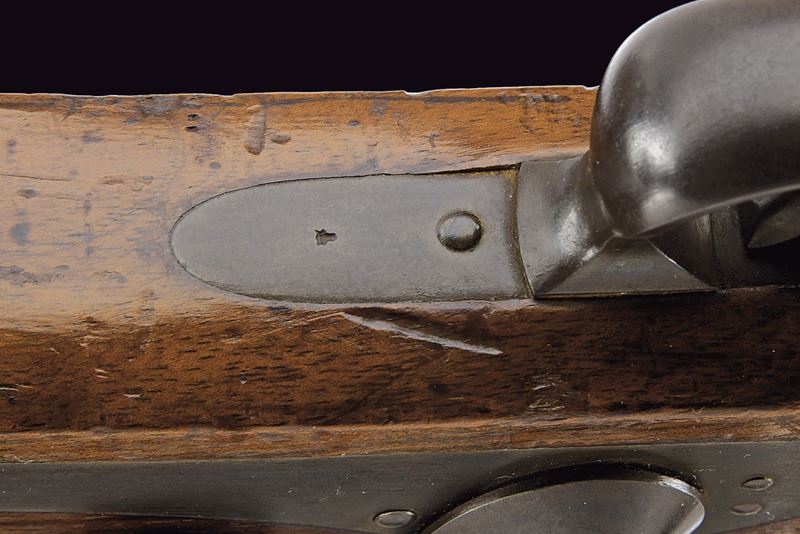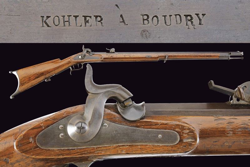 Round, browned, rifled, 10 mm cal barrel with square powder chamber signed “KOHLER A BOUDRY”; foldaway and adjustable rear sight, clutch for the bayonet and precision front sight. Long smooth, browned tang. Forward-spring lock with flat, browned plate and hammer. Full wooden stock, showing signs of use and time; Piedmontese mark opposite the lock and behind the rear tang of the trigger guard. Browned iron mounts. Set trigger needs revision. Iron ramrod.