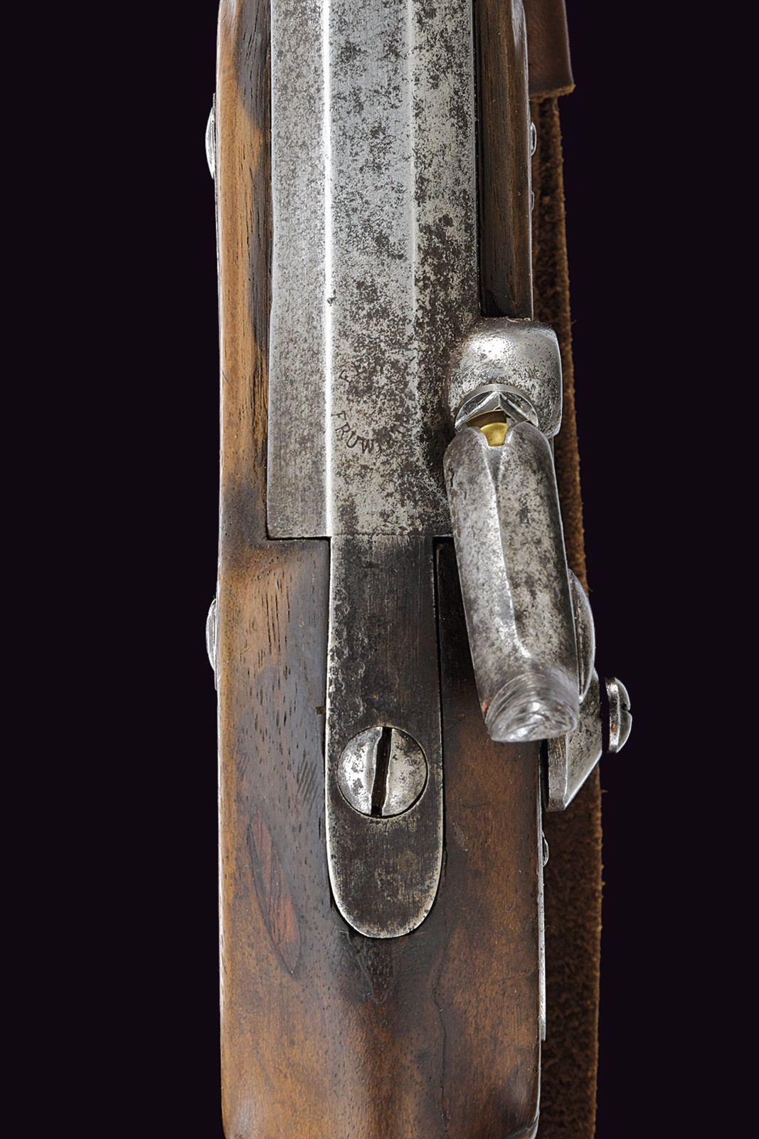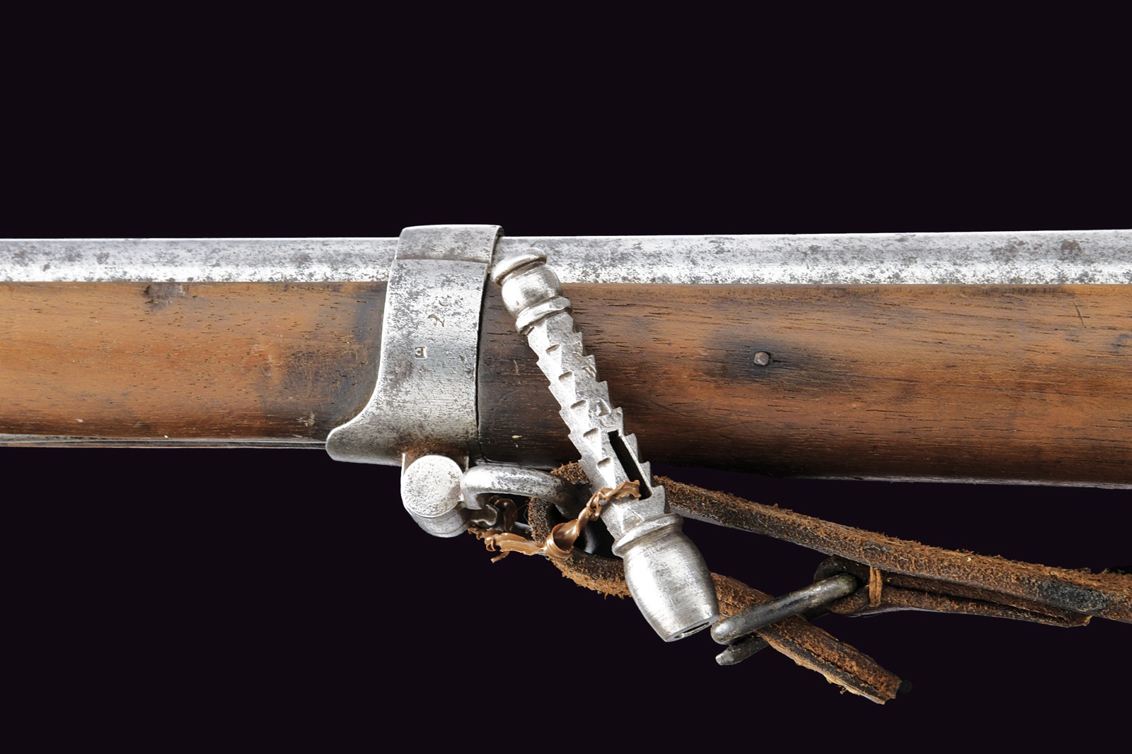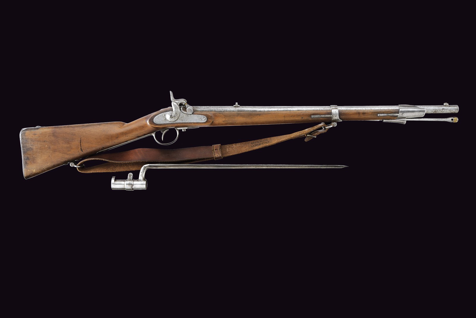 Two-stage, rifled, 14 mm cal. barrel (no longer visible rifling): octagonal at the first part, signed “FERD. FRUWIRTH” and featuring various marks on the right side, with fixed rear sight; then round with foresight that also serves as a clutch for the bayonet. Smooth browned tang. Percussion forward spring lock. Wooden full stock with iron mounts, ramrod and bayonet. Leather strap.