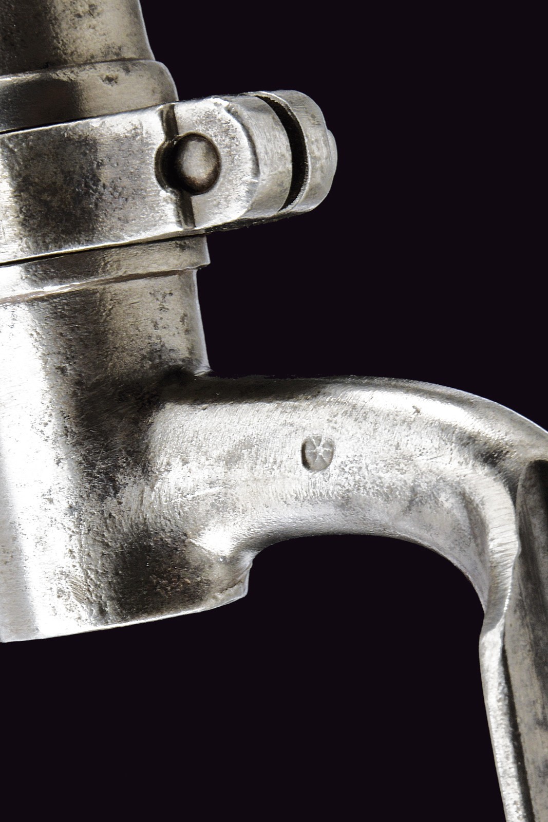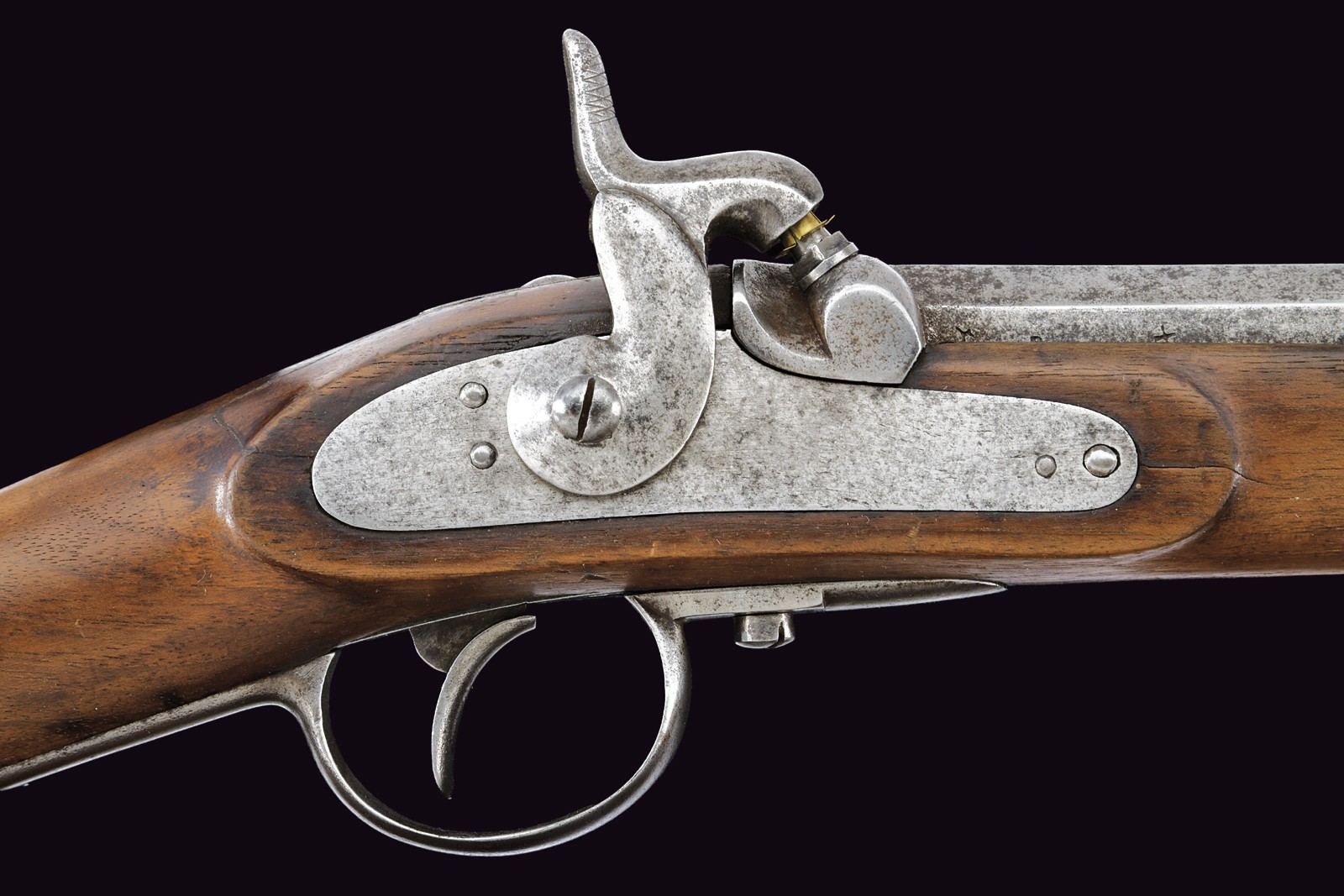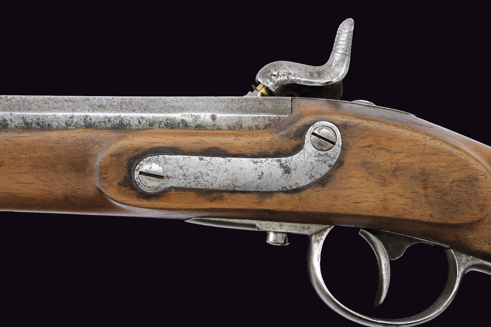 Two-stage, rifled, 14 mm cal. barrel (no longer visible rifling): octagonal at the first part, signed “FERD. FRUWIRTH” and featuring various marks on the right side, with fixed rear sight; then round with foresight that also serves as a clutch for the bayonet. Smooth browned tang. Percussion forward spring lock. Wooden full stock with iron mounts, ramrod and bayonet. Leather strap.