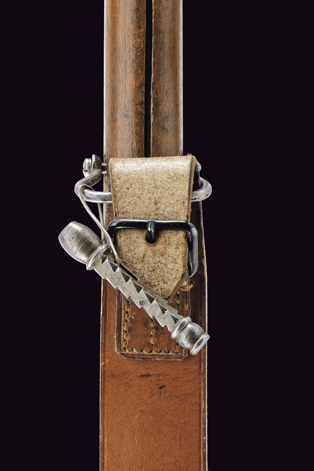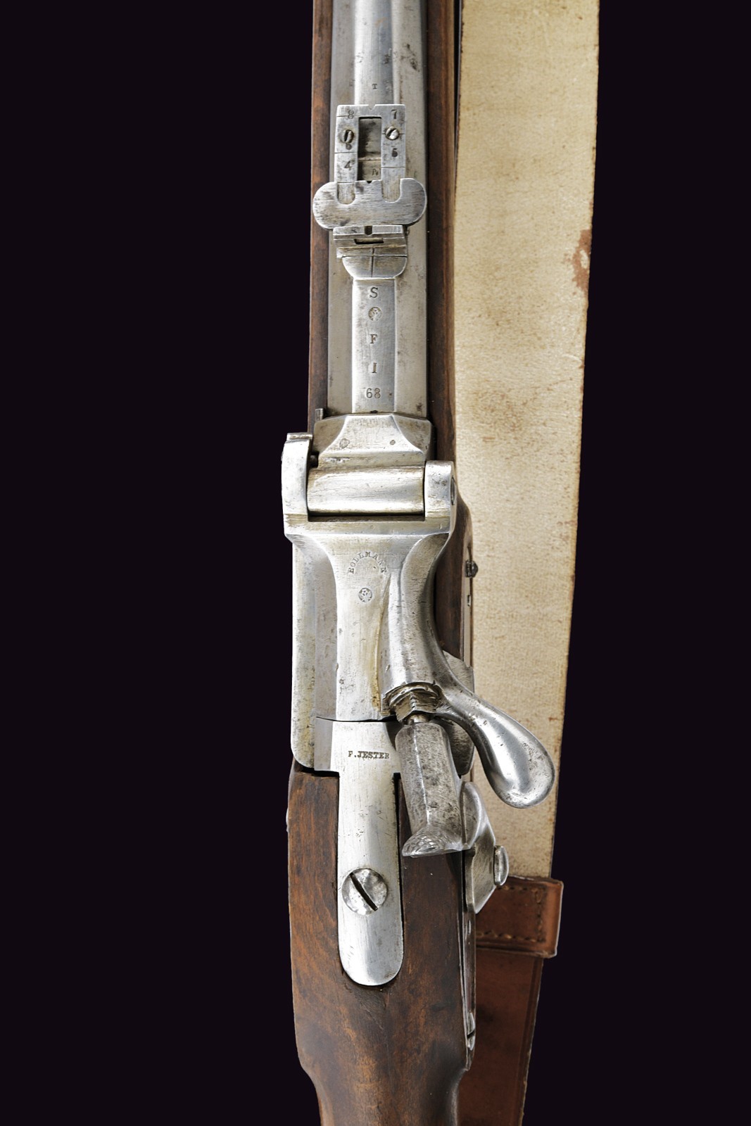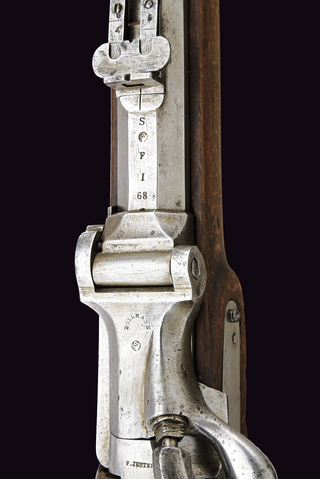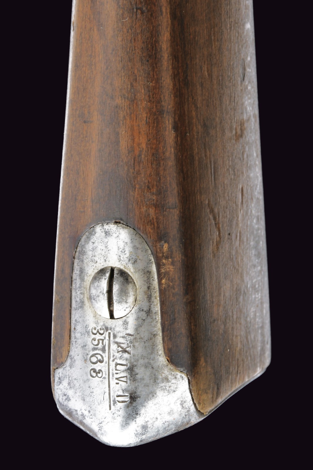 Rifled (clean bore, clearly visible rifling), two-stage, 13.9 mm cal. barrel, octagonal at the base then round; marked "68", "i", "F", "S", "T" at the base and with an imperial mark; adjustable rear sight, foresight. Typical Bolt-action mechanism marked "BOLLMANN" and featuring an imperial mark; forward spring lock dated "863" and with imperial eagle. Wooden full stock with iron mounts and ramrod. Buttplate stamped "X. L.V.D. 3568." With leather strap and cartridge extractors which have to be screwed on the ramrod to clean the barrel.