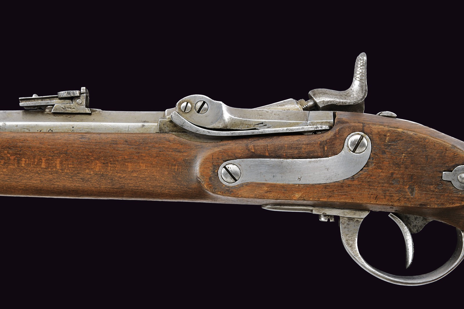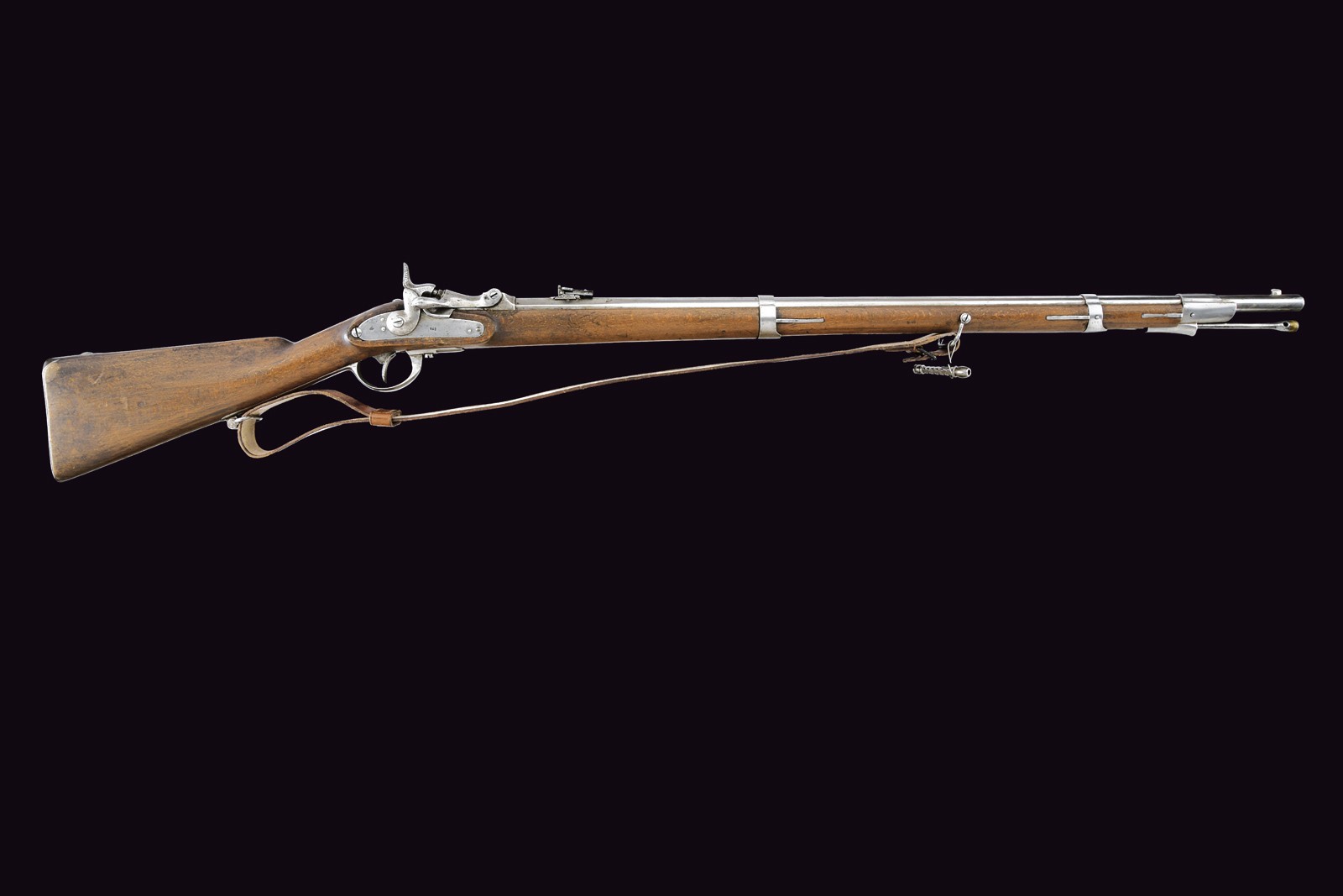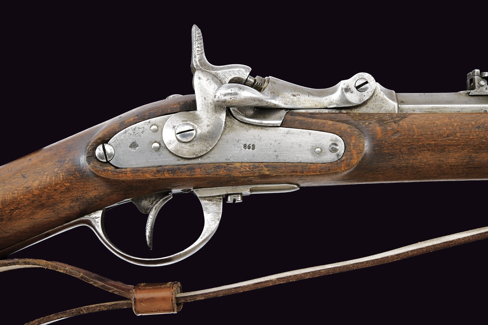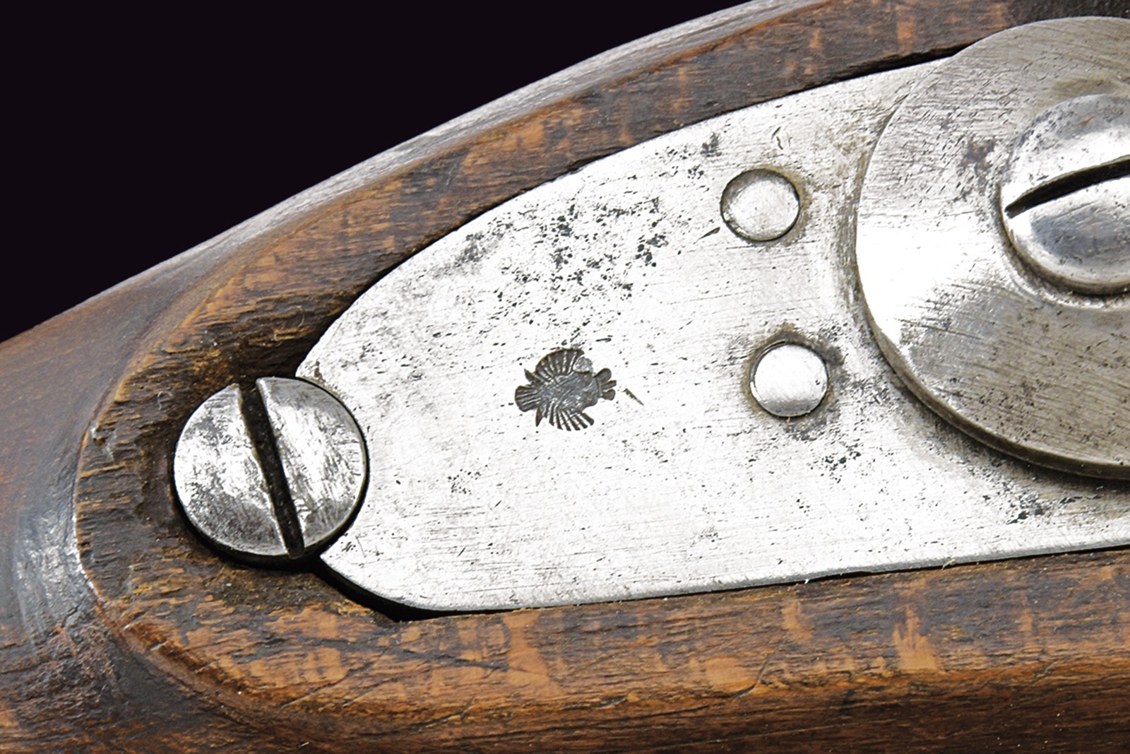 Rifled (clean bore, clearly visible rifling), two-stage, 13.9 mm cal. barrel, octagonal at the base then round; marked "68", "i", "F", "S", "T" at the base and with an imperial mark; adjustable rear sight, foresight. Typical Bolt-action mechanism marked "BOLLMANN" and featuring an imperial mark; forward spring lock dated "863" and with imperial eagle. Wooden full stock with iron mounts and ramrod. Buttplate stamped "X. L.V.D. 3568." With leather strap and cartridge extractors which have to be screwed on the ramrod to clean the barrel.