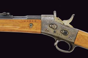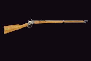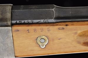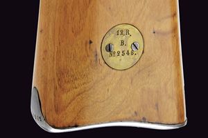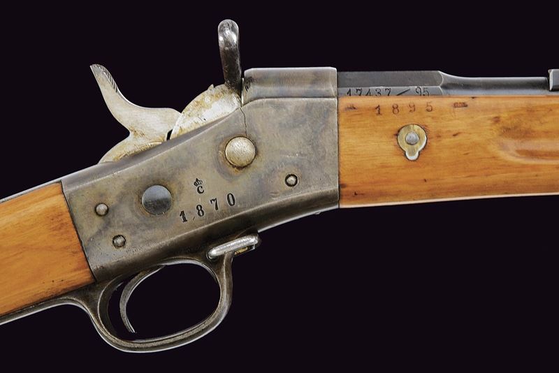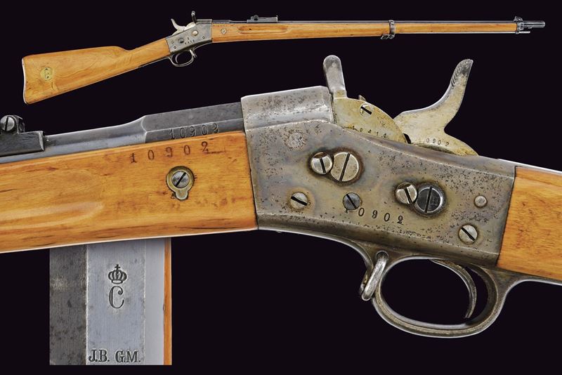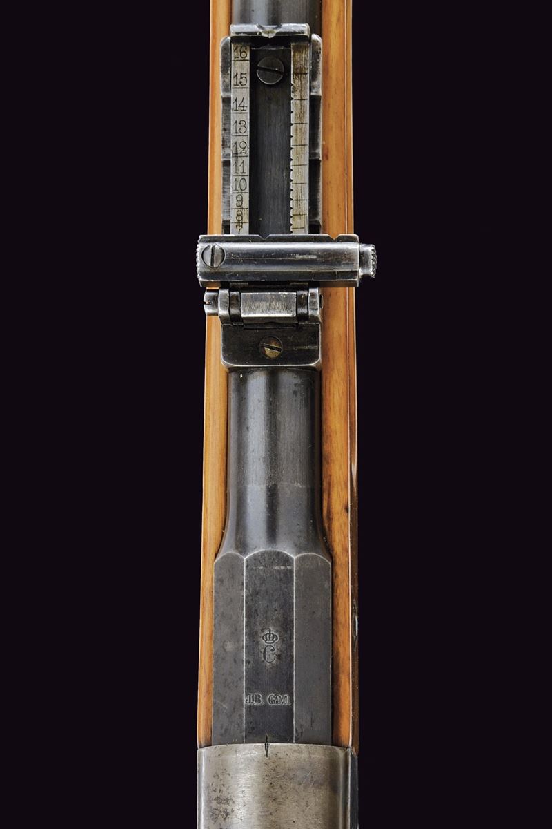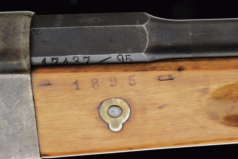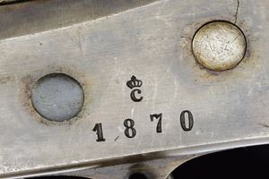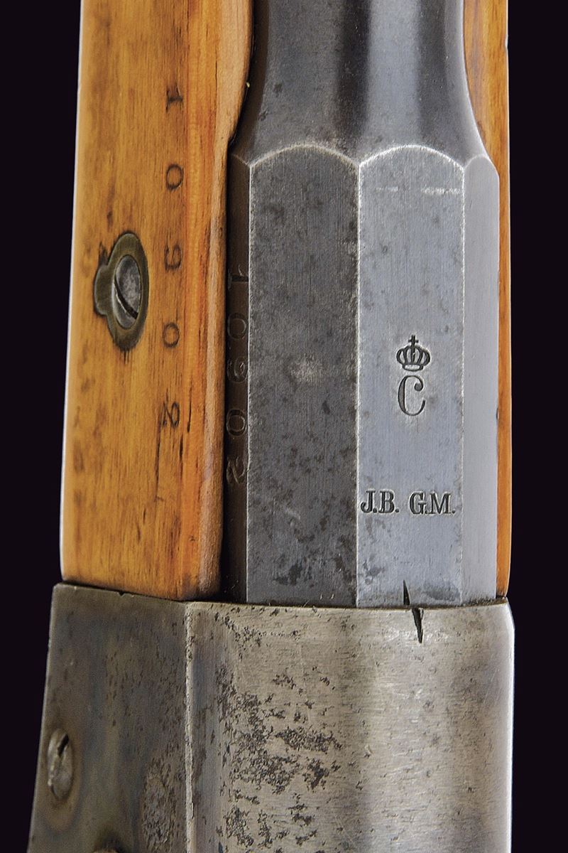 Round, rifled barrel (clean bore, clearly visible rifling), marked at the base with "C" under a crown, "J.B", “GM”, with serial number "10xxx" and other numbers, with foldaway and adjustable rear sight, clutch for the bayonet and foresight, 8 mm cal. at the nozzle. Frame with crowned “C”, date “1870”, serial numbers on various matching components (different from the cock) on the barrel. Working mechanism. Butt and fore-end, with double fuller, made of light wood in perfect condition, featuring various numbers, matching serial numbers; on one side a brass disc marked "12R. B. N 2546.". Iron mounts and ramrod.