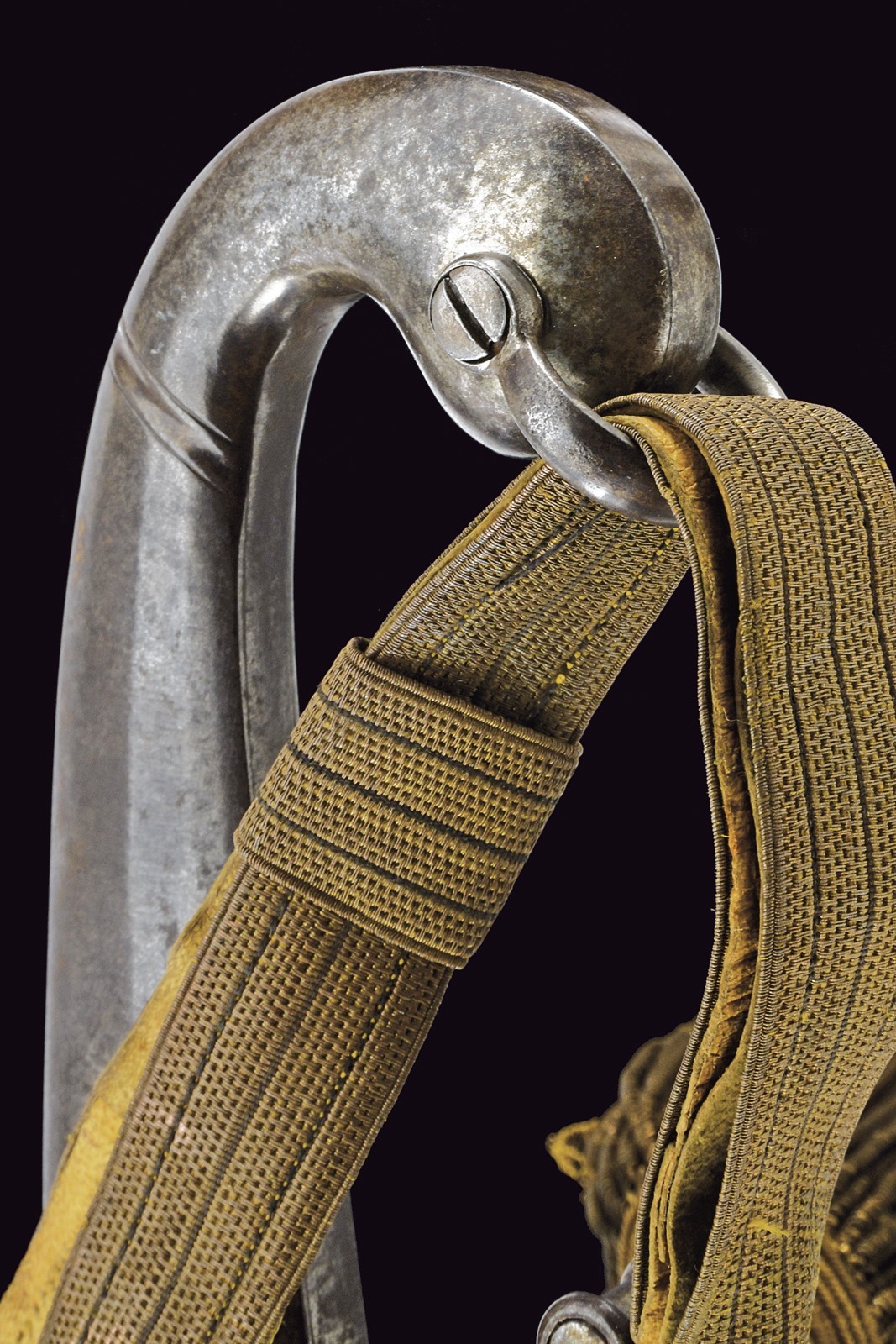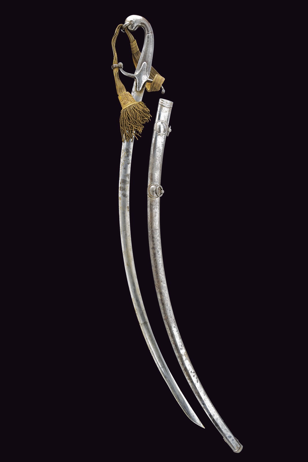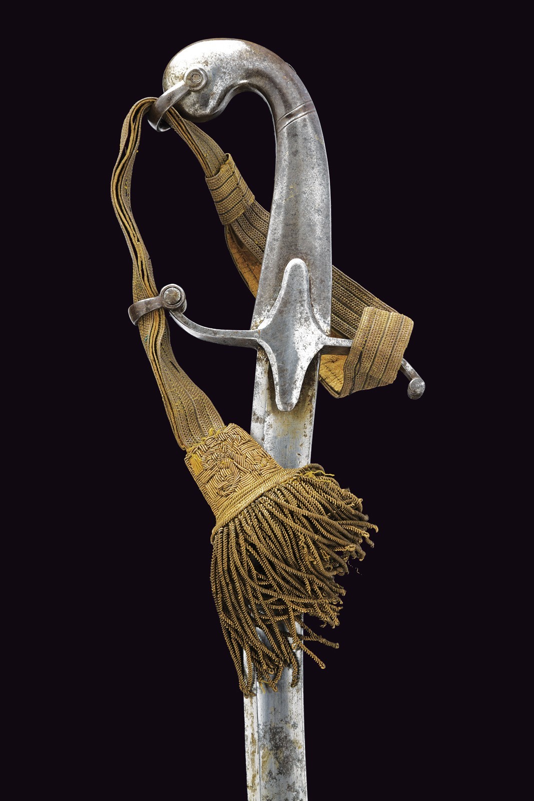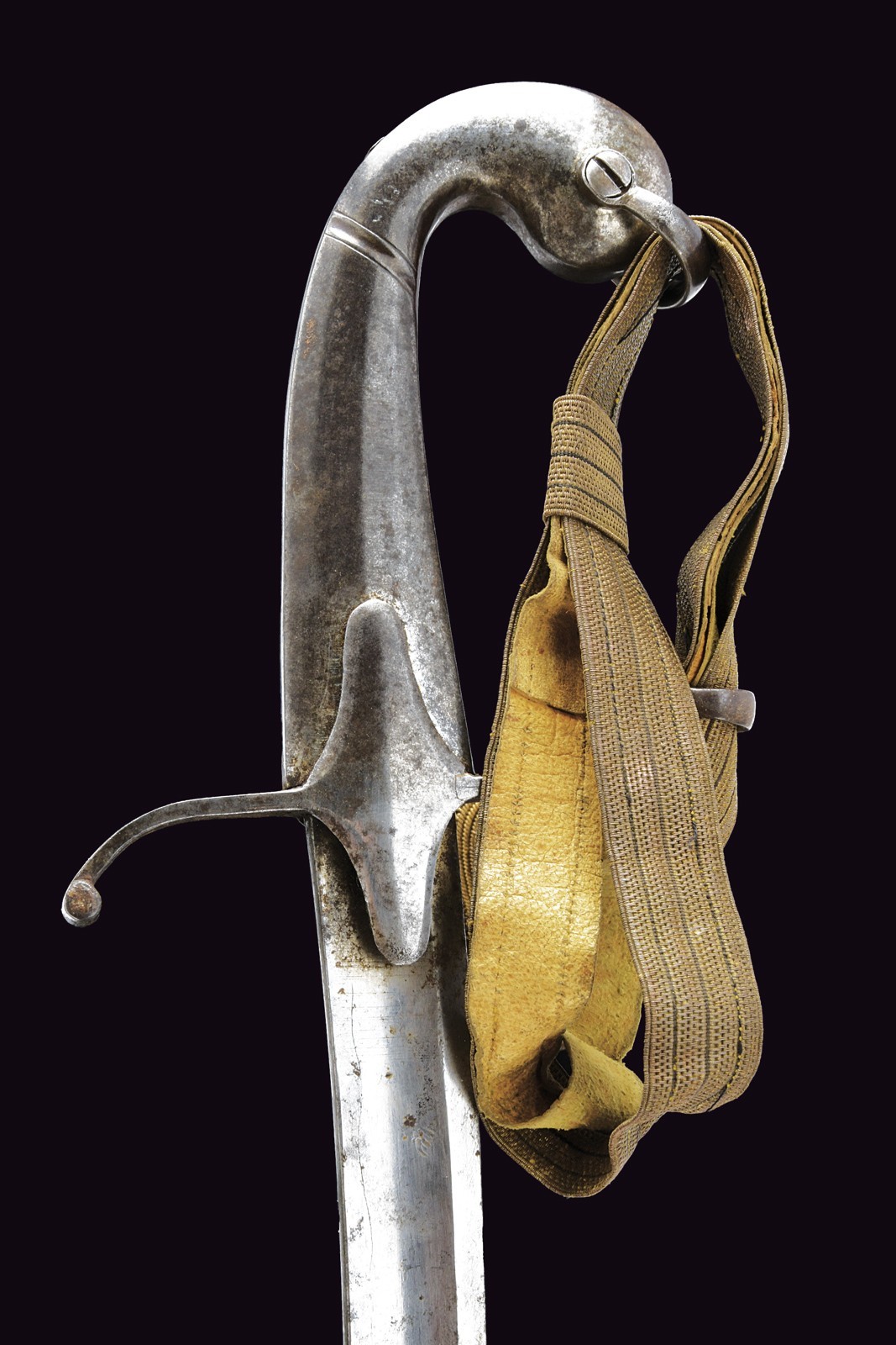 Curved, single-and-false-edged blade, with wide central fuller, oriental-style, strong, iron hilt with S-shaped quillon and angled pommel. Beautiful officer's sword knot, complete with iron scabbard with two suspension rings on round, domed bands.