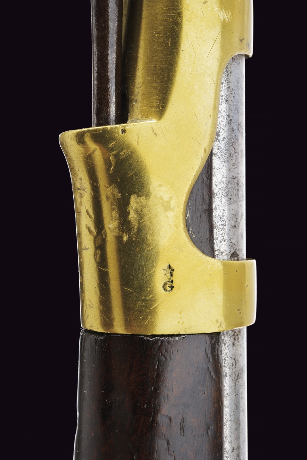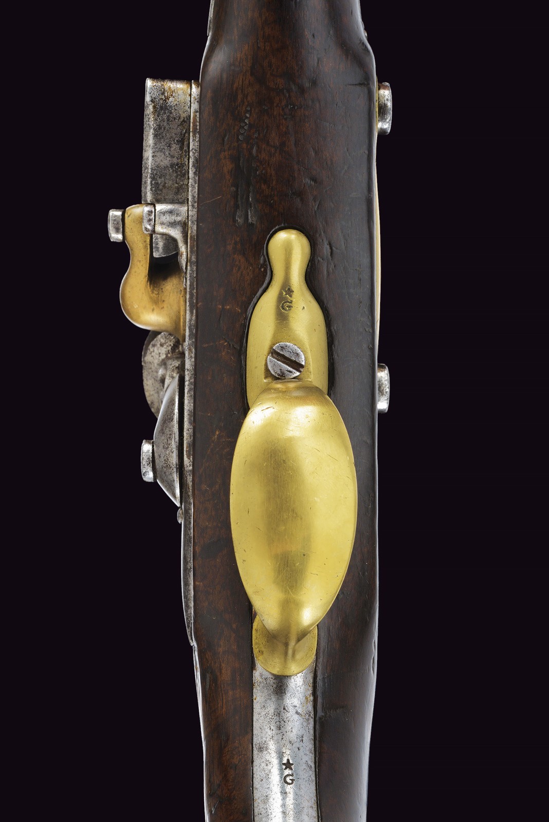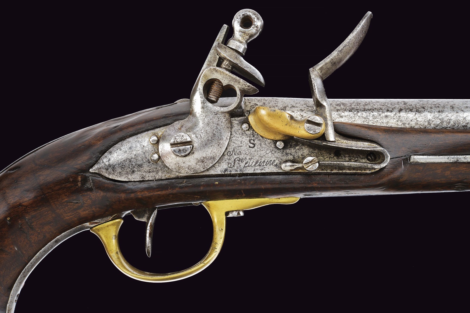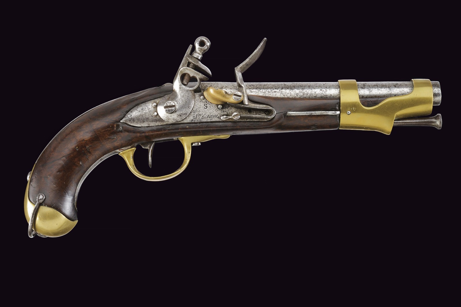 Round, smoothbore barrel with octagonal breech, bearing a non-legible mark; 18 mm cal at the nozzle. Flintlock marked with remnants of the St. Etienne manufactory and stamped “S”; brass pan. Working mechanism. Wooden full stock. Iron parts with some pitting. Brass mounts. Trigger guard, buttplate, muzzle ring and counter plate stamped with a star “G.” Iron ramrod.