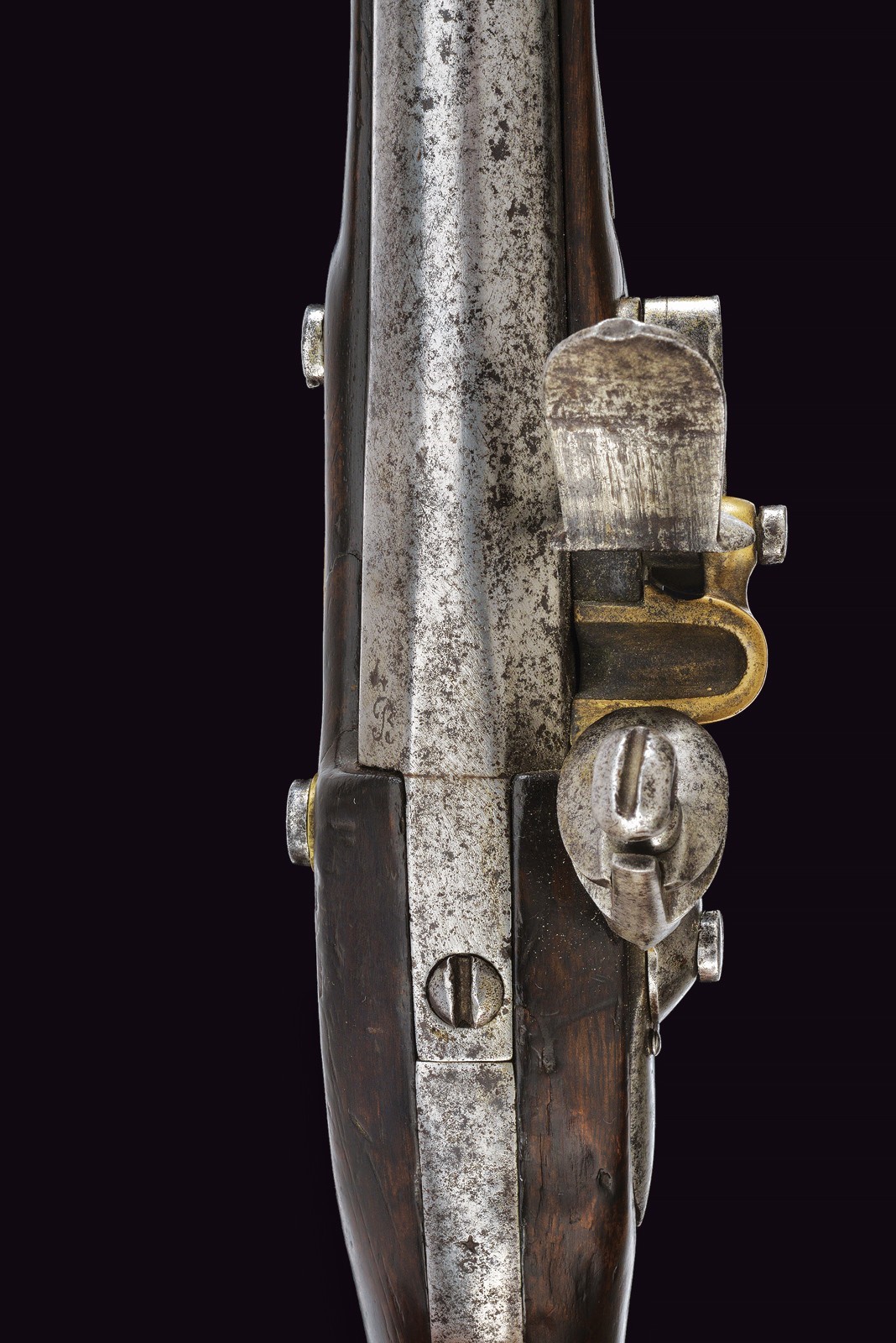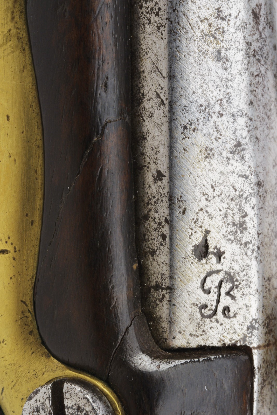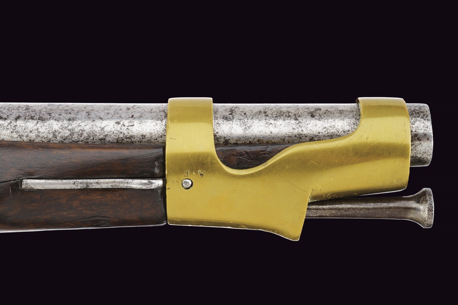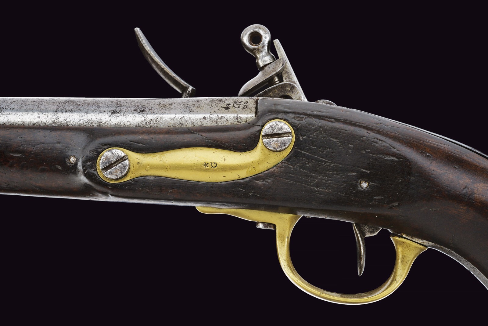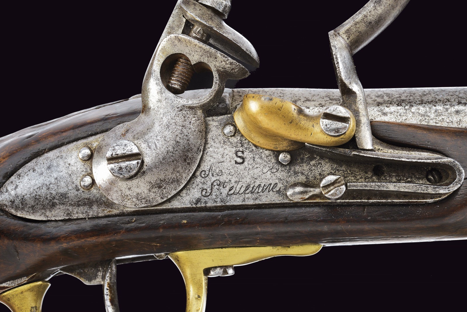 Round, smoothbore barrel with octagonal breech, bearing a non-legible mark; 18 mm cal at the nozzle. Flintlock marked with remnants of the St. Etienne manufactory and stamped “S”; brass pan. Working mechanism. Wooden full stock. Iron parts with some pitting. Brass mounts. Trigger guard, buttplate, muzzle ring and counter plate stamped with a star “G.” Iron ramrod.