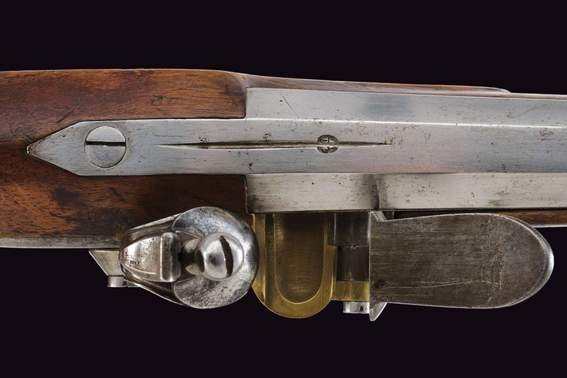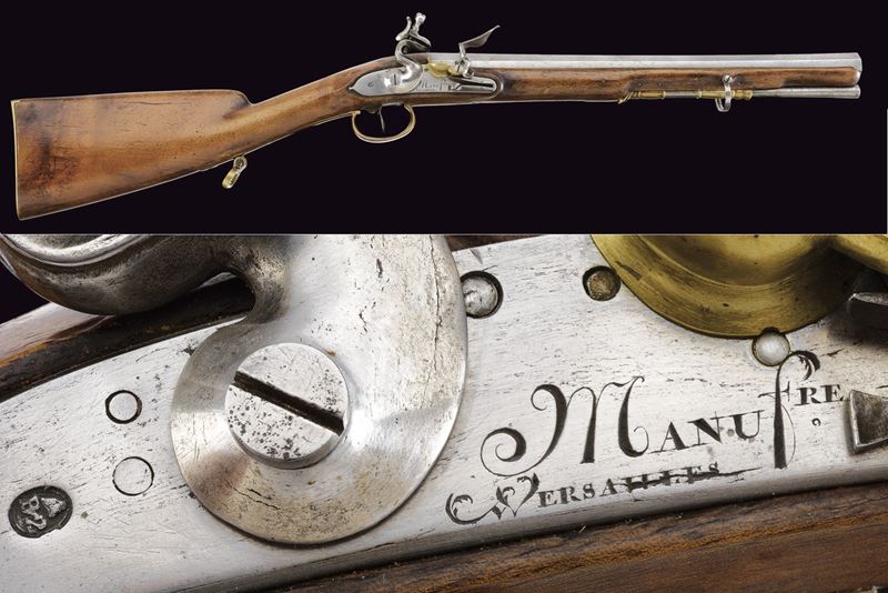 Short, solid, octagonal, rifled, 15 mm cal barrel (bore with slight encrustations, clearly visible rifling), mark on the chamber, ‘RF’ marking and short groove, the latter also found on the nozzle. Flintlock, plate marked ‘MANUF.RE VERSAILLES’ (a scratch on the second word); mark on the tang, brass pan, working mechanism. Wooden full stock with brass mounts and iron ramrod.