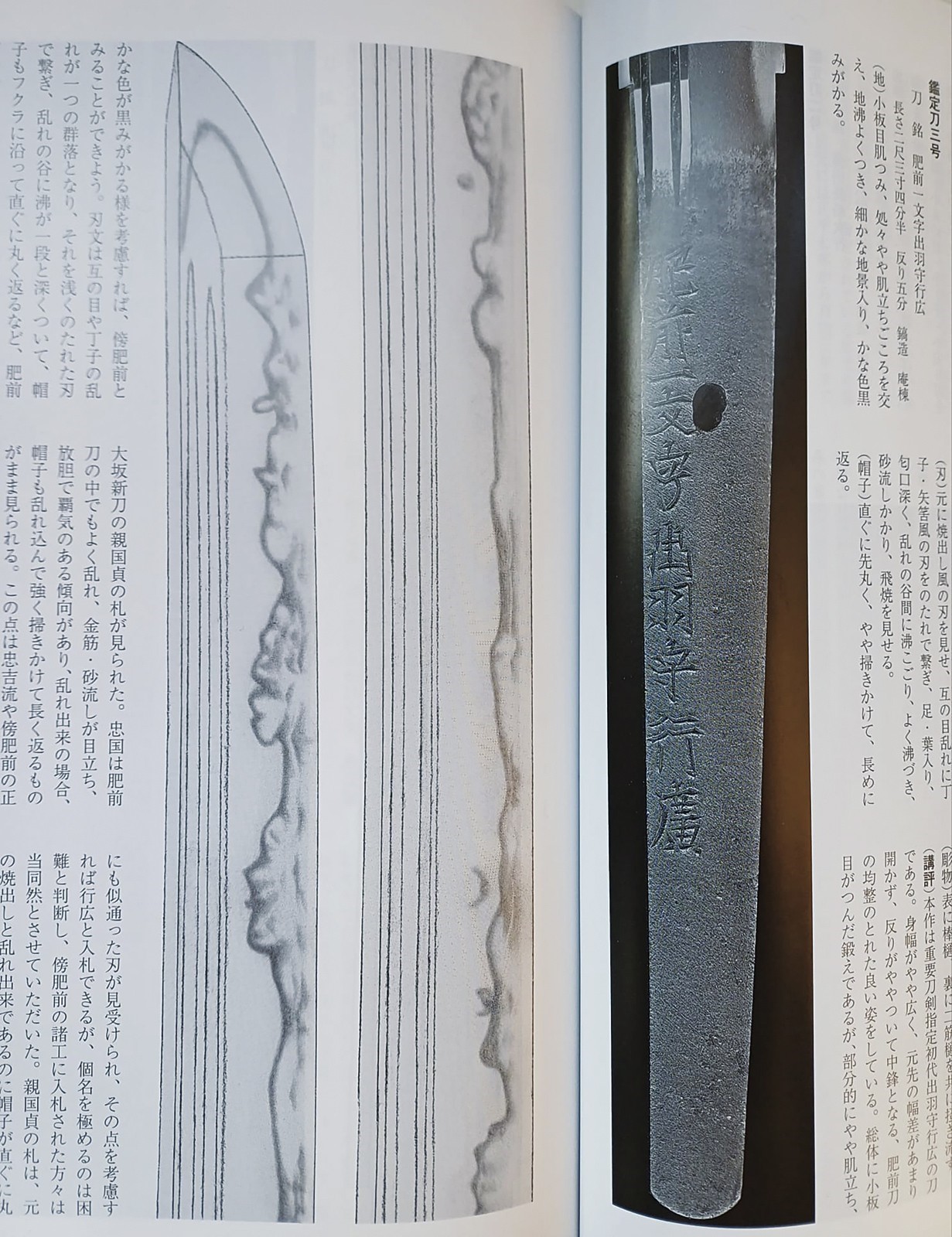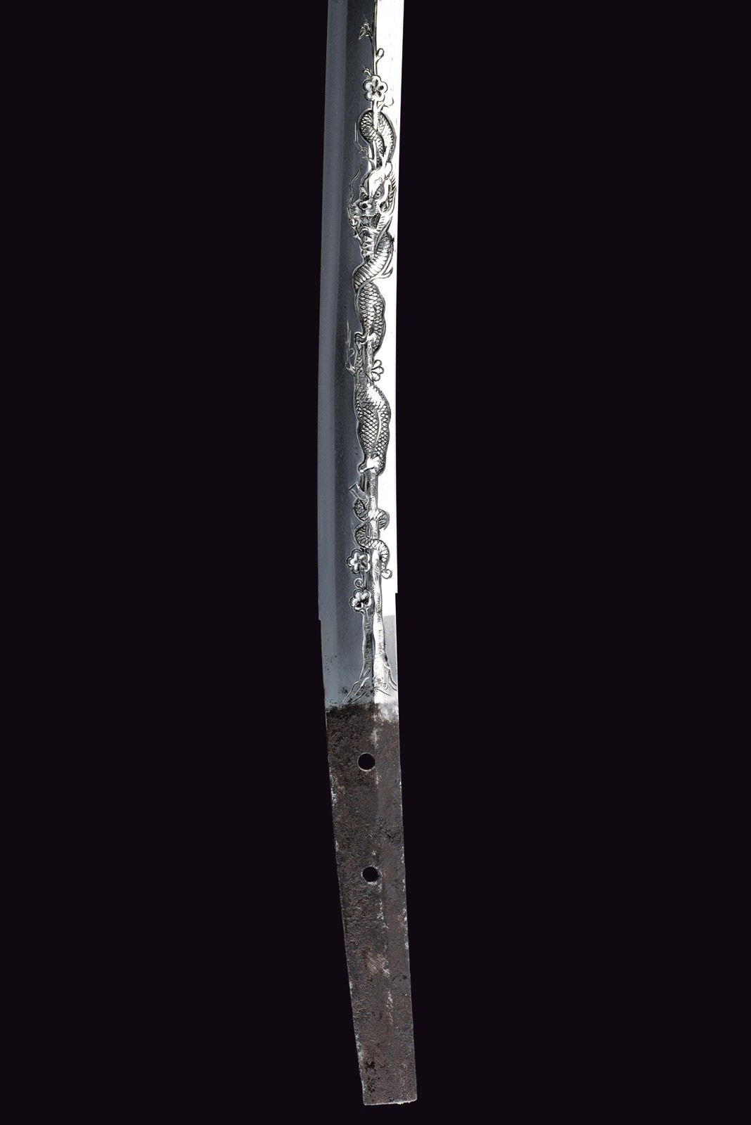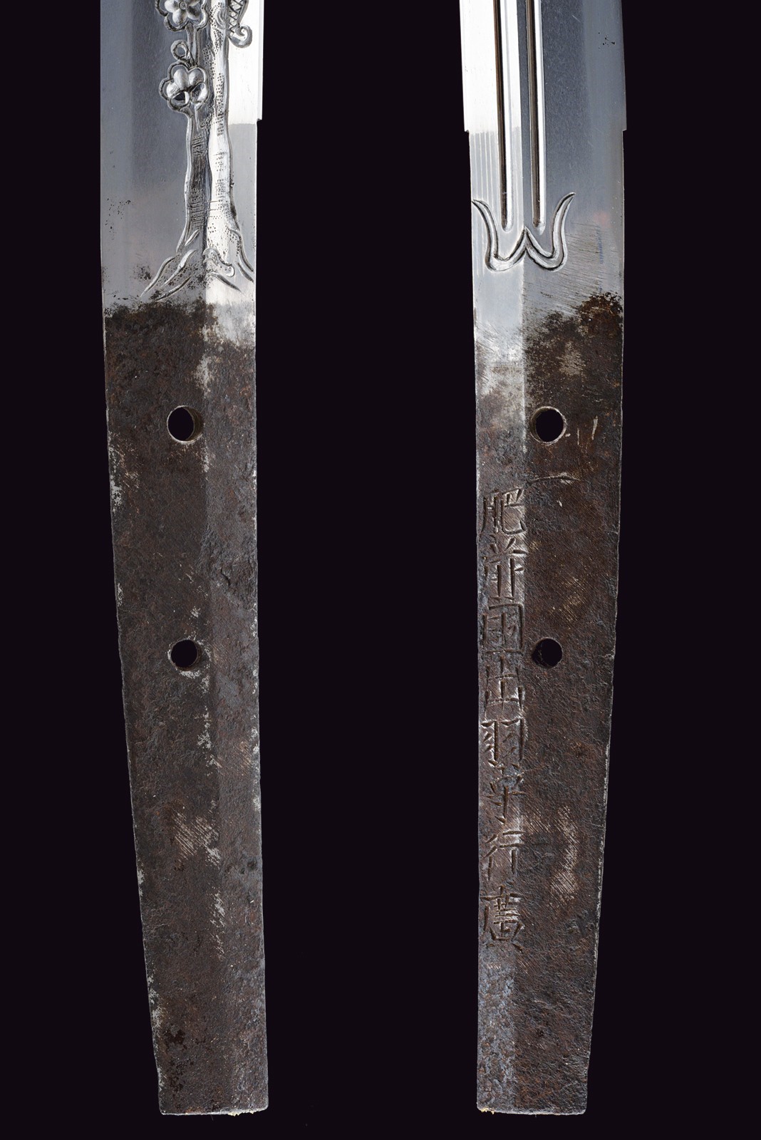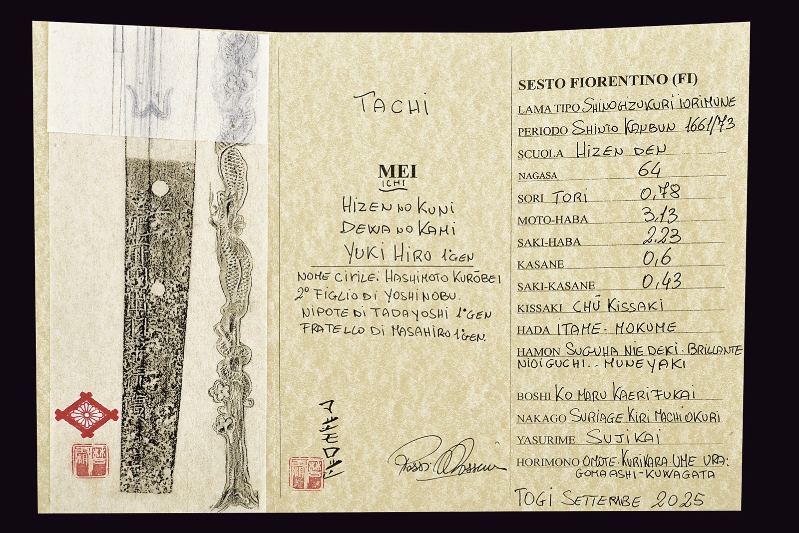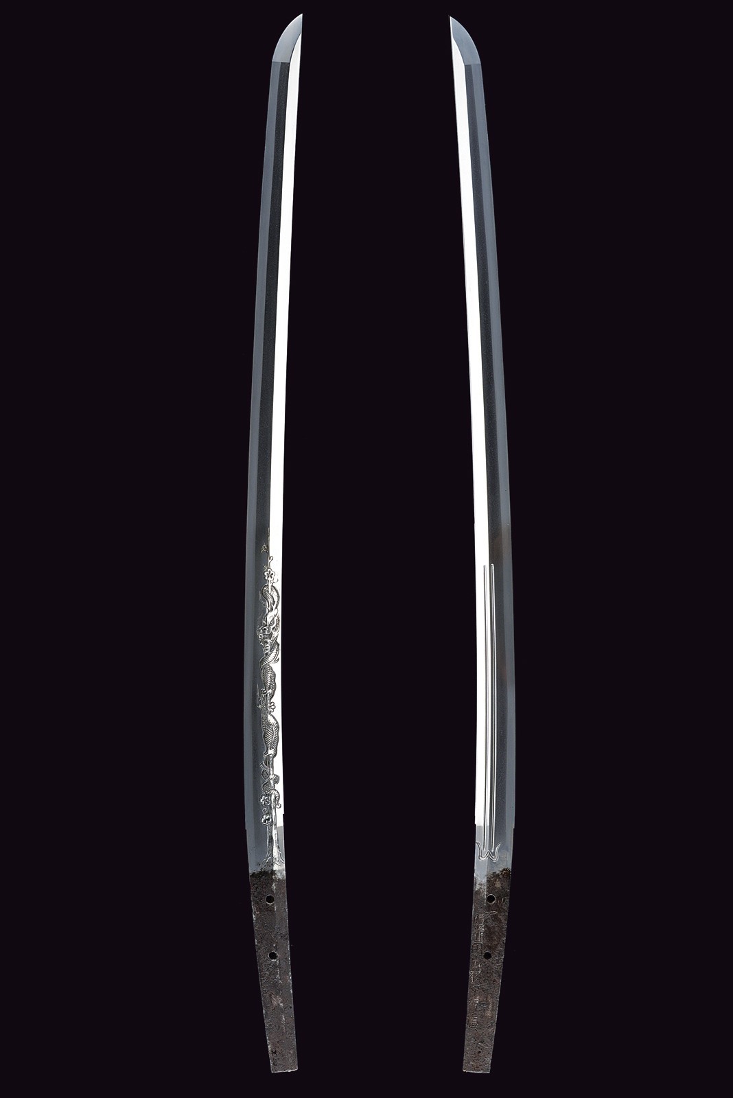 Blade of shinogi-zukuri shape with iorimune back, length 64 cm (nagasa), forged in a fine itame-mokume hada. The hamon is a brilliant suguha nie-deki with a well-defined nioi-guchi and traces of muneyaki; chū-kissaki, boshi ko-maru with deep kaeri. On the omote is a horimono of Kurikara, the dragon entwined around the sword of Fudō Myō-ō; the ura bears Goma-ashi (vertical Buddhist purification lines) and a Kuwagata motif (horn- or claw-shaped ornament). Brass habaki. Nakago suriage kiri machi-okuri, with yasurime sujikai and two mekugi-ana. Signed Hizen no Kuni Dewa no Kami Yukihiro 肥前国出羽守行広.