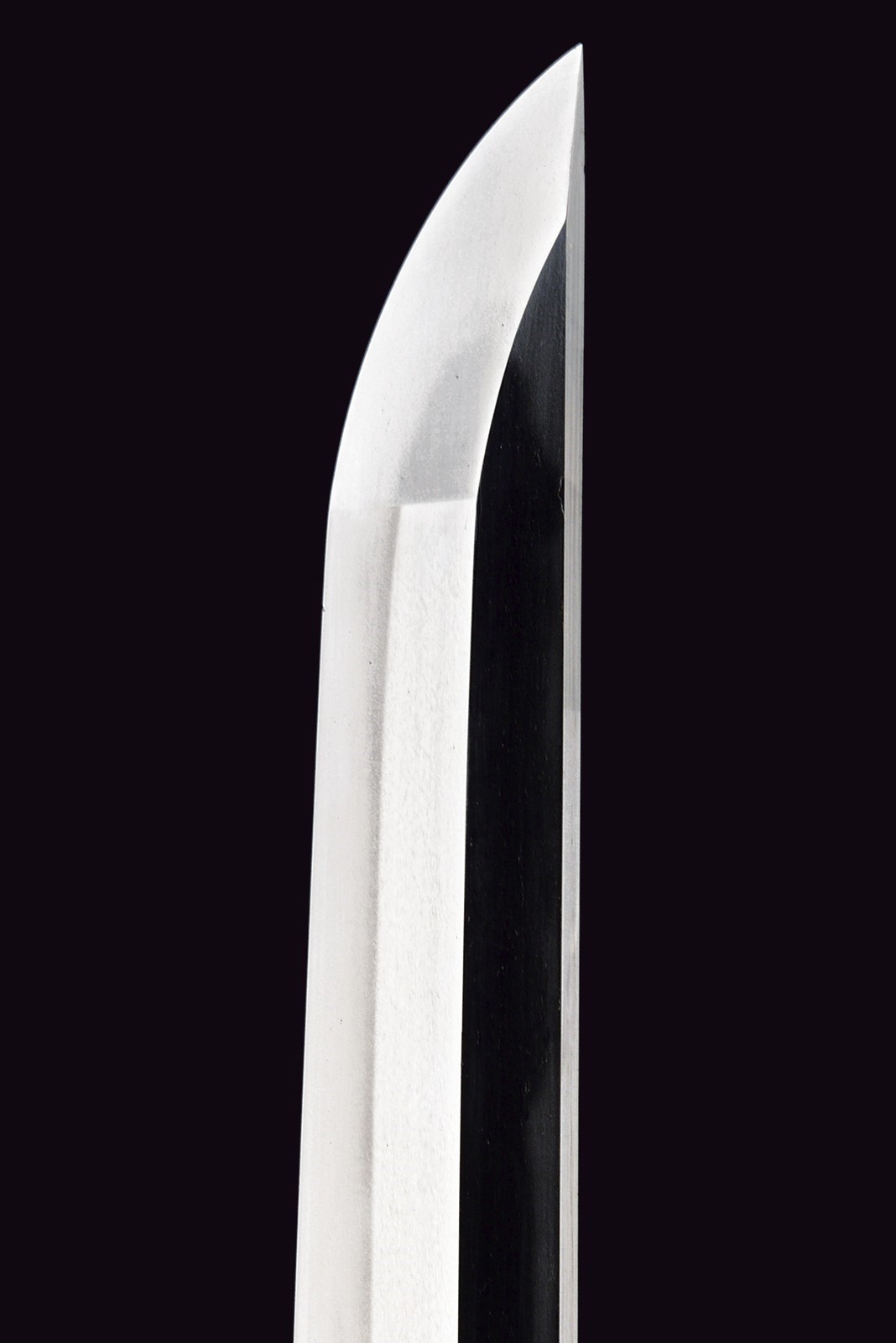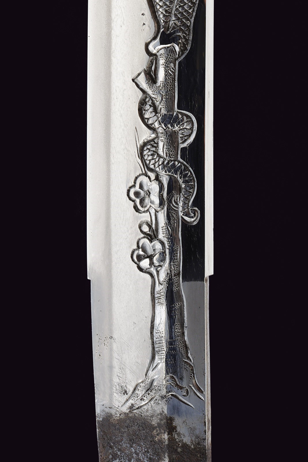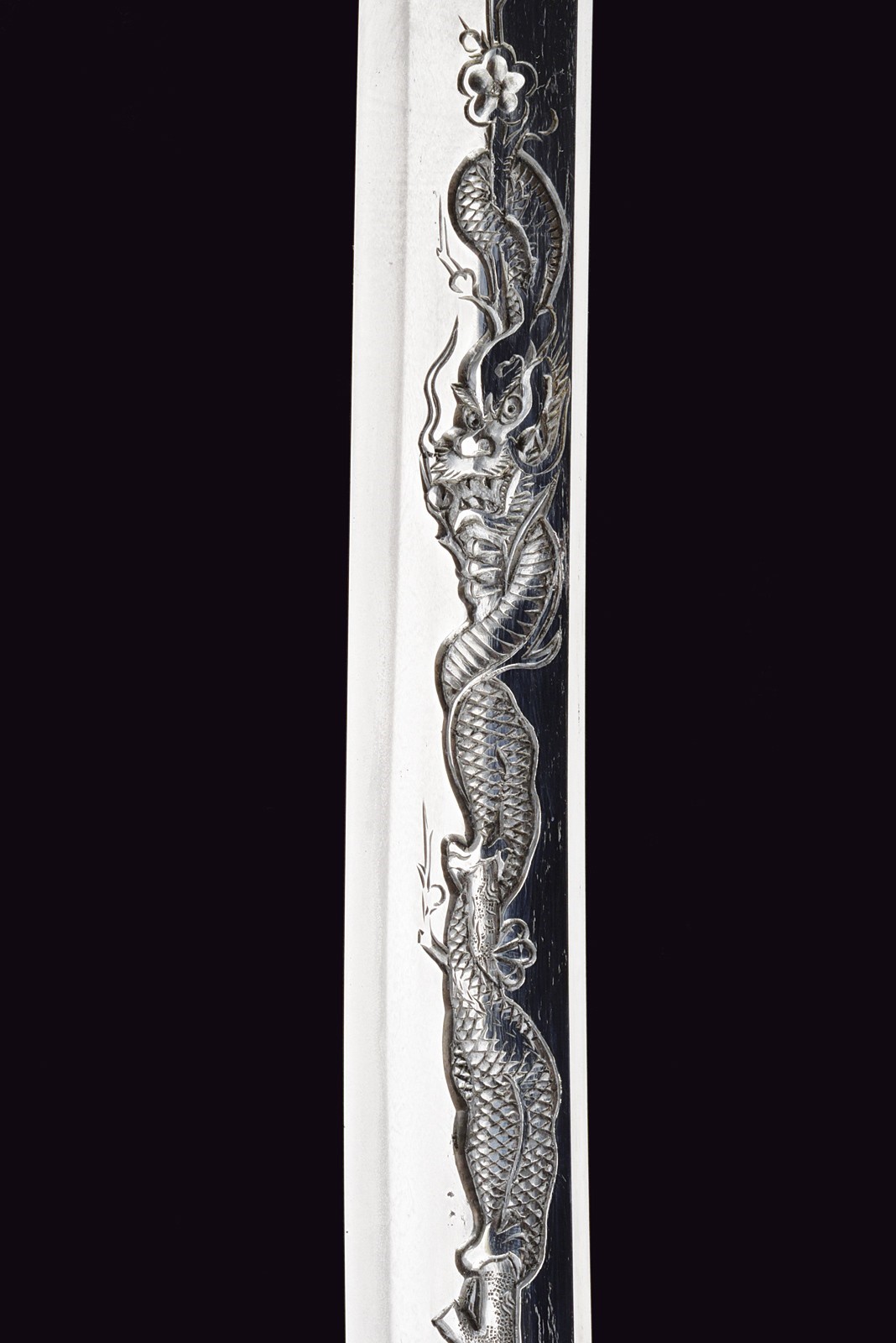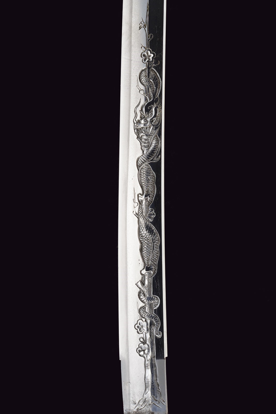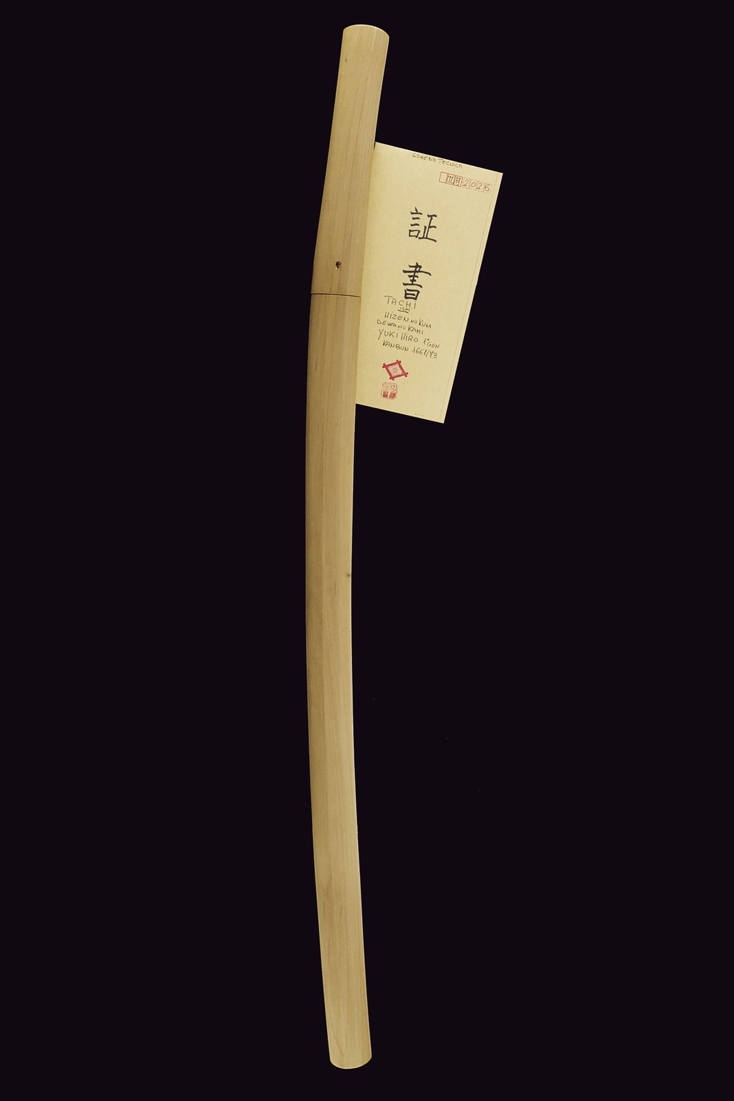 Blade of shinogi-zukuri shape with iorimune back, length 64 cm (nagasa), forged in a fine itame-mokume hada. The hamon is a brilliant suguha nie-deki with a well-defined nioi-guchi and traces of muneyaki; chū-kissaki, boshi ko-maru with deep kaeri. On the omote is a horimono of Kurikara, the dragon entwined around the sword of Fudō Myō-ō; the ura bears Goma-ashi (vertical Buddhist purification lines) and a Kuwagata motif (horn- or claw-shaped ornament). Brass habaki. Nakago suriage kiri machi-okuri, with yasurime sujikai and two mekugi-ana. Signed Hizen no Kuni Dewa no Kami Yukihiro 肥前国出羽守行広.