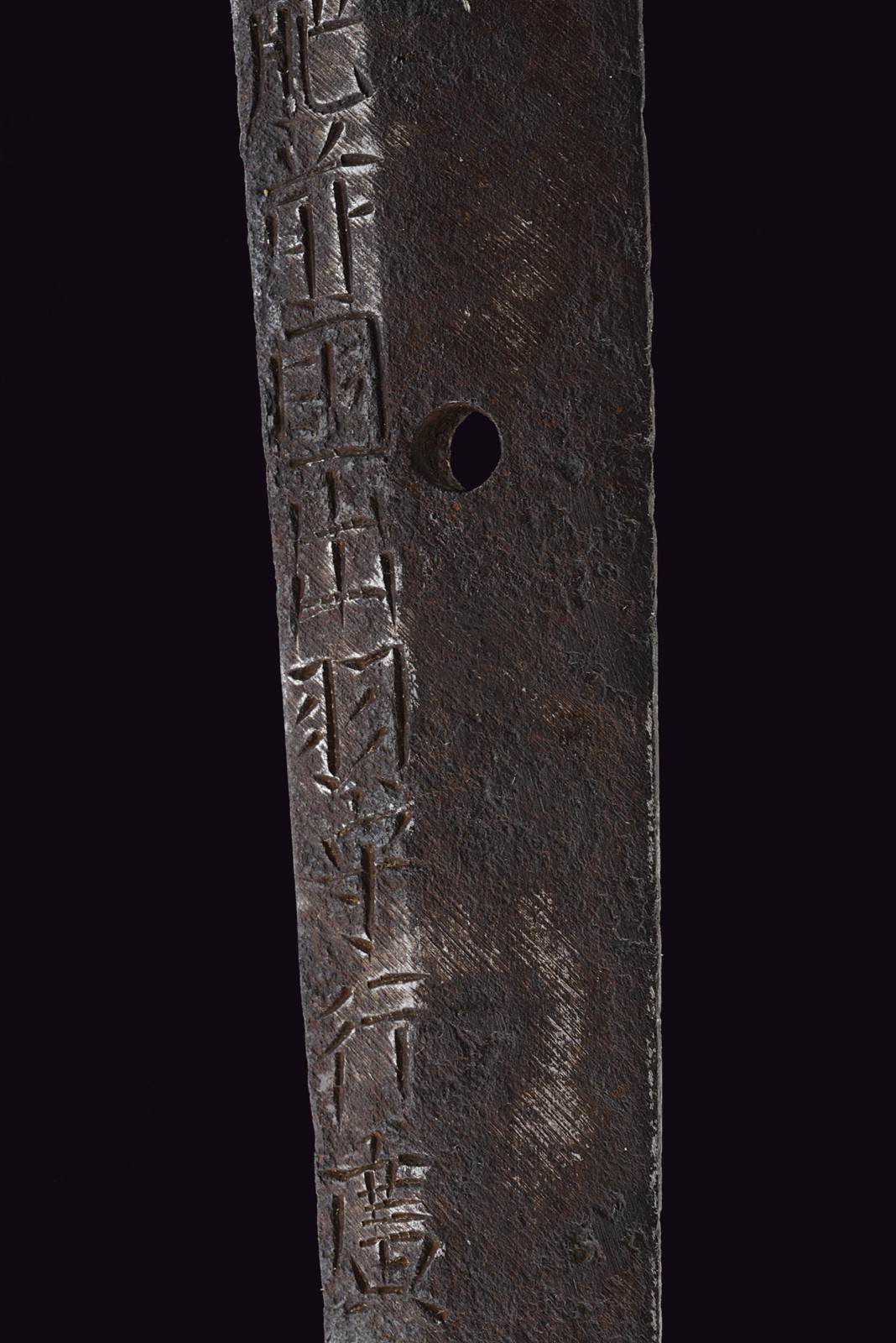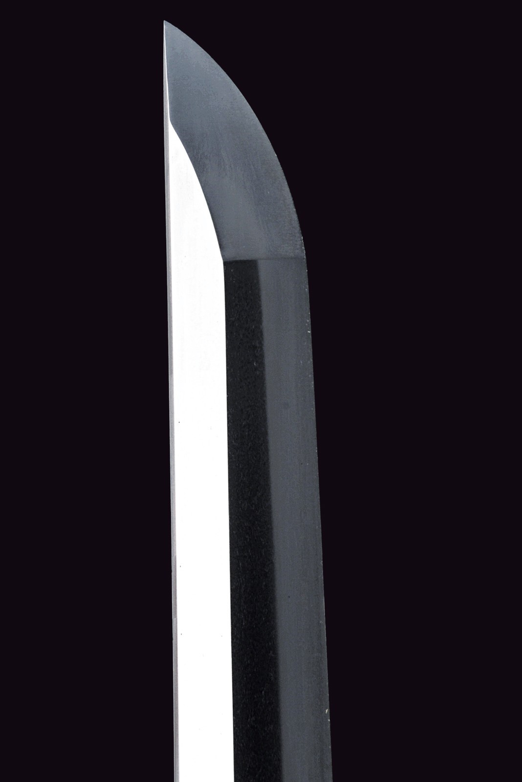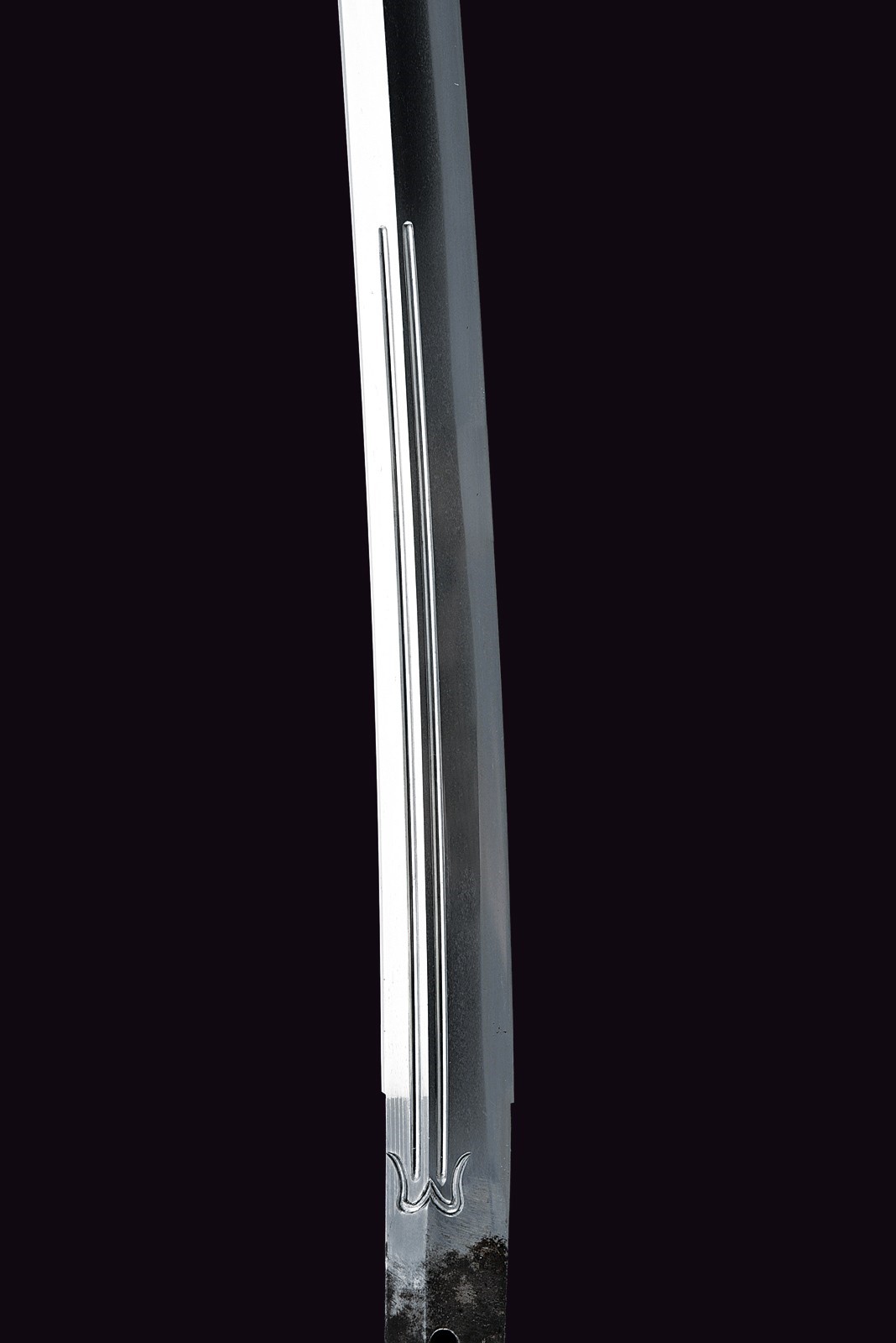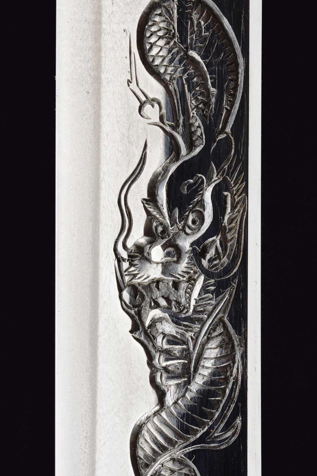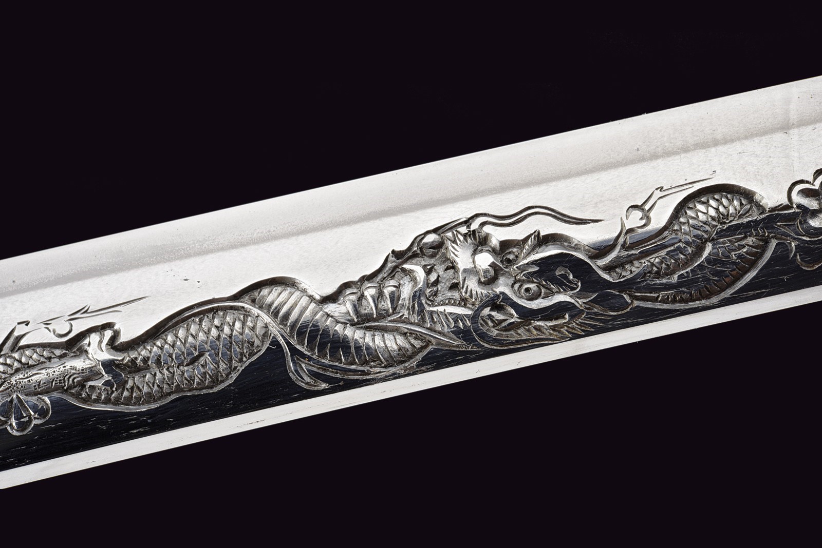 Blade of shinogi-zukuri shape with iorimune back, length 64 cm (nagasa), forged in a fine itame-mokume hada. The hamon is a brilliant suguha nie-deki with a well-defined nioi-guchi and traces of muneyaki; chū-kissaki, boshi ko-maru with deep kaeri. On the omote is a horimono of Kurikara, the dragon entwined around the sword of Fudō Myō-ō; the ura bears Goma-ashi (vertical Buddhist purification lines) and a Kuwagata motif (horn- or claw-shaped ornament). Brass habaki. Nakago suriage kiri machi-okuri, with yasurime sujikai and two mekugi-ana. Signed Hizen no Kuni Dewa no Kami Yukihiro 肥前国出羽守行広.