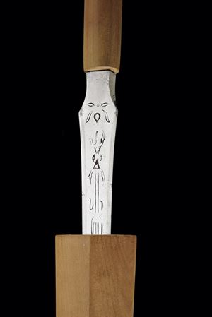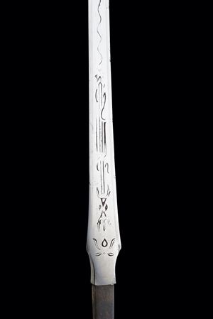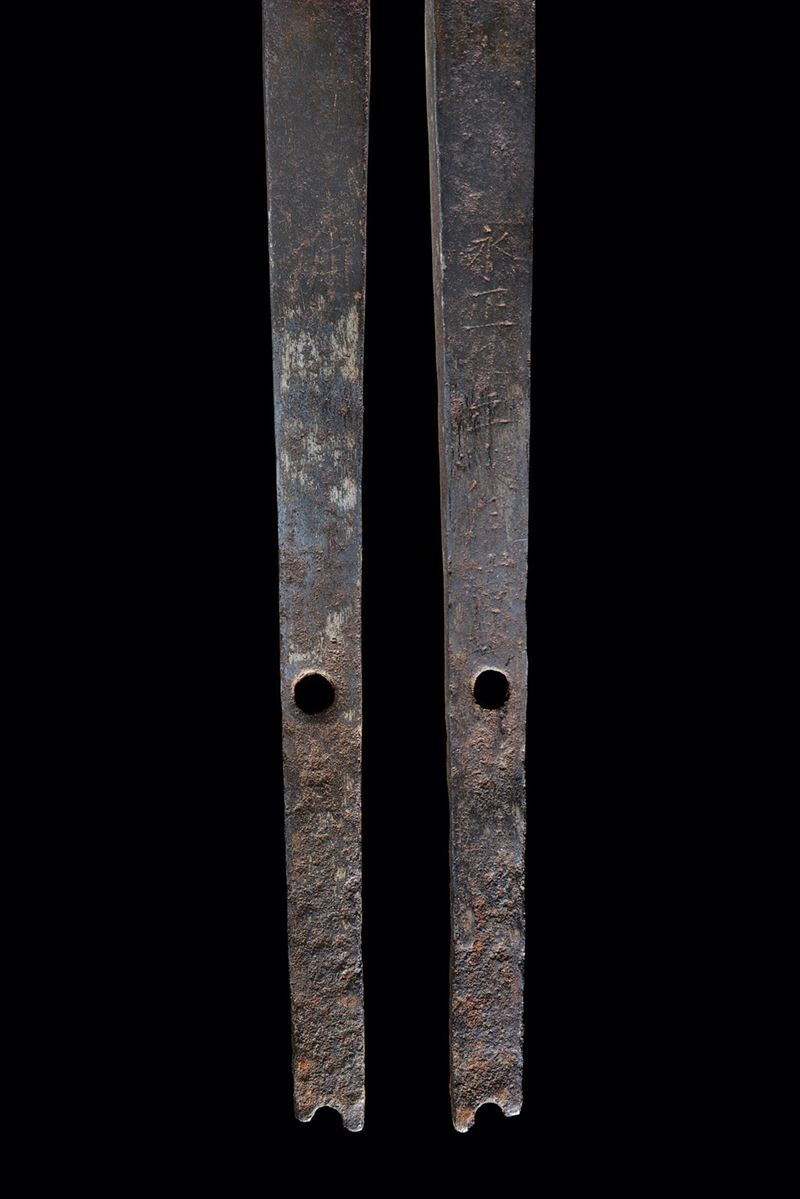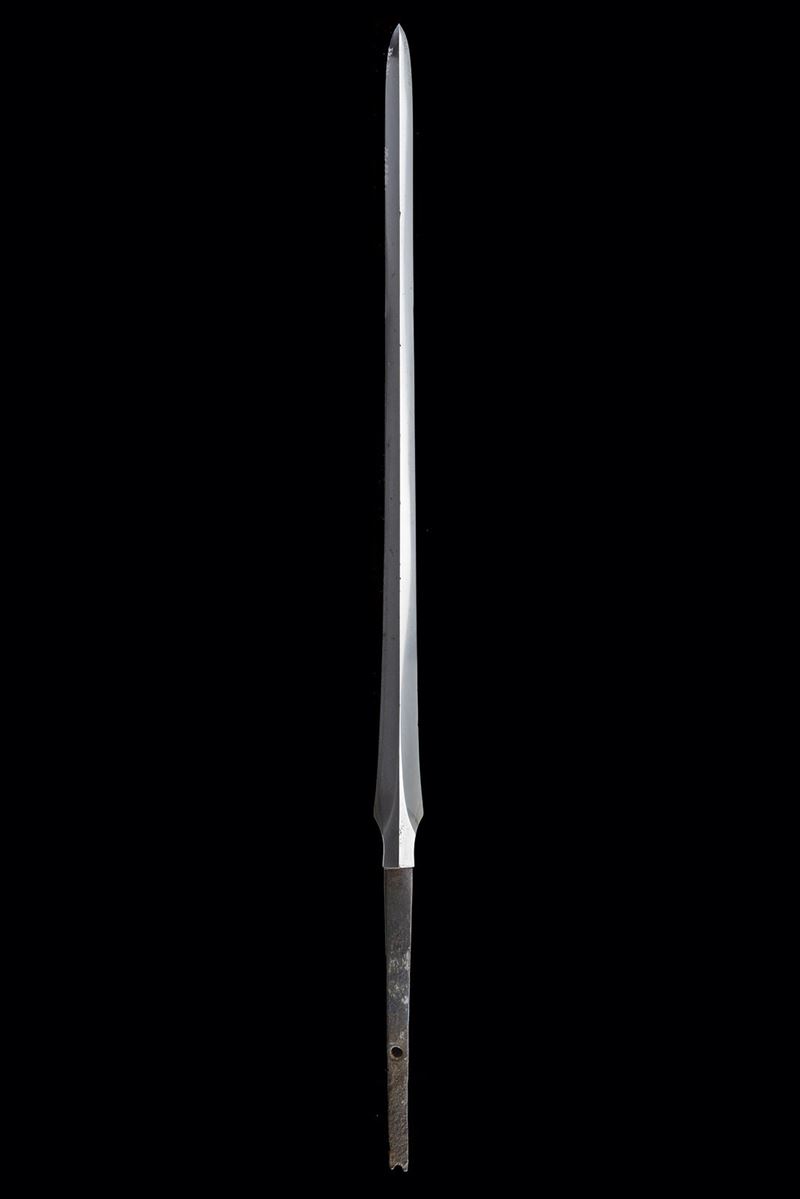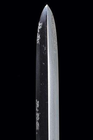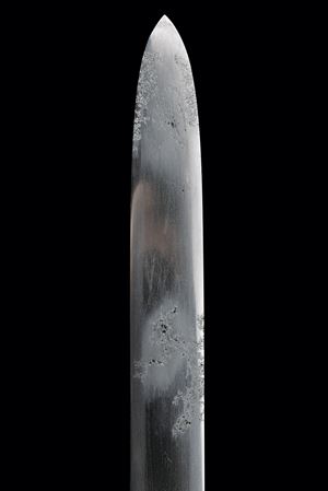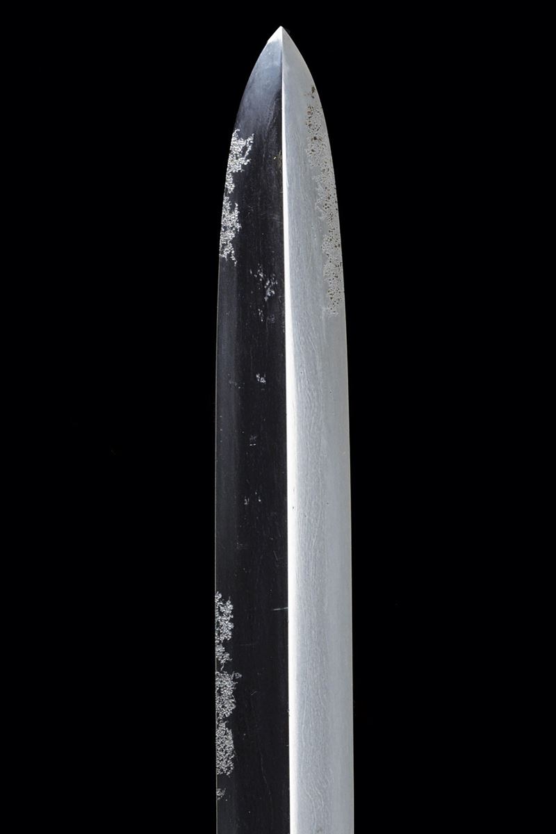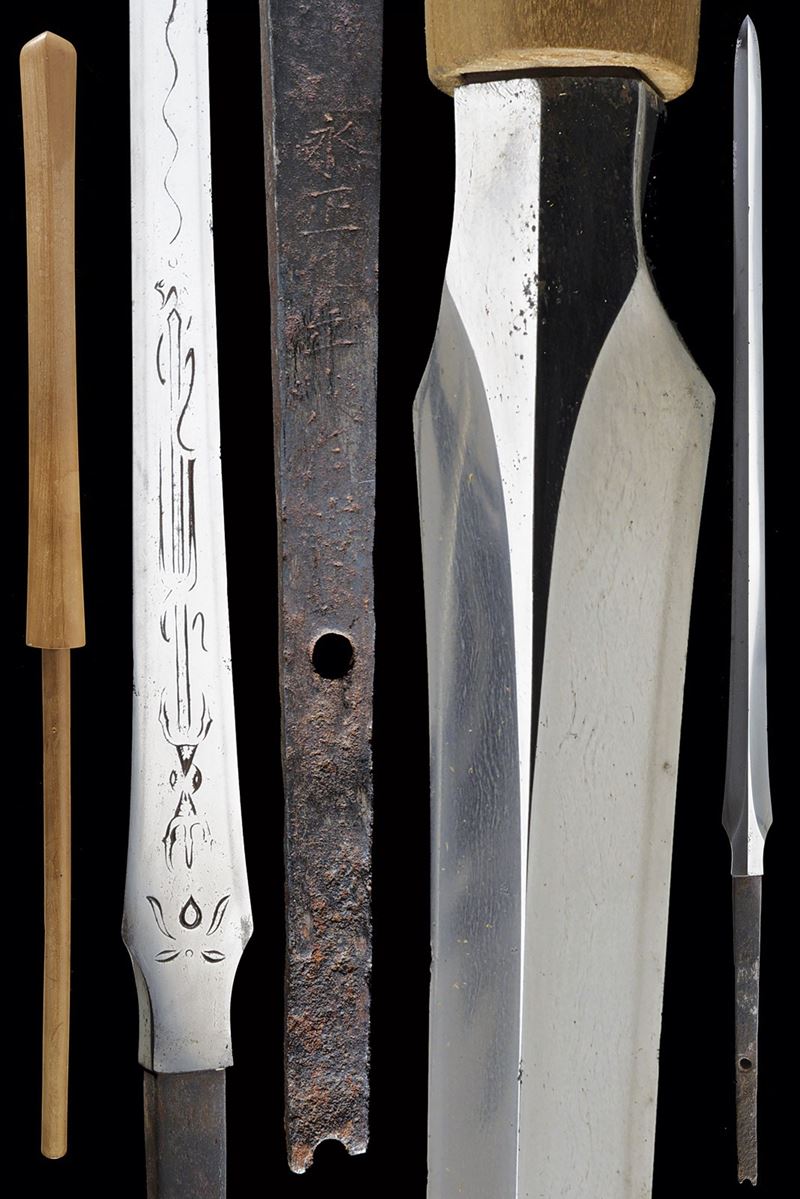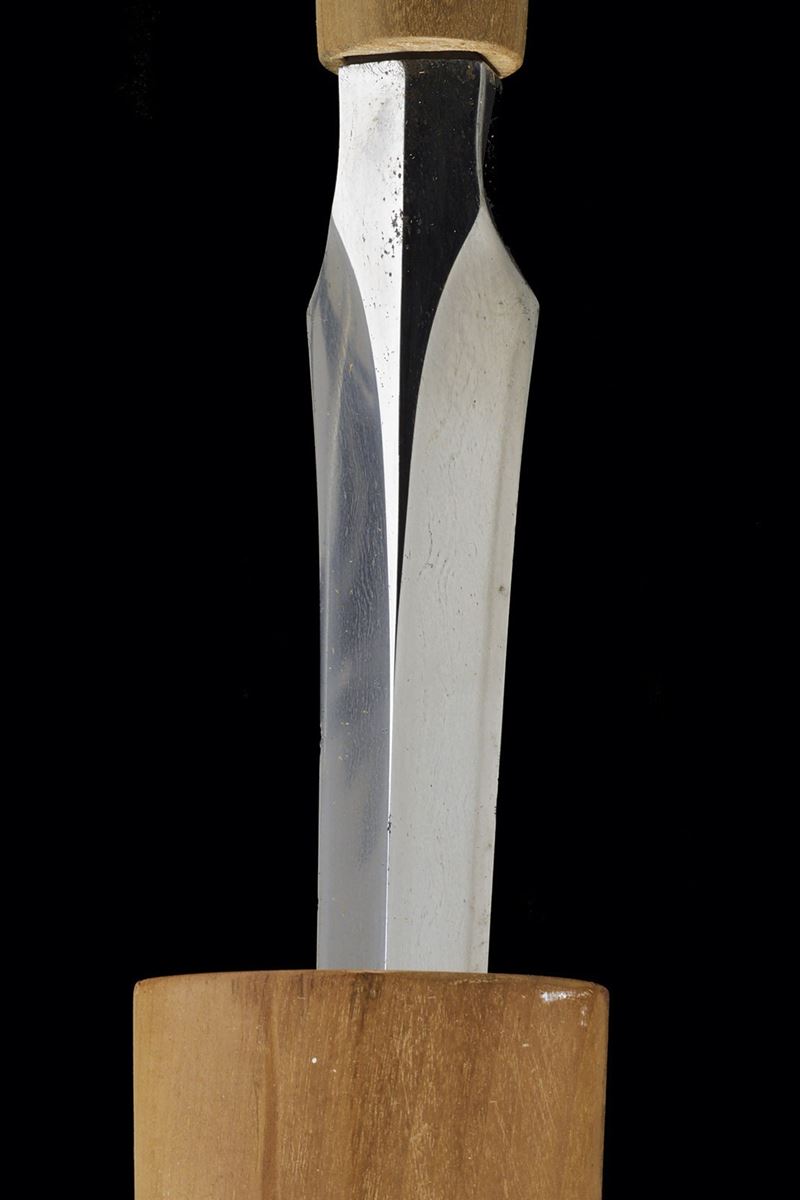 Straight blade of slightly lanceolate shape, (nagasa 55.7 cm) of triangular section. One side with horimono. Hada: itame masame. Hamon: hoso-suguha, nioi deki. Small defects. Nakago-mei (not clearly legible) with date 1508. In modern shirasaya.