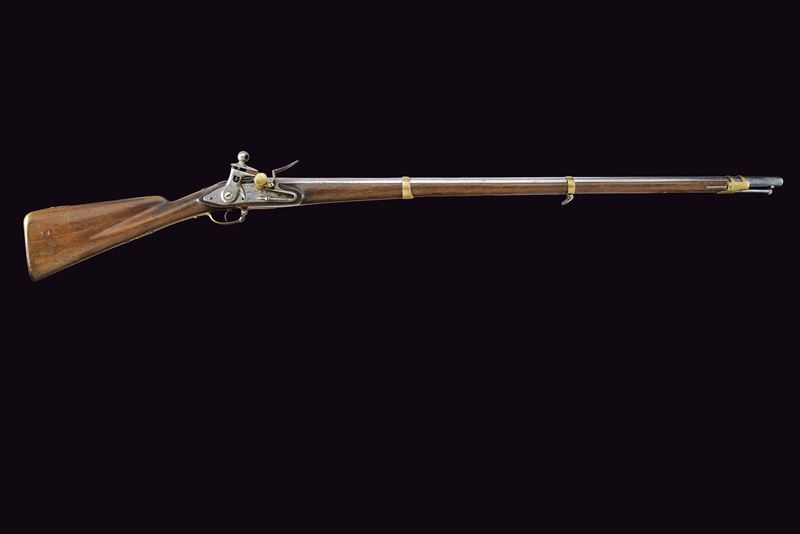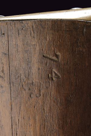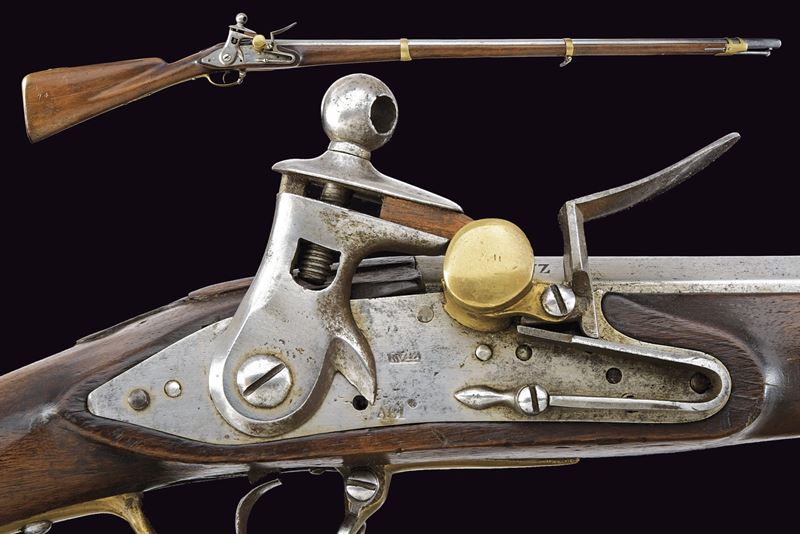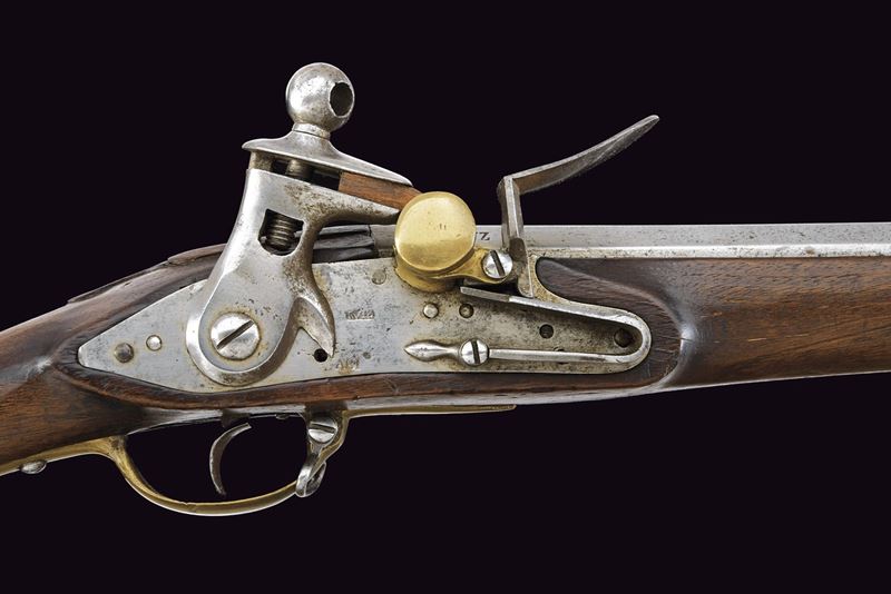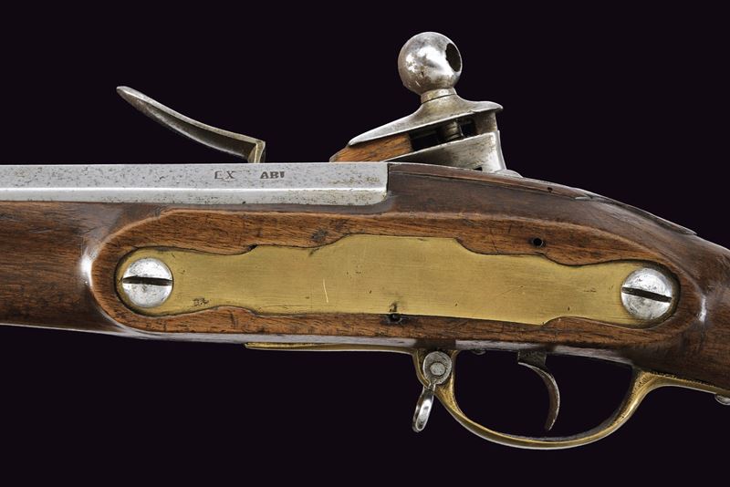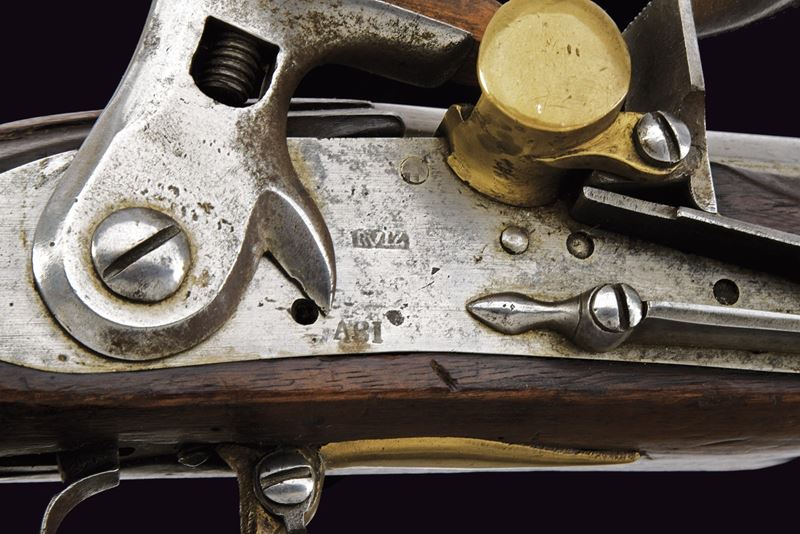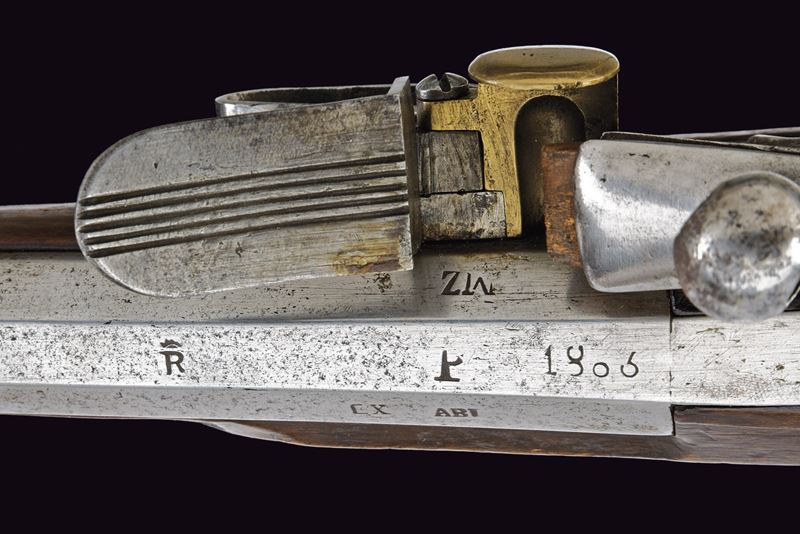 Smoothbore, two-stage, 18 mm cal. barrel, octagonal at the first part and dated "1806", "EX AB1", "R", "MZ" and "P". Large lock with flat lock plate marked “AB1” and "RVIZ"; brass pan and cock with stop. Wooden full stock with brass mounts and iron rod. Clutch for the bayonet.