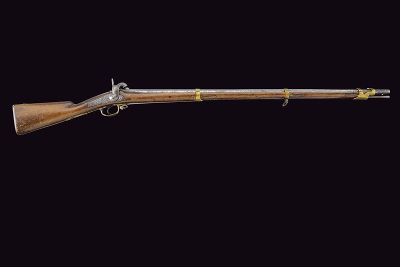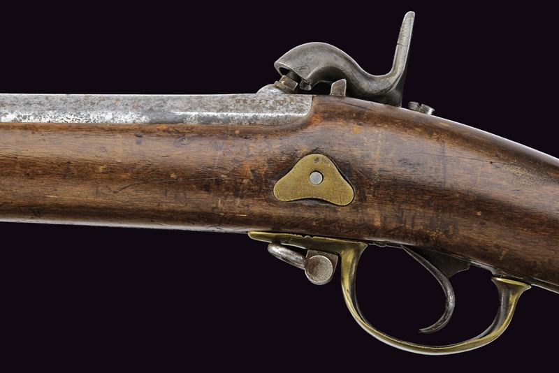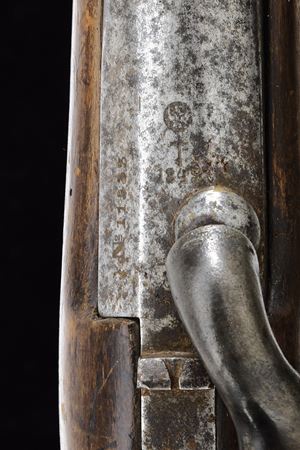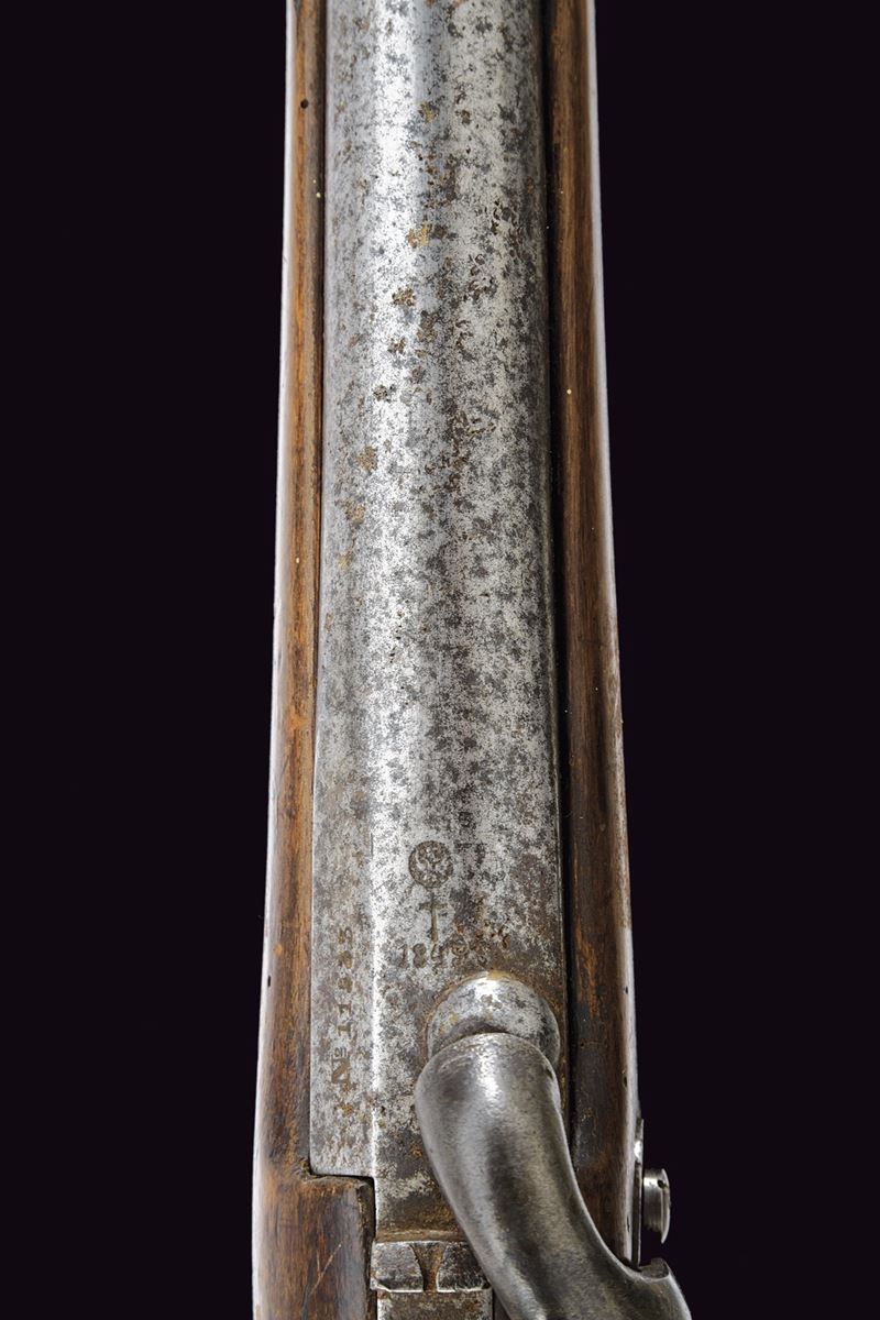 Long, smoothbore, round, 17 mm cal. barrel with octagonal breech featuring an eagle mark, dated "1849" and numbered; provided with brass foresight. Tang provided with rear sight, backward spring lock dated like the barrel and marked in Cyrillic. Wooden full stock (signs of time and use), provided with cheekpiece; brass mounts; dated and marked bands; butt-plate with matching numbering and clearly visible eagle on the upper tang. Metal parts with pitting. Rare.