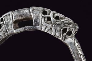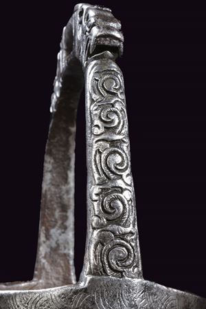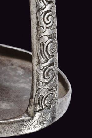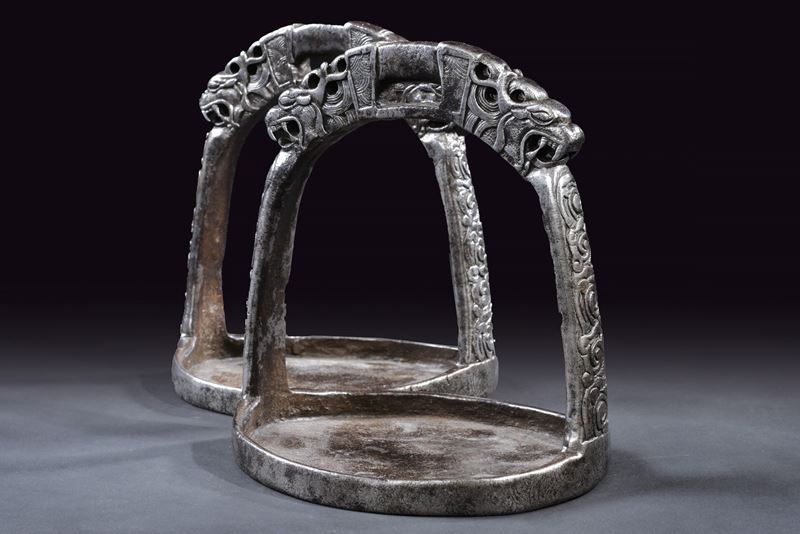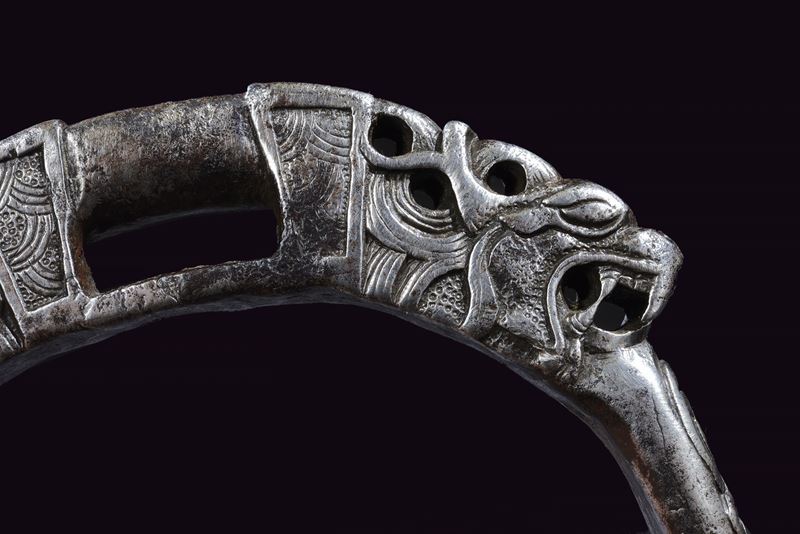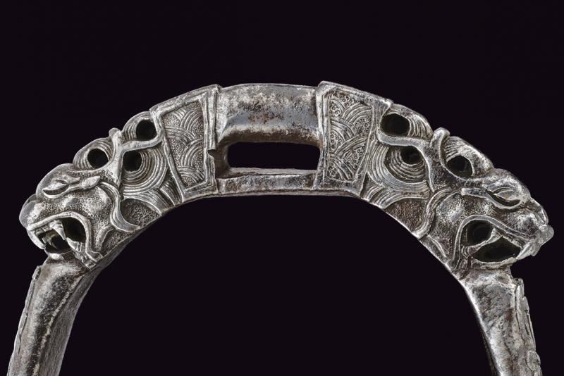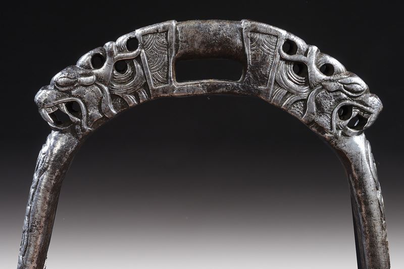Heavy iron structure, with circular treads and raised border, remains of engravings. Arches carved in racemes; rectangular loops flanked by beautiful dragon heads finely carved in the round.