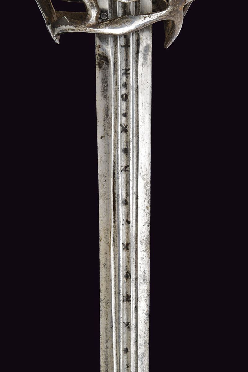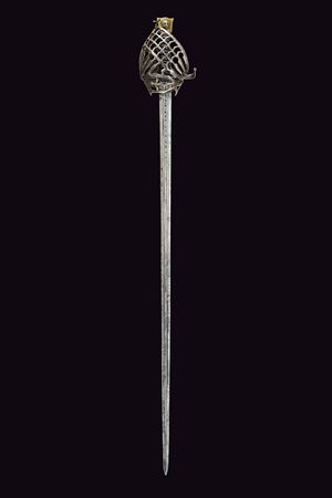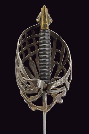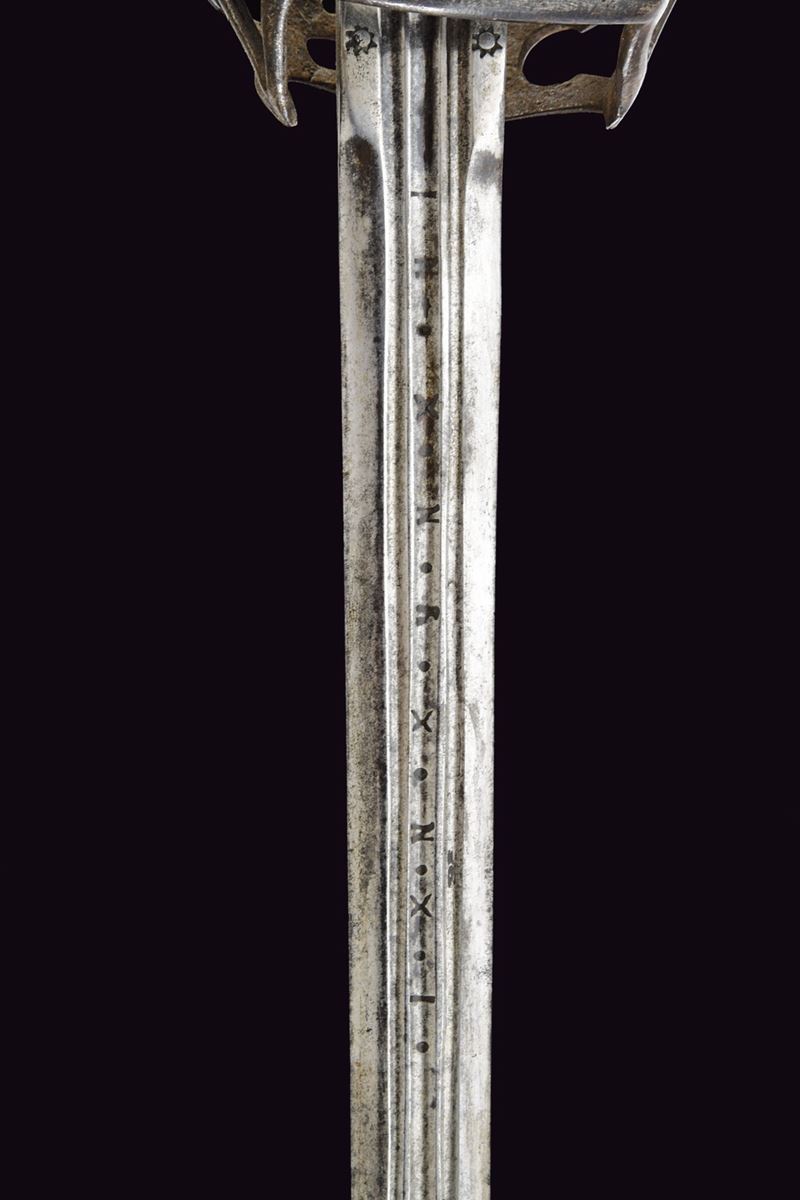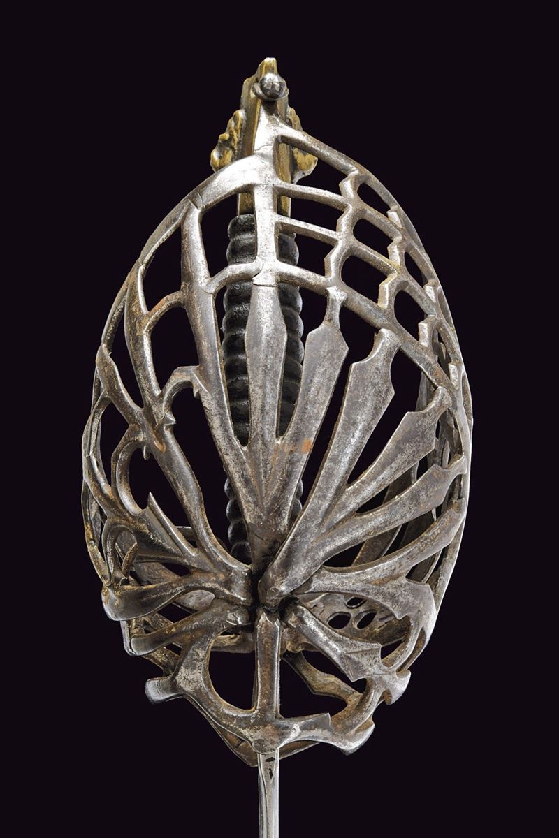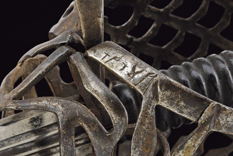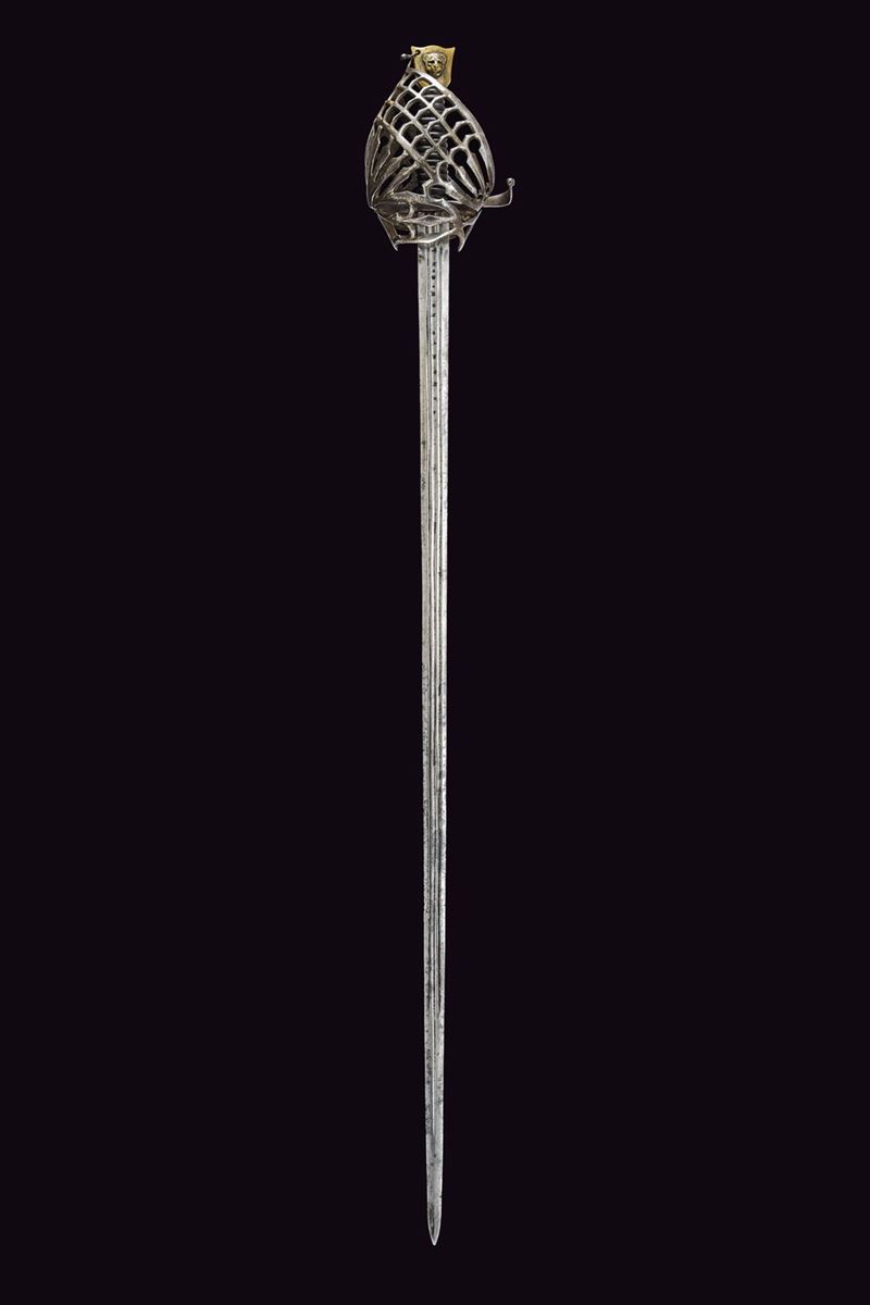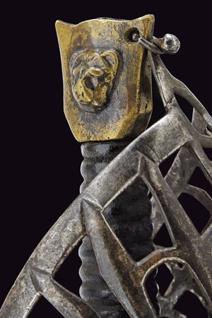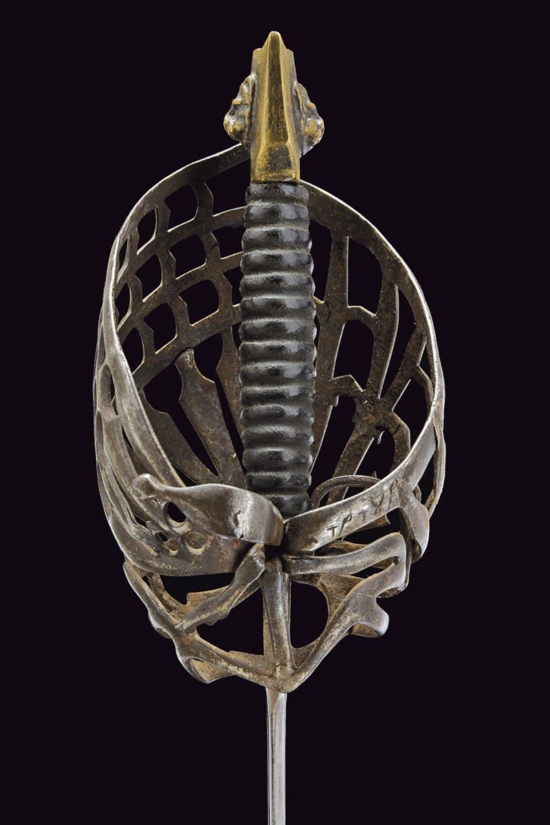 Straight, double-edged blade with triple fullers; markings at the base; ricasso bearing two sun-shaped stamps on both faces. Close-barred iron basket hilt, marked “TPTYP” on one side; angled quillon arm, thumb ring, and a fine stylised cat-head bronze pommel with a central lion’s head in high relief. Wooden grip covered in leather, with spirals.
