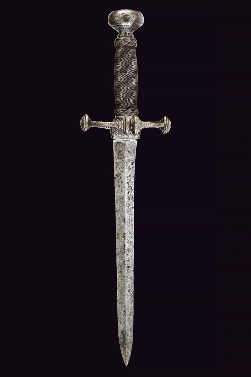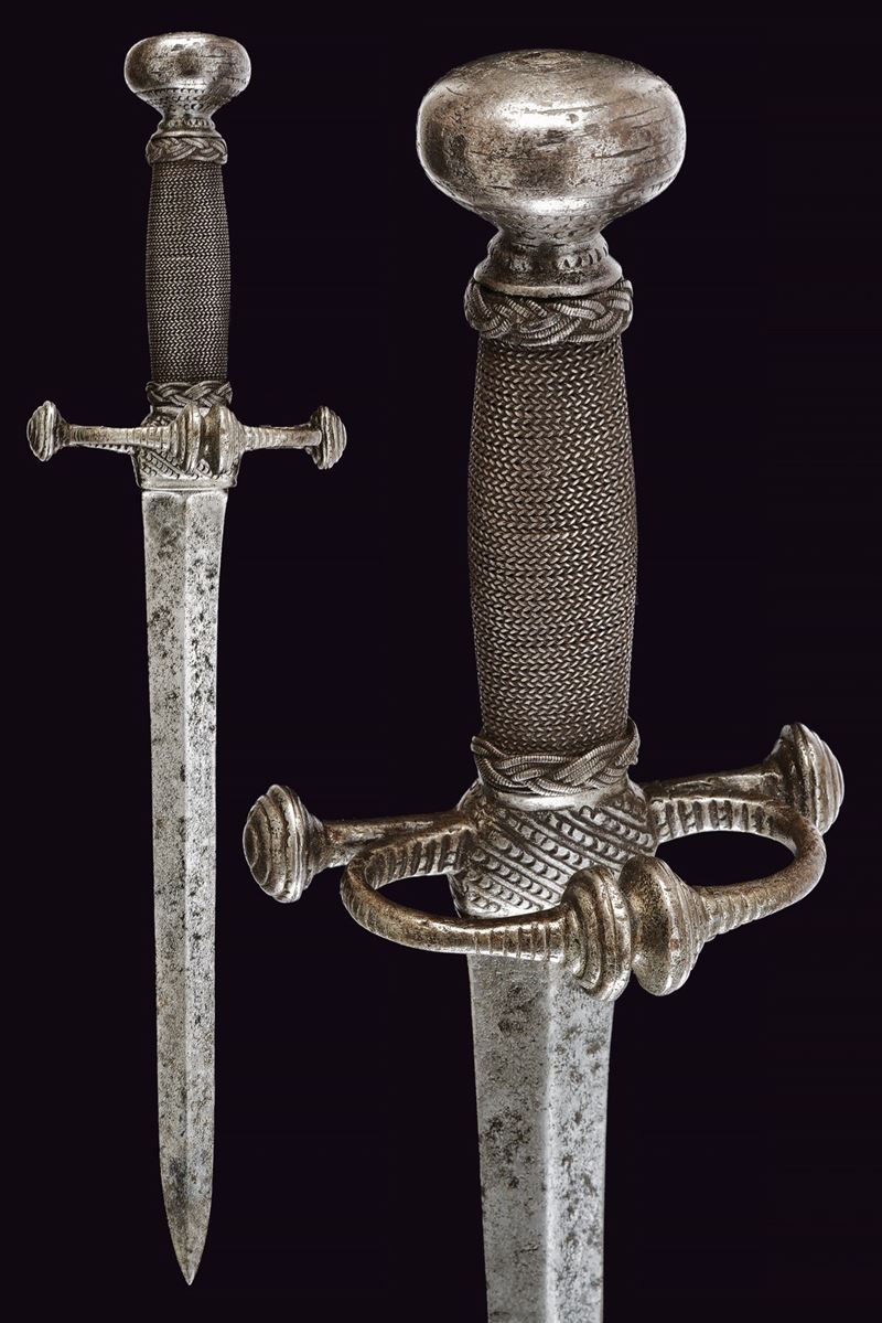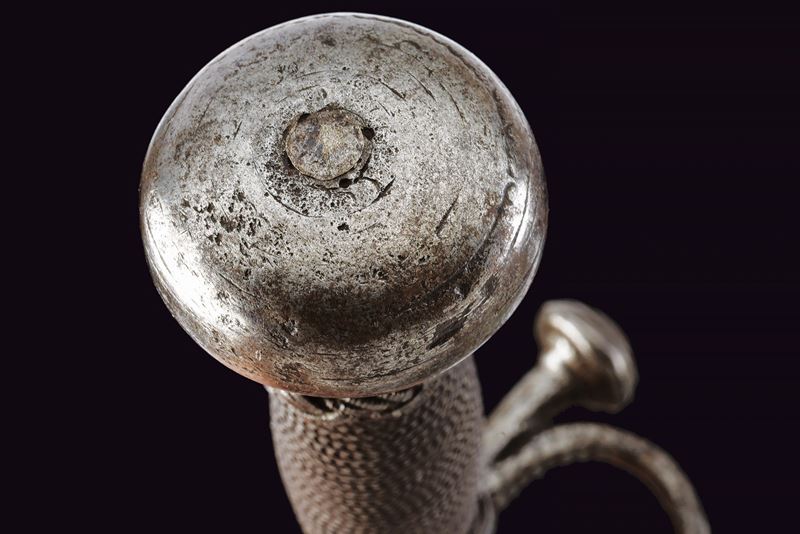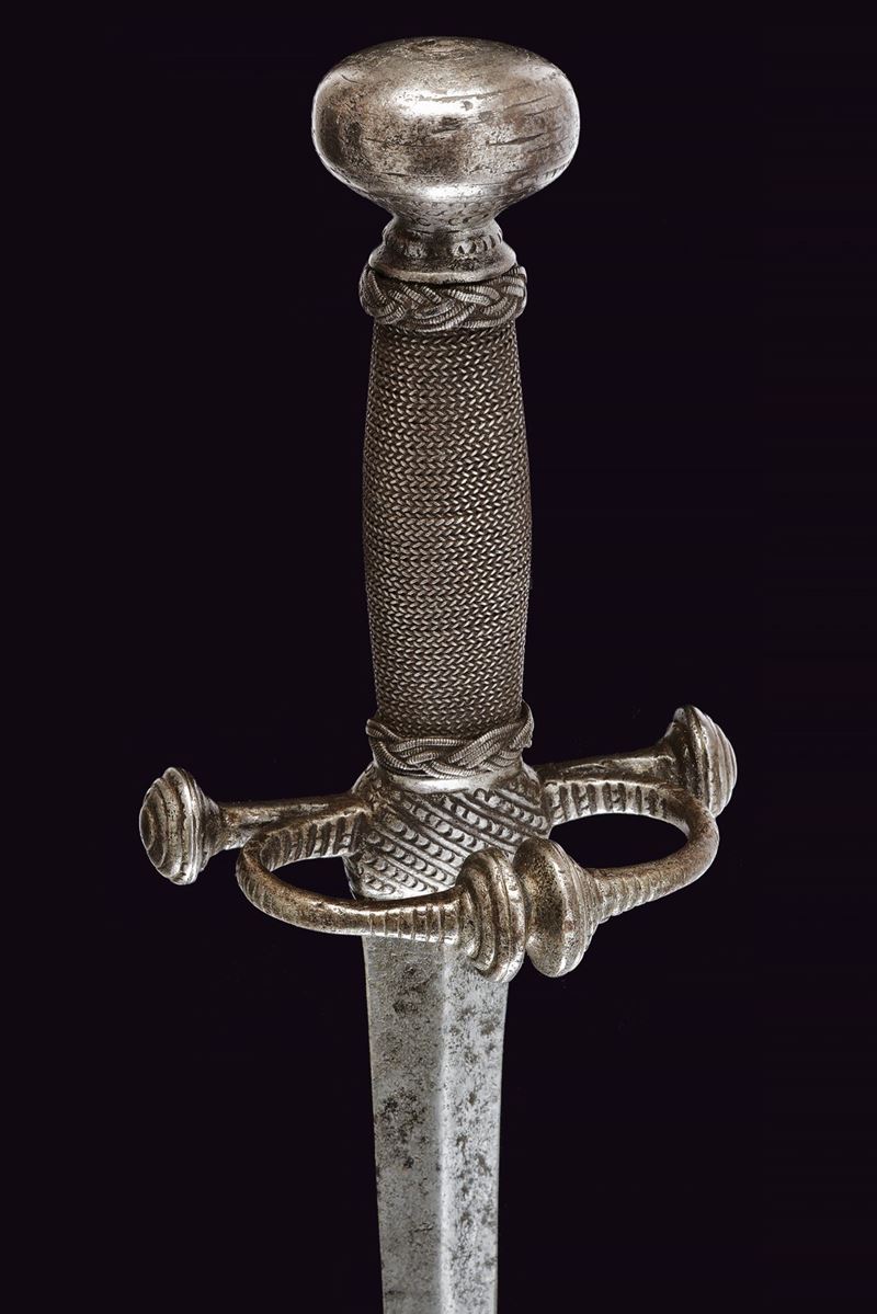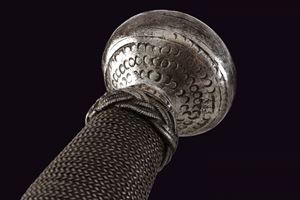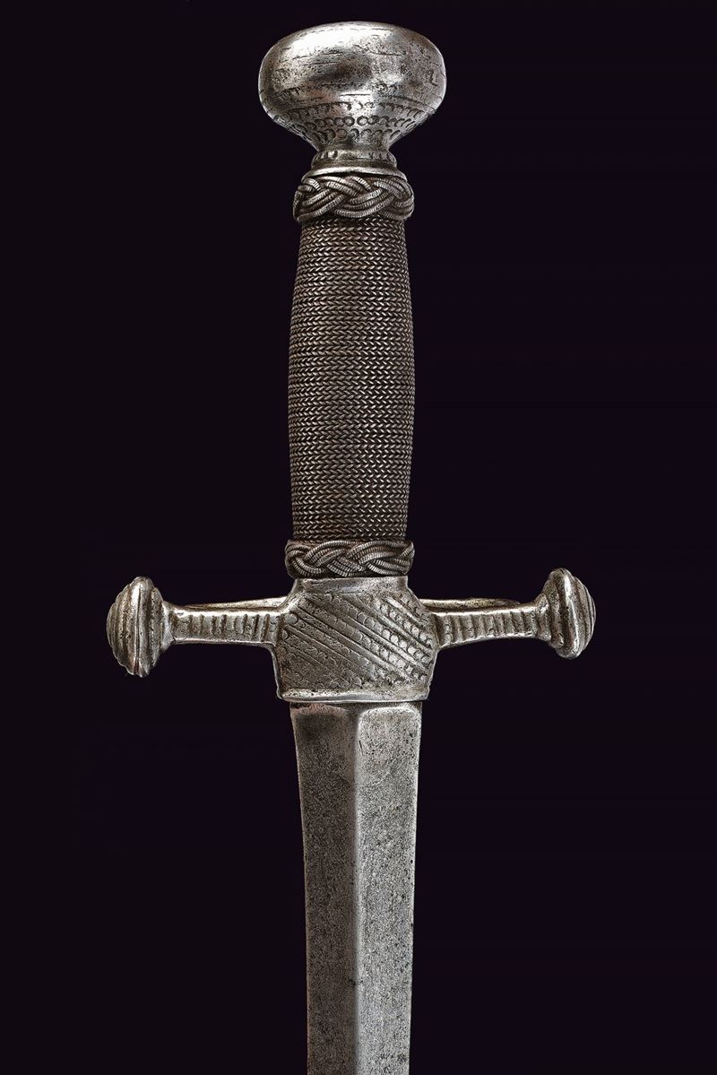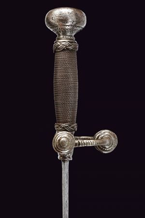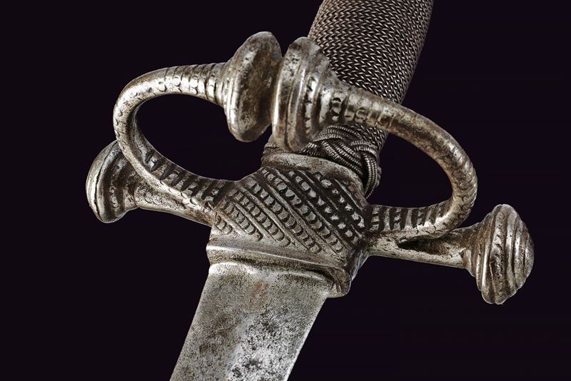 Straight blade with double-edged ribs at the center; some areas with rust damage. Very small tang. Iron hilt, large ring partially decorated with segments featuring notches (both internally and externally) and with enlarged discs at the top. Quillon with short quillons featuring enlarged disc-shaped heads, elaborated en suite to the ring; quillon block with oblique grain. Large, well-proportioned pommel, flattened spherical in shape, with remains of decoration in small circles. Wooden handle covered with iron wire binding and Moor's heads. Saxon?