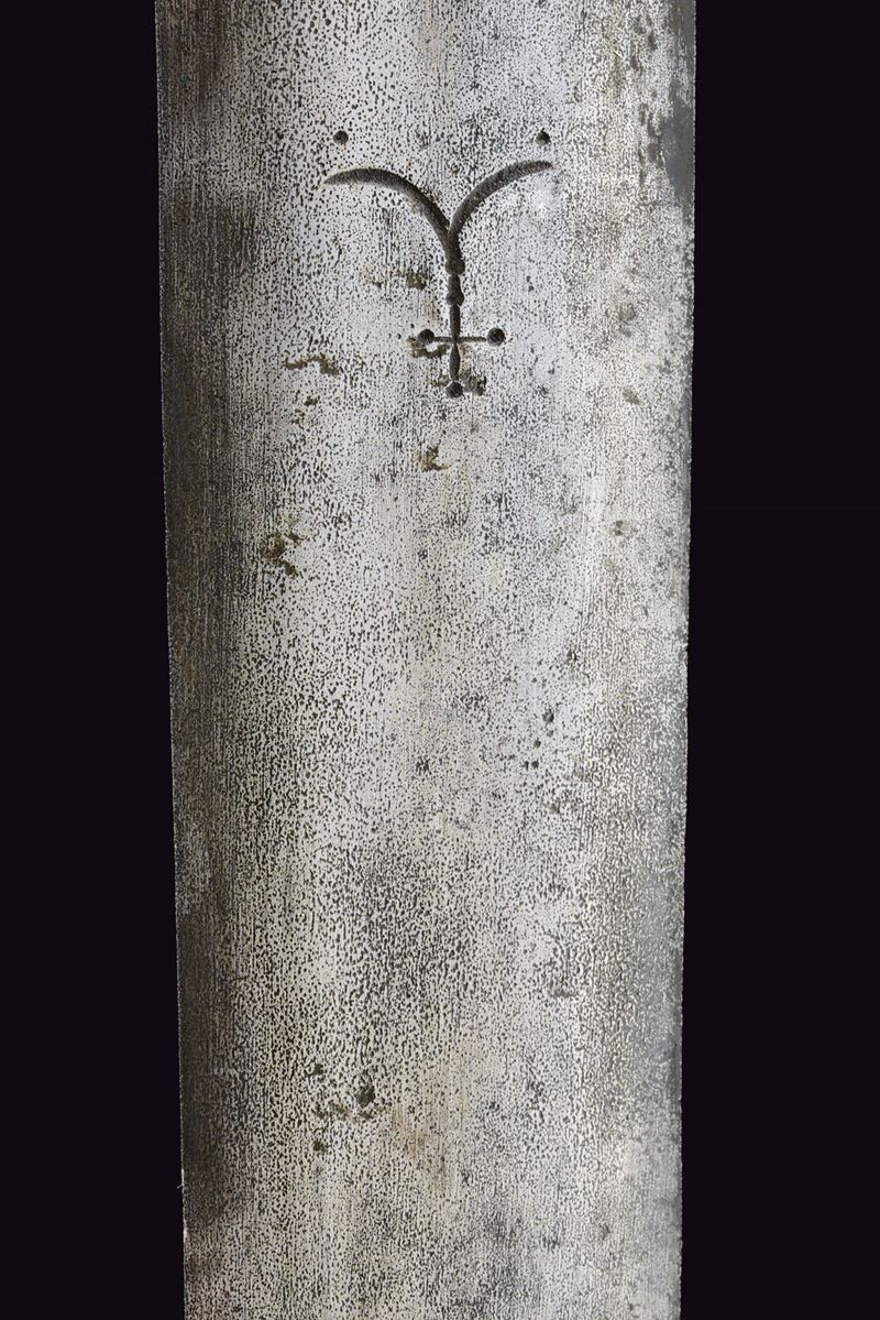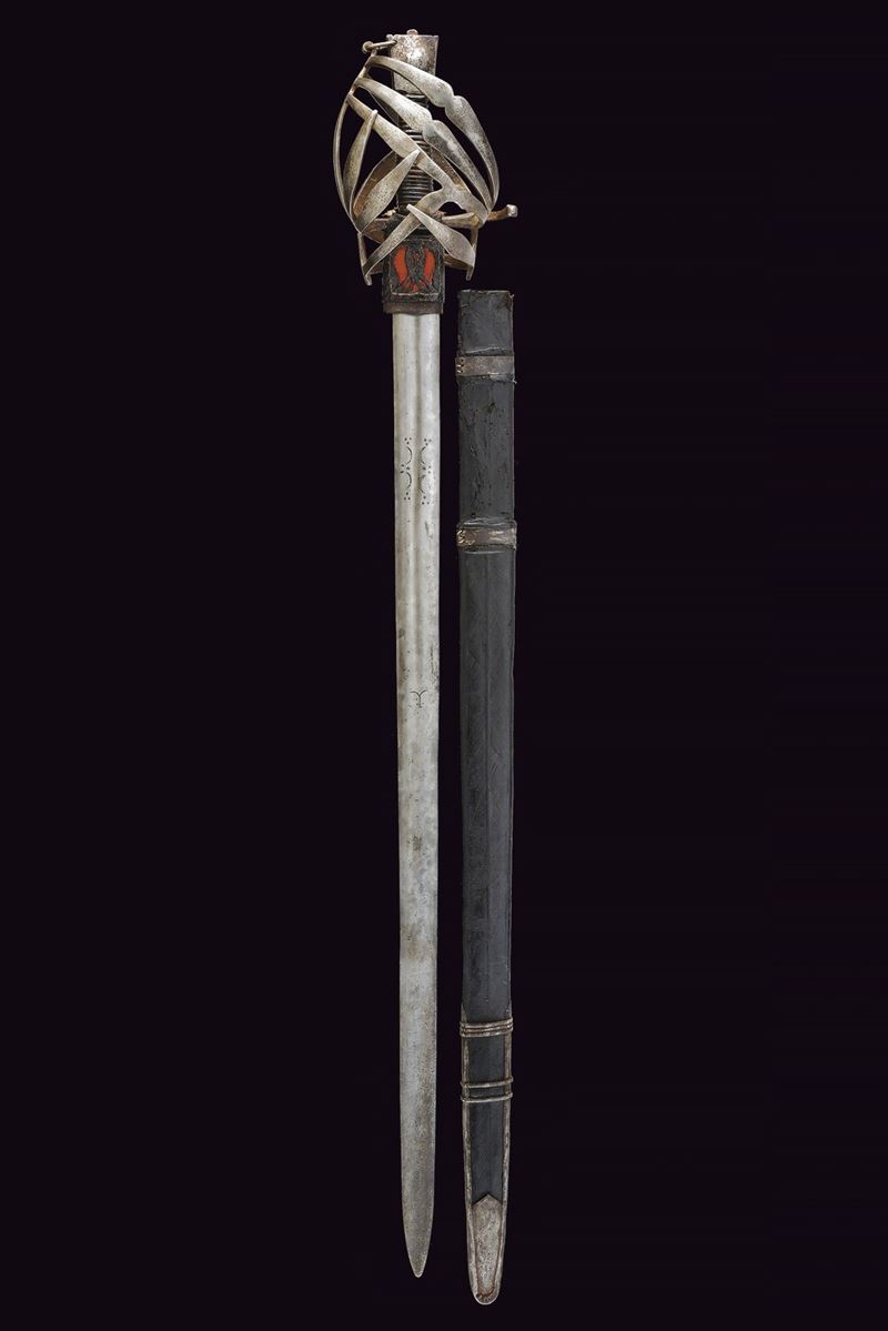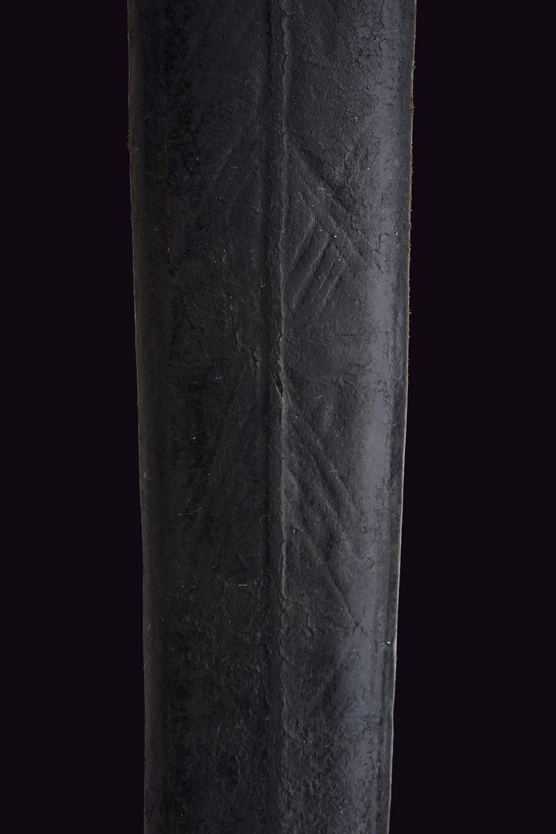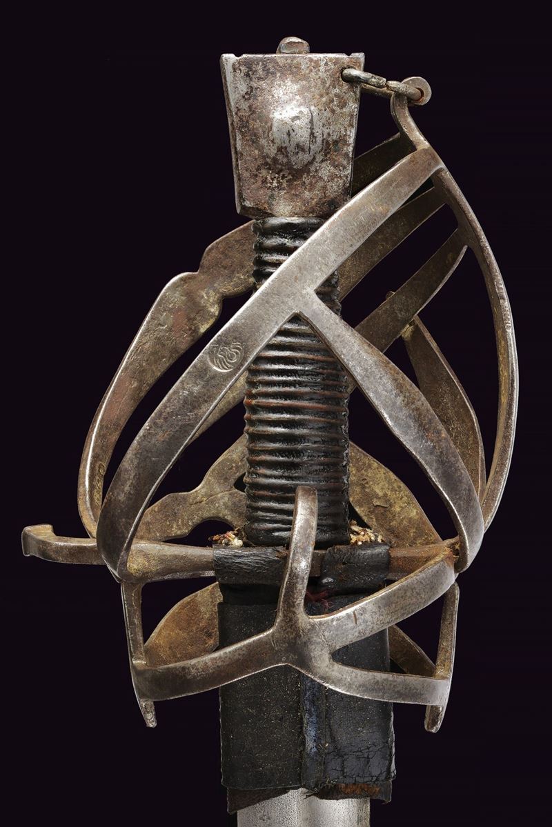 Wide, straight, double-edged blade with a light central fuller at the base, decorated with toothed semicircles between dots and stars. Ricasso covered in partially pierced leather and lined with red cloth. Iron basket hilt bearing two clearly visible Venetian inspection marks. Iron stylised cat-head pommel with a raised centre. Wooden grip covered in leather, spiral-wrapped. Complete with the rare wooden scabbard covered in leather with iron mounts (missing parts and restorations). The blade no longer seats fully in the scabbard.
