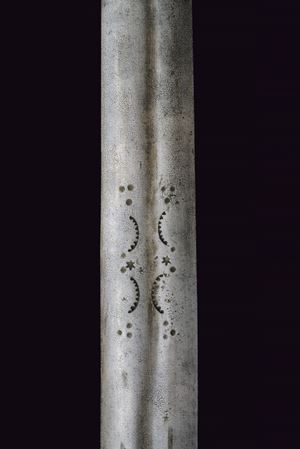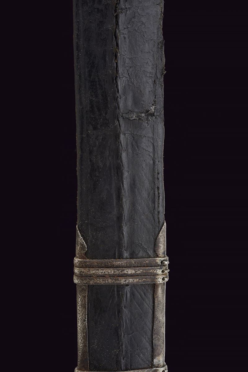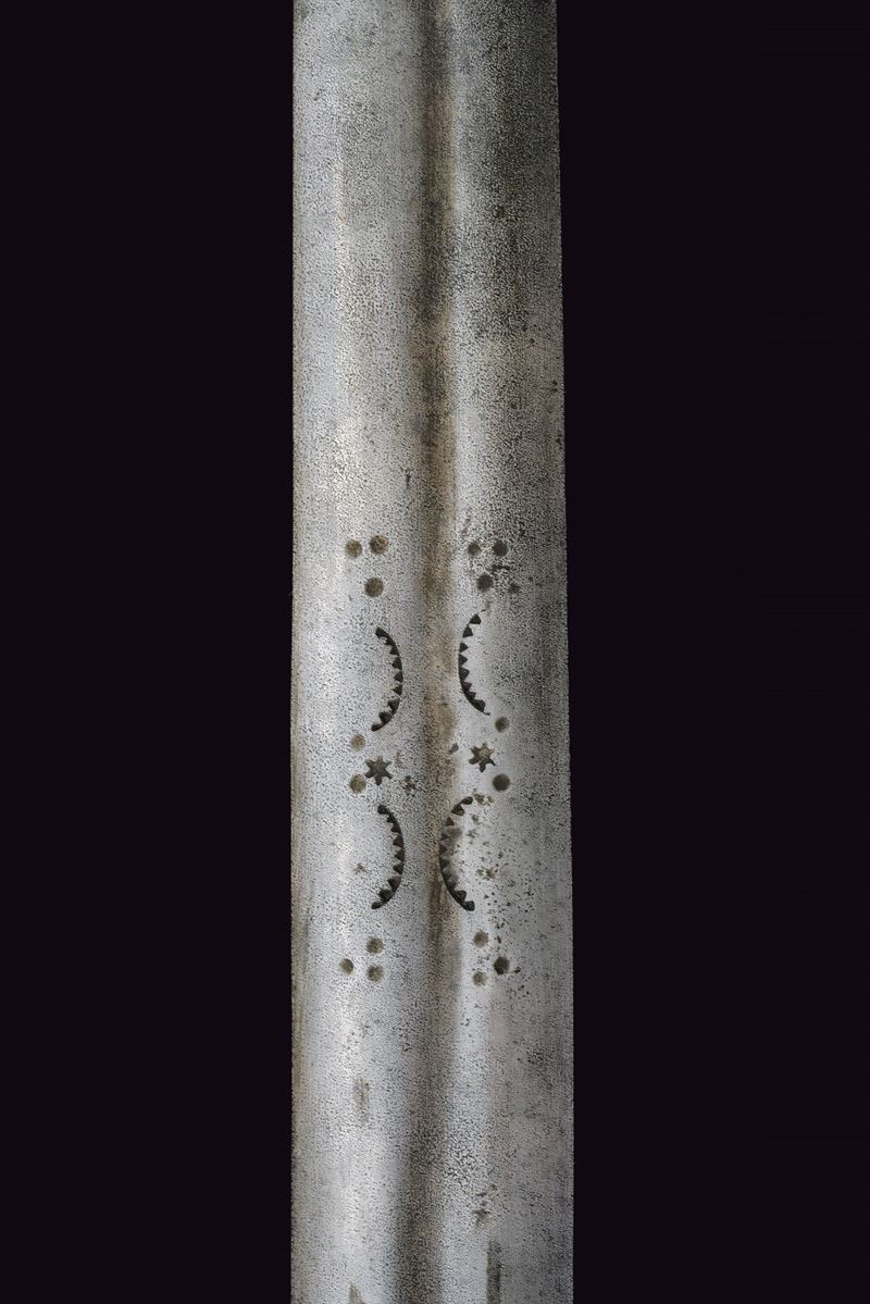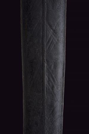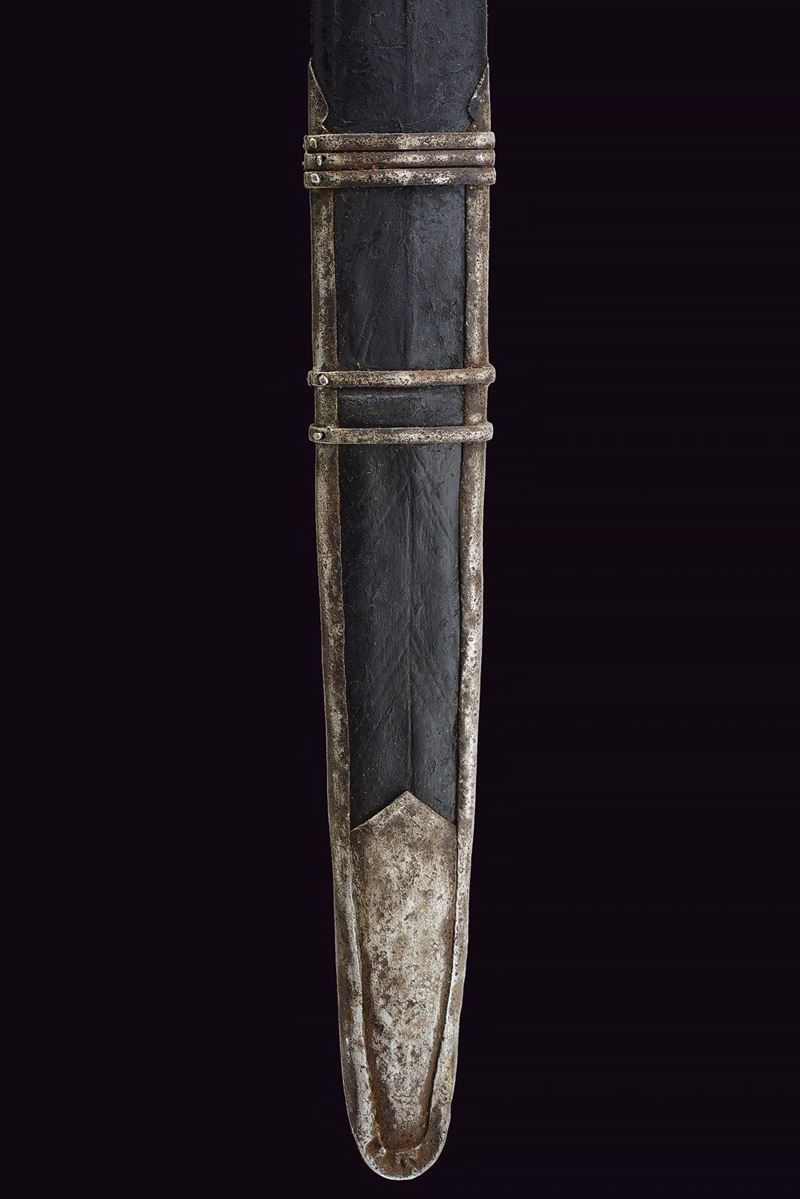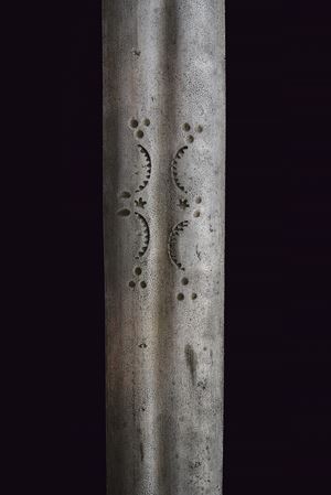 Wide, straight, double-edged blade with a light central fuller at the base, decorated with toothed semicircles between dots and stars. Ricasso covered in partially pierced leather and lined with red cloth. Iron basket hilt bearing two clearly visible Venetian inspection marks. Iron stylised cat-head pommel with a raised centre. Wooden grip covered in leather, spiral-wrapped. Complete with the rare wooden scabbard covered in leather with iron mounts (missing parts and restorations). The blade no longer seats fully in the scabbard.