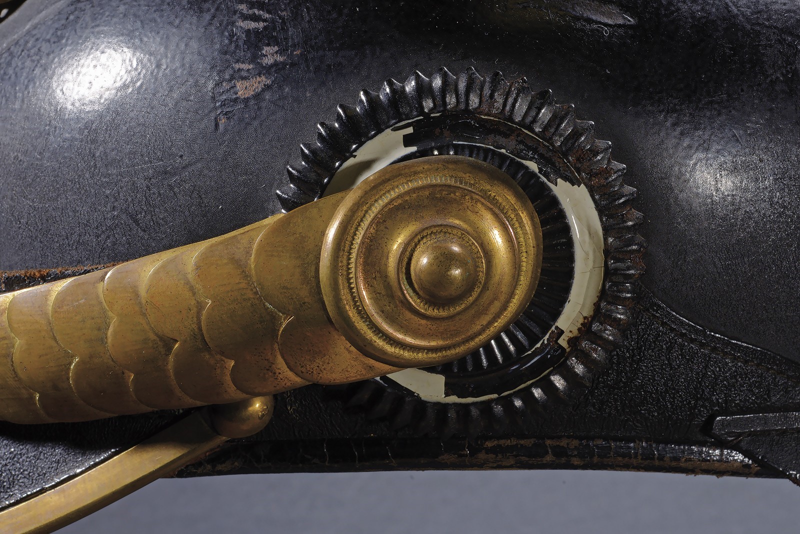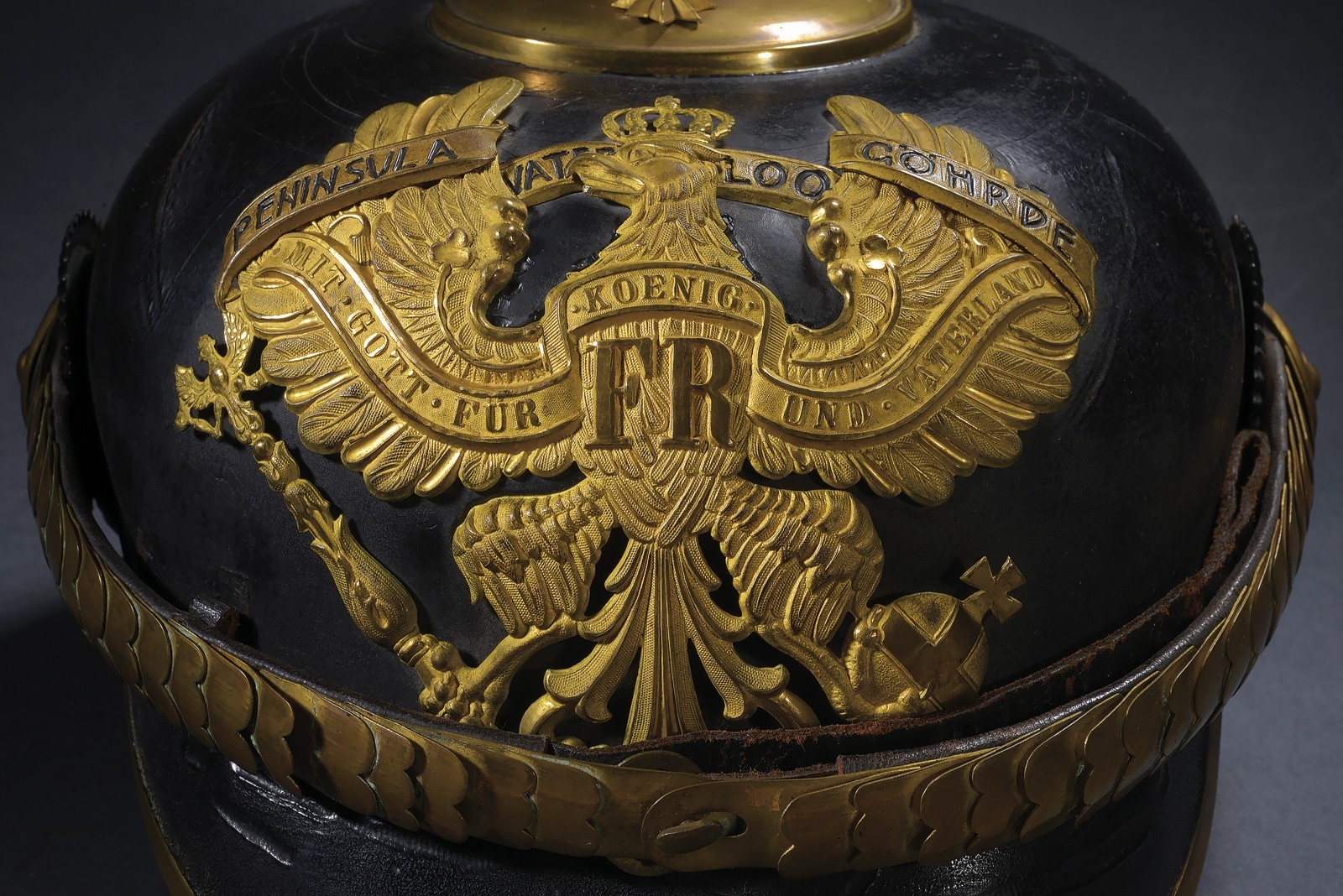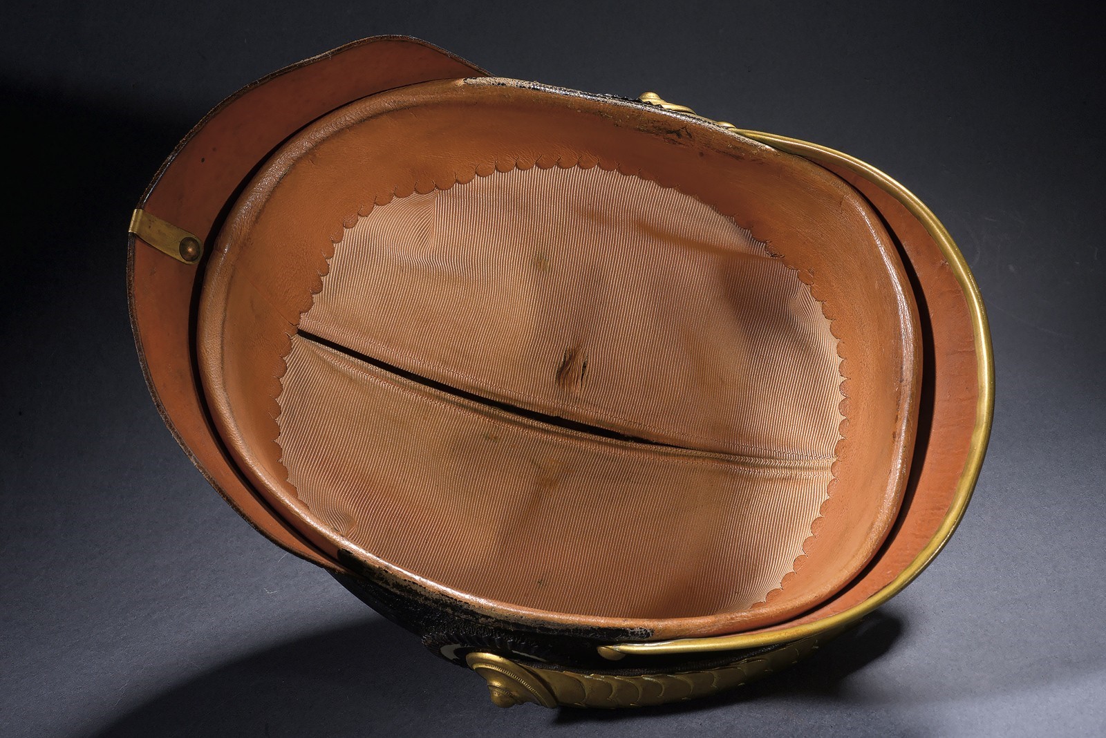 Black lacquered leather skull (small defects); Prussian eagle on the chanfrin with "PENINSULA WATERLLO GÖHRDE" band; tip with ball-shaped top, round base with four star-headed rivets. Convex chin-strap with brass scales; both cockades (non-commissioned officer). Inside leather sweat-band and silk cap.