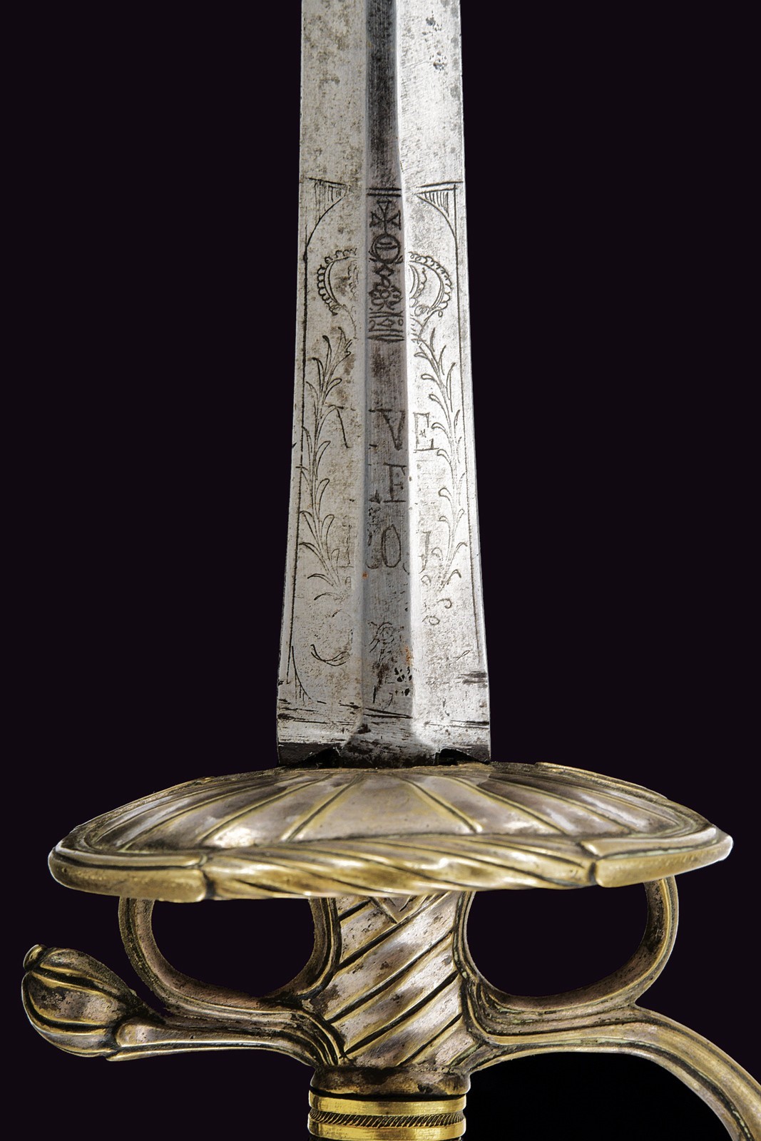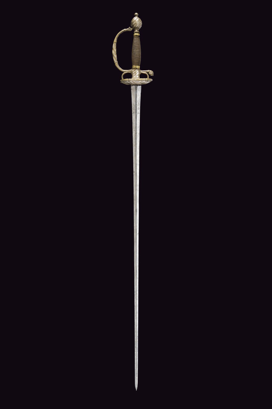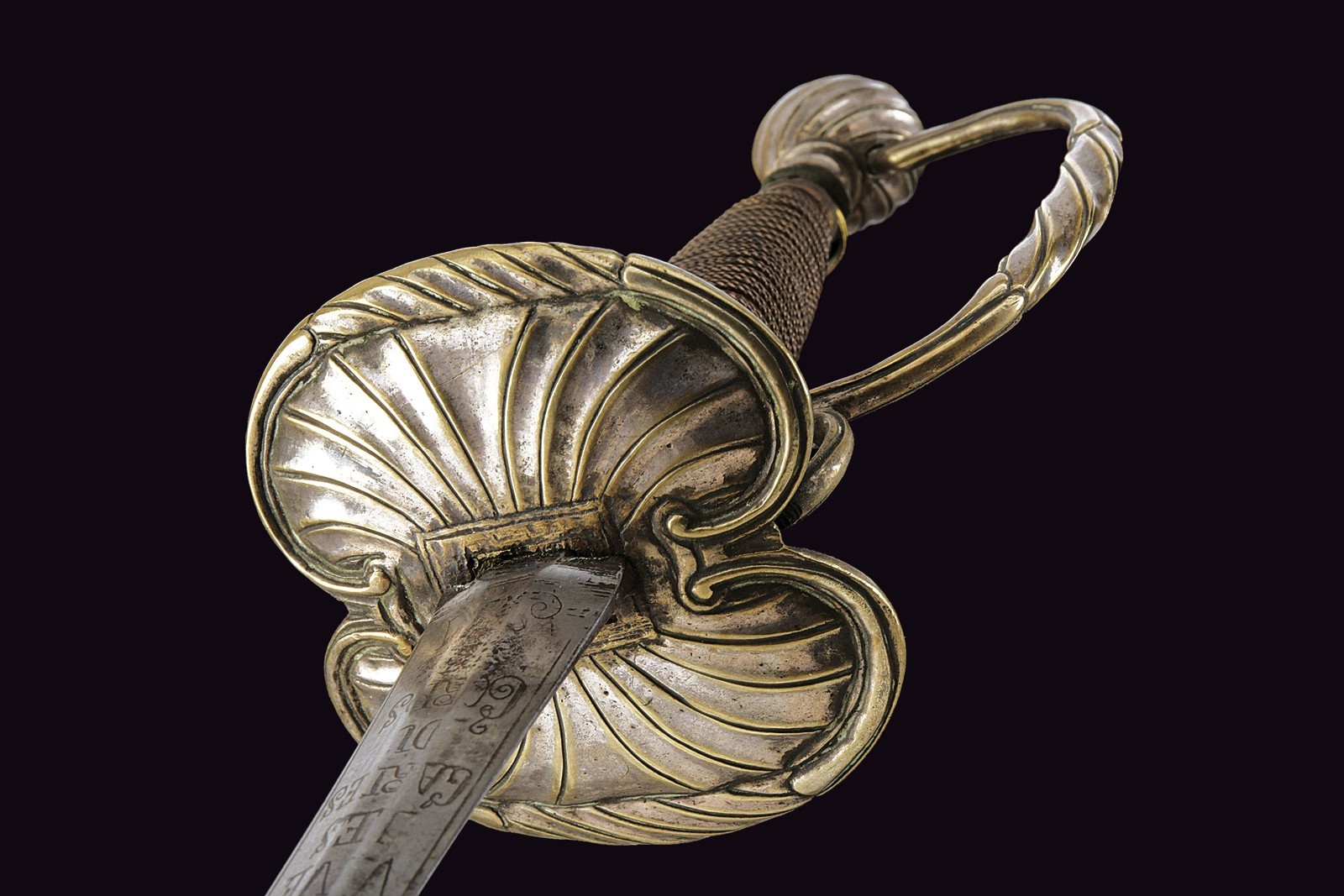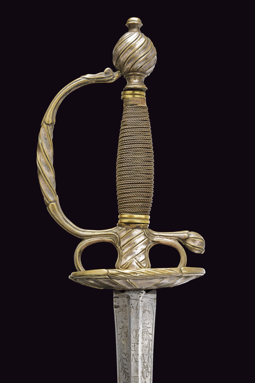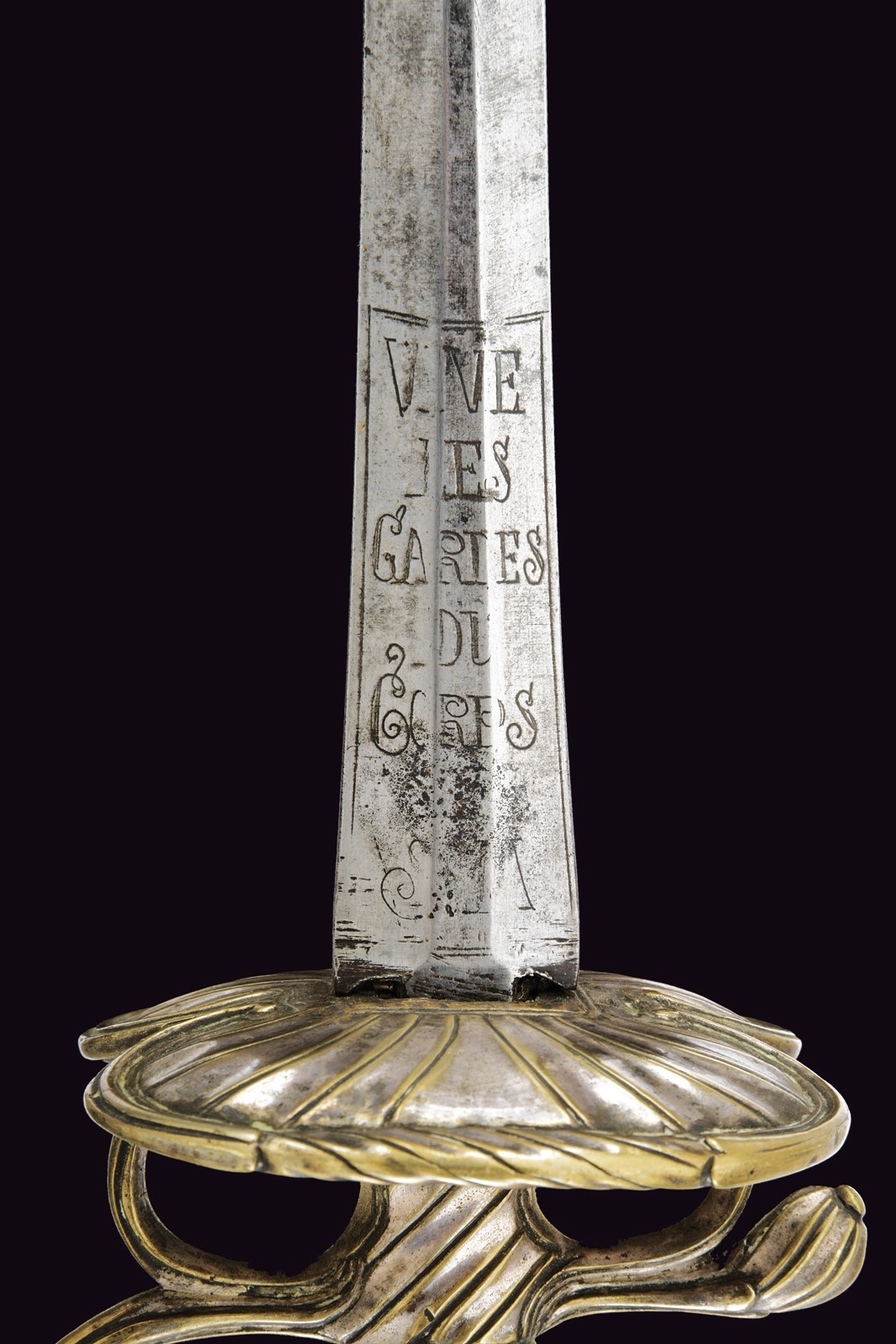 Straight, double-edged blade of hexagonal section; at the forte engraved with the motto “VIVE LE ROI” beneath a crown amid floral motifs on one side, and “VIVE LES GARDES DU CORPS DE S.M.” on the other. Bronze hilt entirely decorated with spiral motifs, with remnants of silvering. Wooden grip bound with very fine metal wire binding.