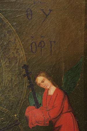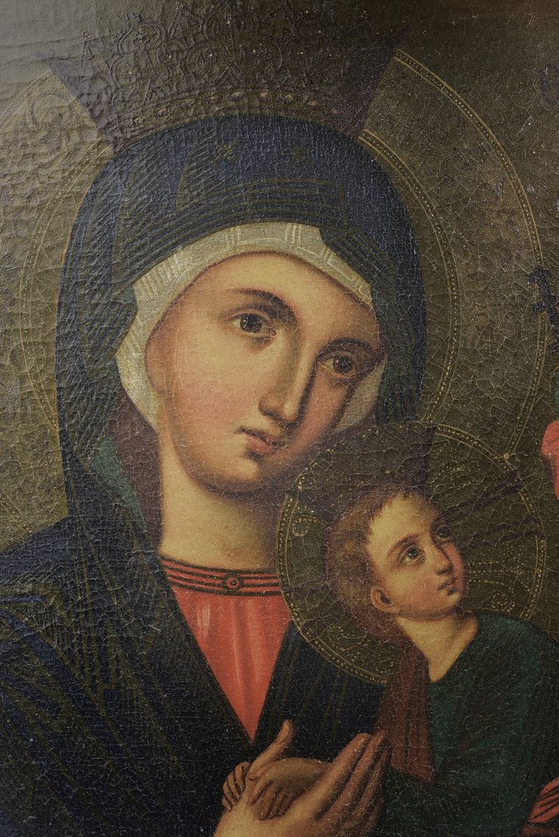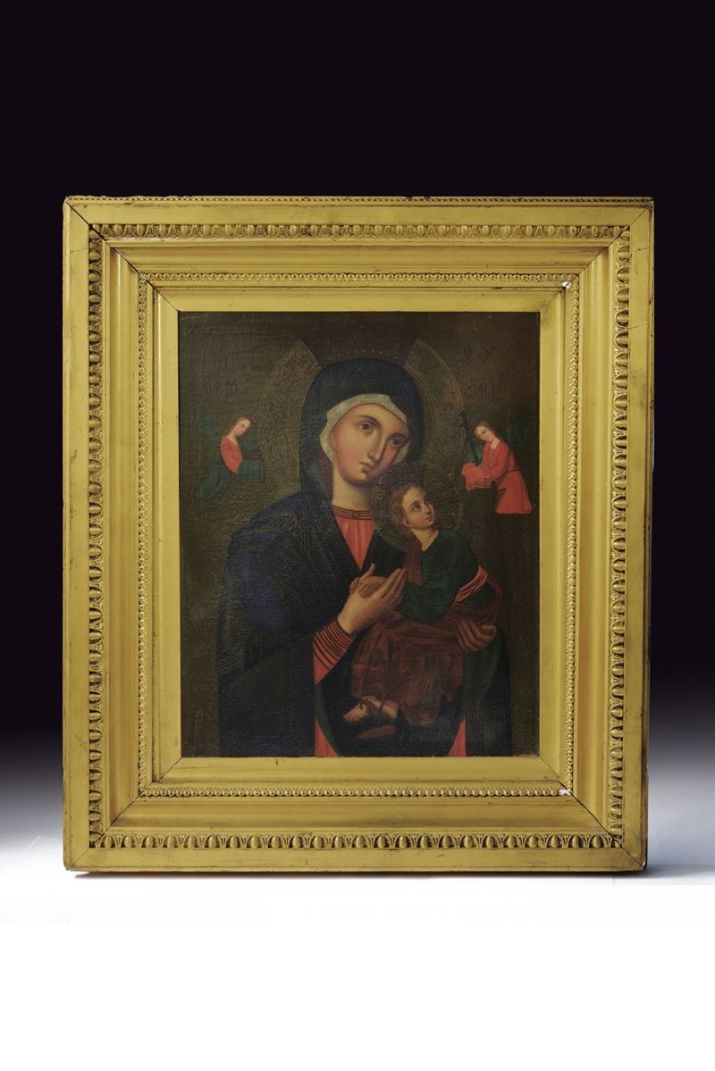 This icon on canvas is a depiction of the Virgin Mary with the Christ Child, known as the “Virgin of the Passion” or “Our Lady of Perpetual Help.” The Christ Child looks toward two angels who hold instruments of the Passion, a cross and nails, signs of his future suffering. His dangling sandal emphasizes his vulnerability. The Greek inscriptions identify Mary as the Mother of God and the angels as Michael and Gabriel. The style, with its soft features, earthy tones, and red-green contrast, suggests it likely comes from Eastern Europe, particularly Western Ukraine or Southern Poland, where Byzantine tradition blended with local aesthetics in the 18th–19th centuries. In a beautiful contemporary frame in stucco and gilded wood.