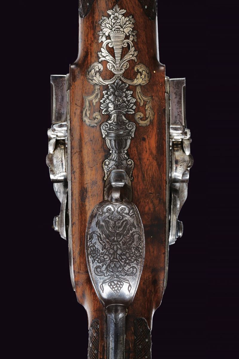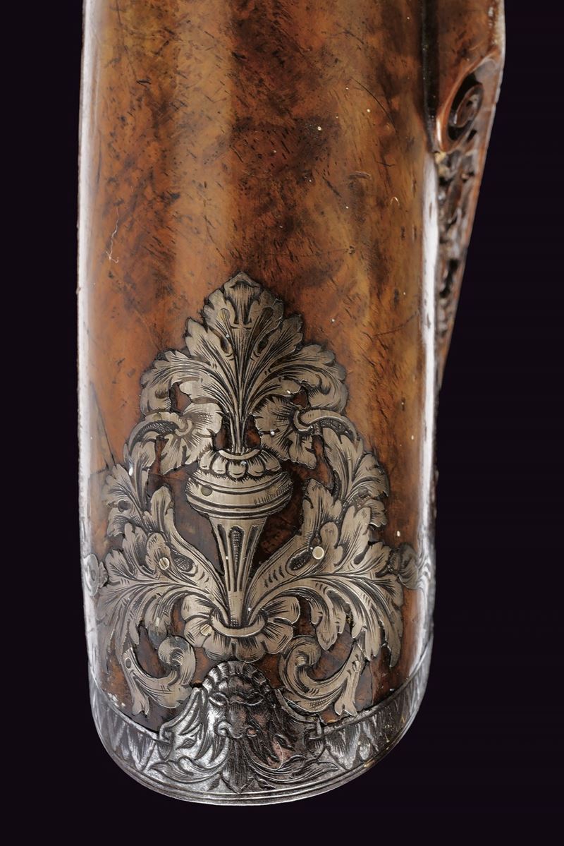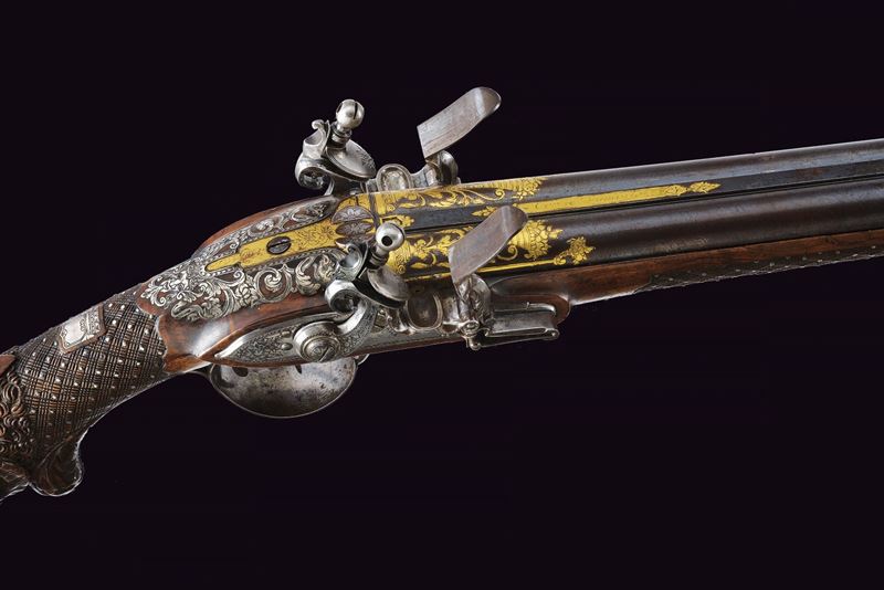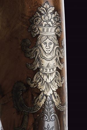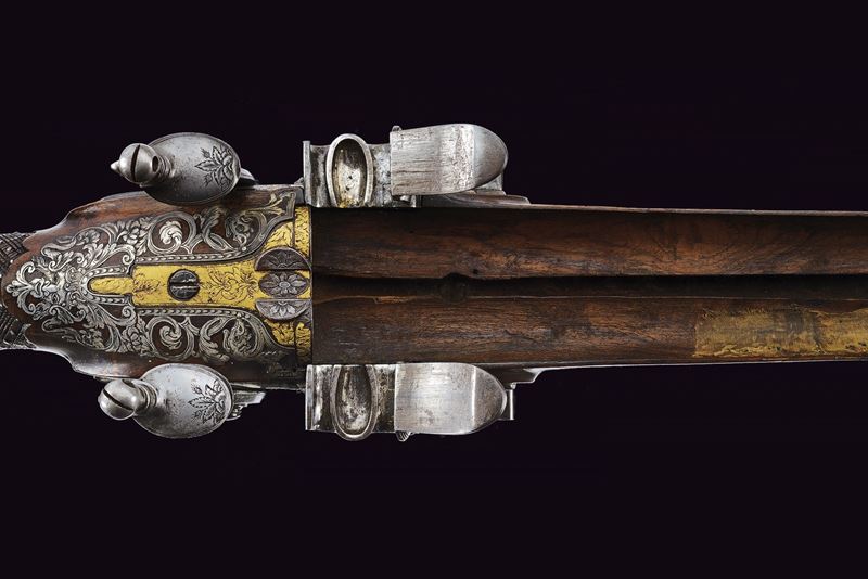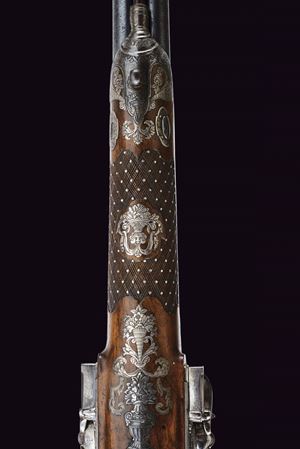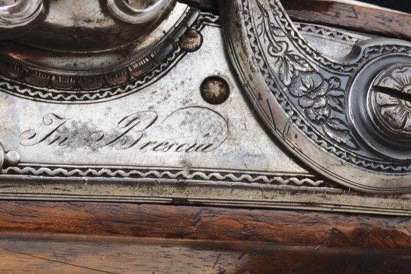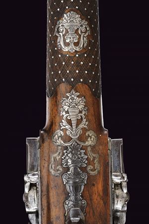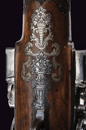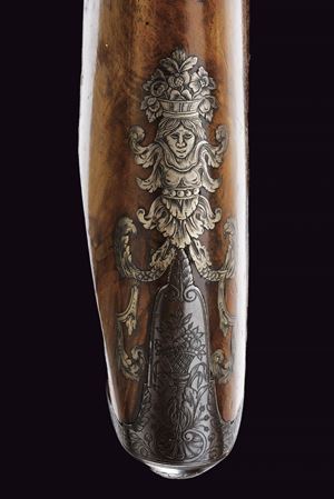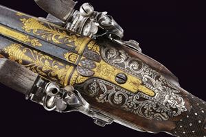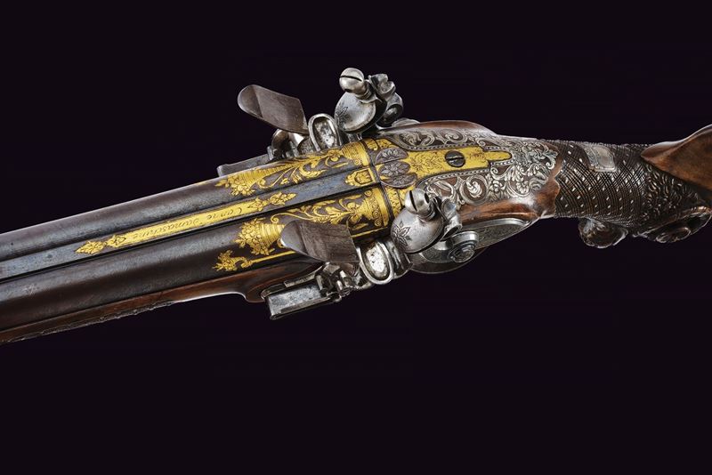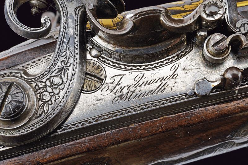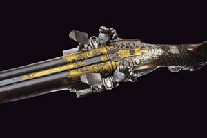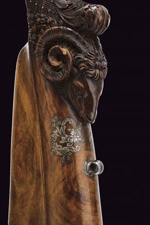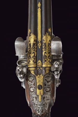 Round, smoothbore, over-and-under, 15 mm cal. barrel, twisted, and with remains of original browning; decorated in gold at the breech with cornucopias and racemes. On the rib, there is a gold-inlaid patch mark with the crowned letters "F M B" (Ferdinando Minelli Brescia), slightly above a rectangular cartouche "Canne Damaschine" also gold-inlaid; nozzle with foresight and cornets with gold leaves; gold vent. Gold-inlaid tangs with leaves in bas-relief; iron saddle-type foresight decorated with floral motifs. Lock with flat lock plates without raised borders and engraved with floral motifs on the tang, on the cocks and on the batterie; spring with anti-friction roller; signatures in italics "Ferdinando Minelli / in Brescia". Short walnut stock, provided with cheekpiece carved with cornucopia in bas-relief, grip sculpted in the round with a magnificent ram's head (small missing part on one curved horn), checkered grip with noble shield and silver studded ornaments, as well as on the grip of the frame. All the elaborate silver mounts are inlaid and decorated with cornucopia motifs, and the iron butt plate and trigger guard are engraved with the same decorations. Original horn-tipped wooden ramrod.