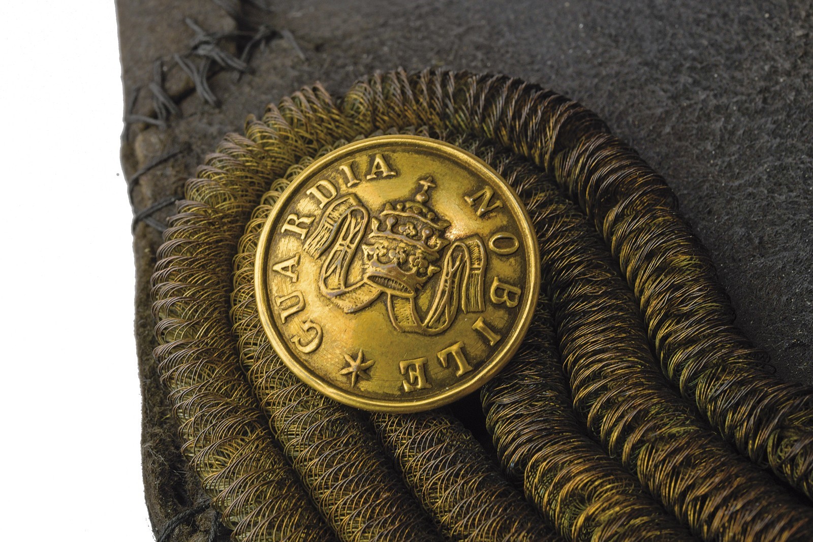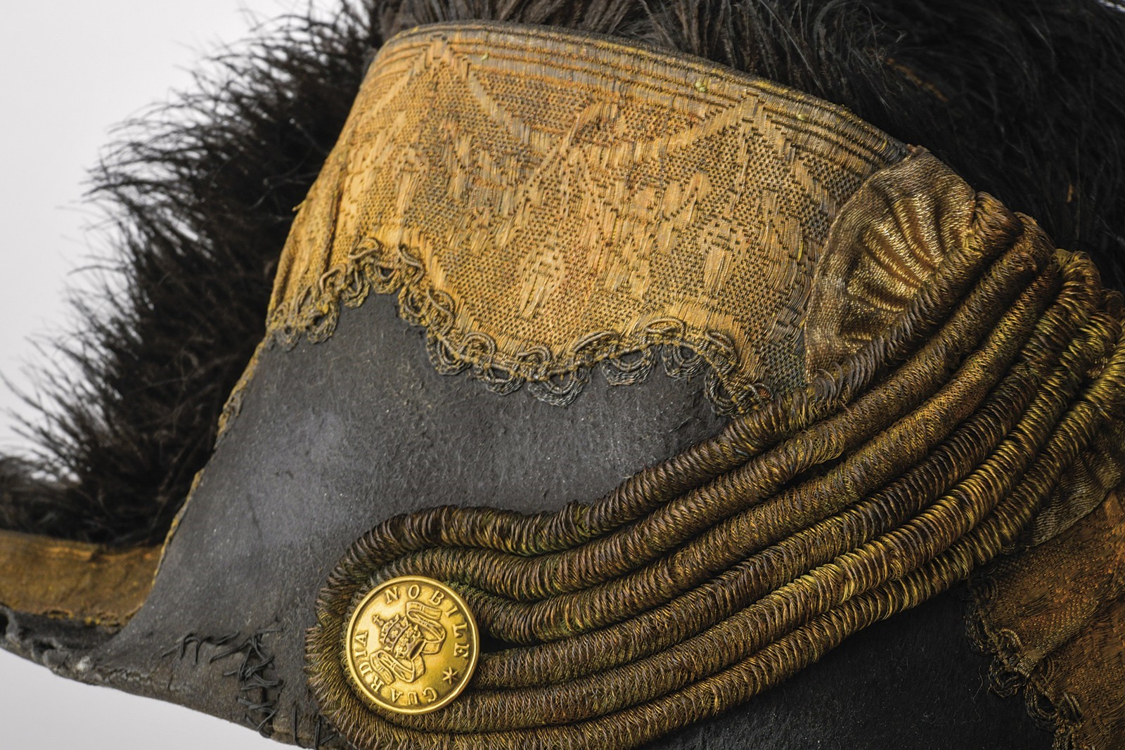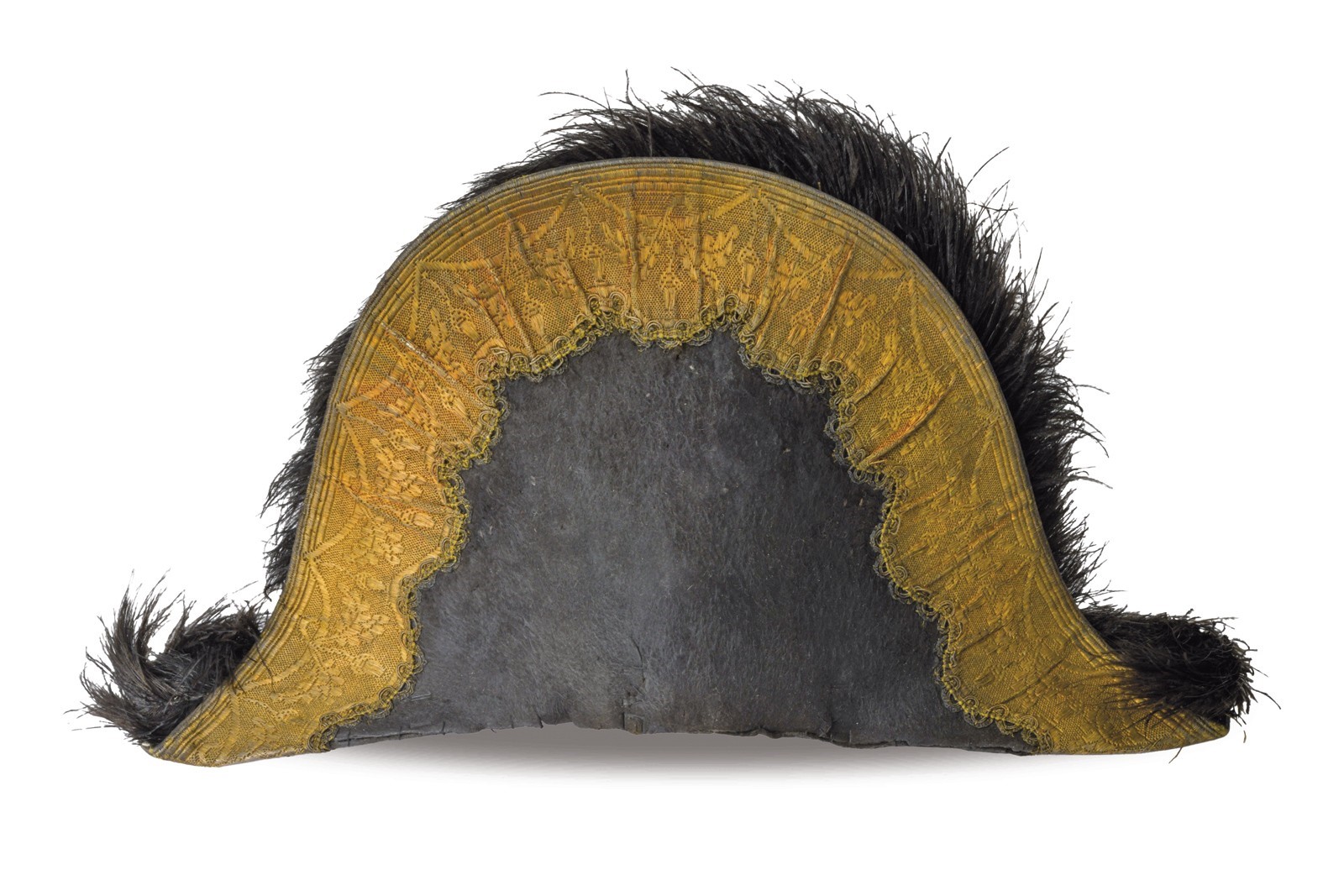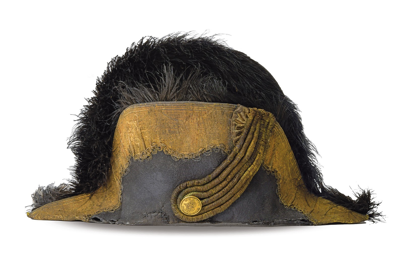 Made of black felt, with brims turned upward and edged with gold floral-embroidered stripe. Silver-thread cockade and yellow-gold cord loop. Gilded button of the Noble Guard bearing the Papal tiara emblem. Black plumes. Missing the sweatband inside, but retaining the moiré silk liner with an indistinct (frayed) Papal emblem. Damage, old repairs, and clear signs of wear and age. Uncommon.