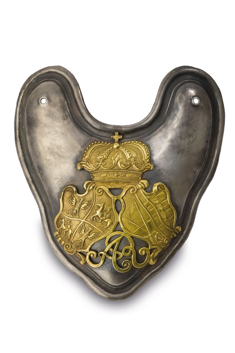 Brass badge combining the arms of Poland and Meissen, joined by the cipher “AR” (Augustus Rex) and surmounted by a royal crown. Mounted on a metal backing (possibly silver) by three screws; the upper section with two holes for the now-missing suspension chain. Possibly of later manufacture than the original period.