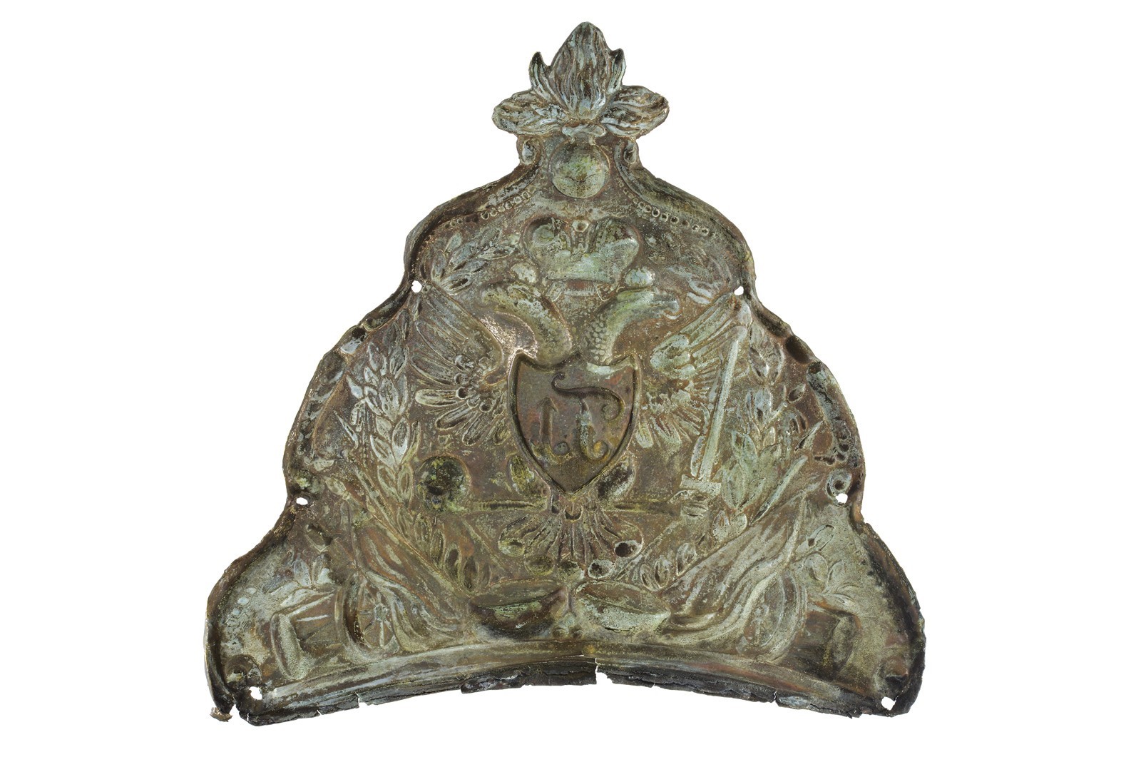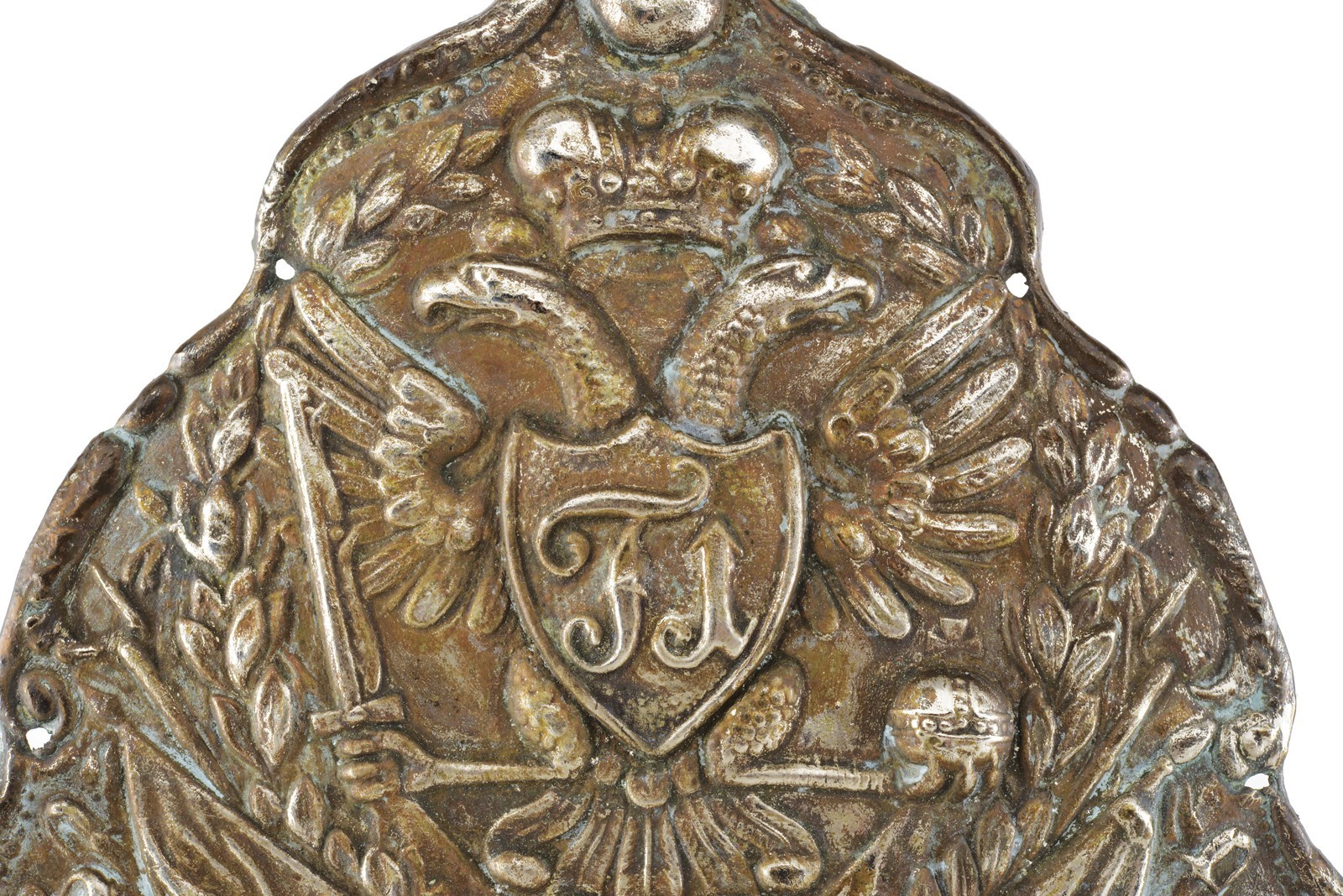 Thin silver-plated brass plate, embossed with a central shield featuring the monogram "F I" on a double-headed eagle among trophies and laurel branches, surmounted by a flaming grenade. Borders with six fixing holes. Minor damage. Rare.