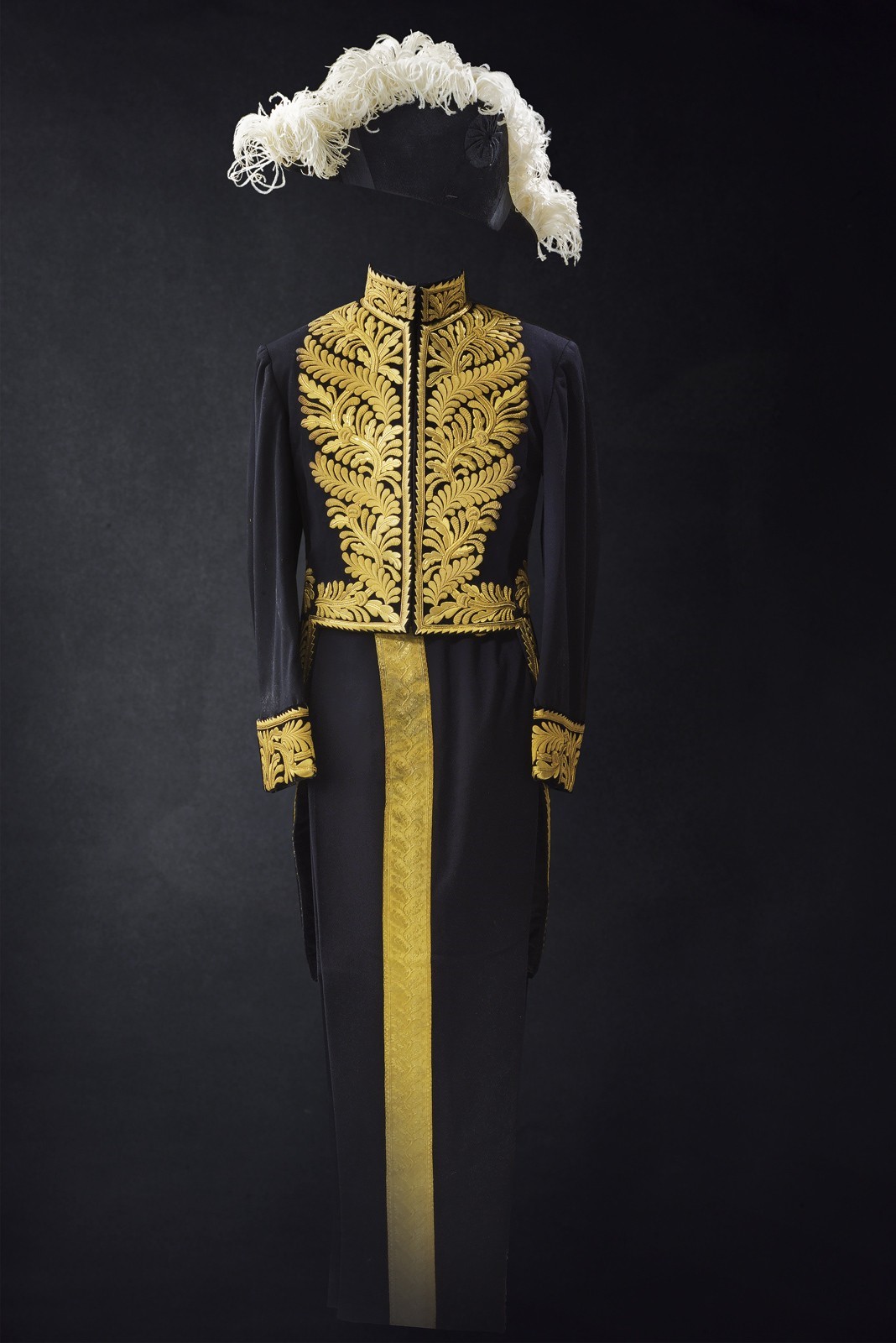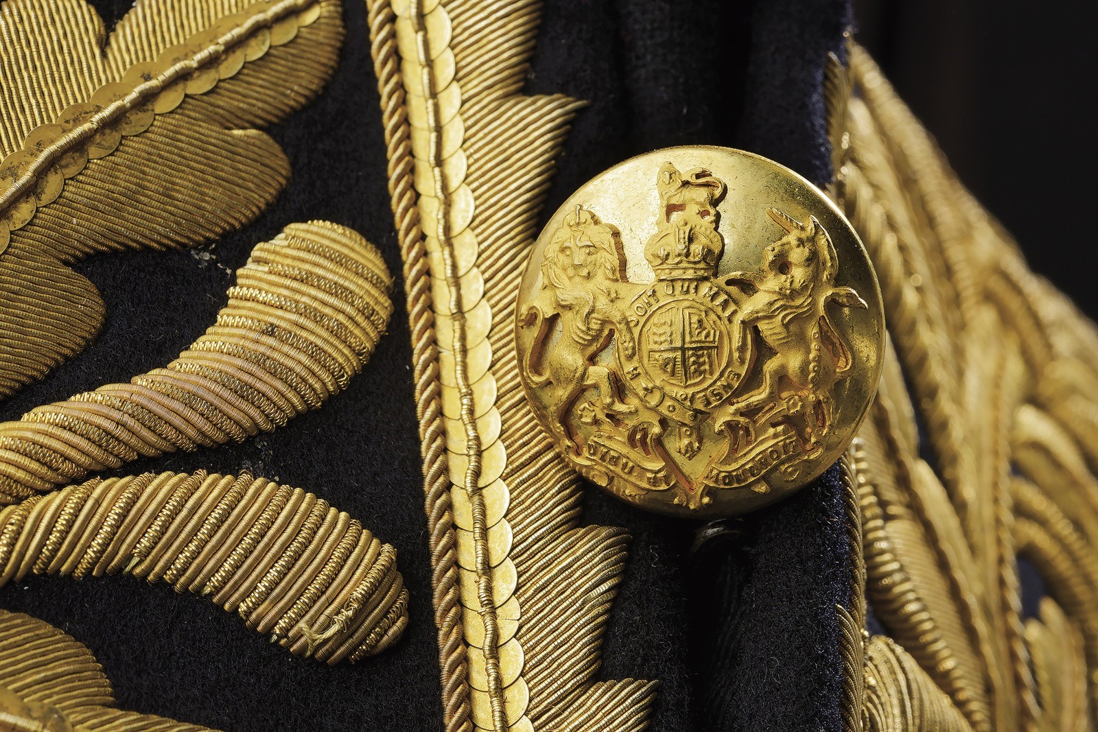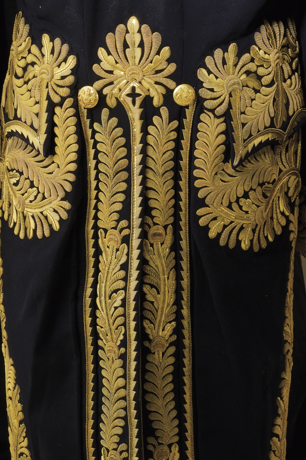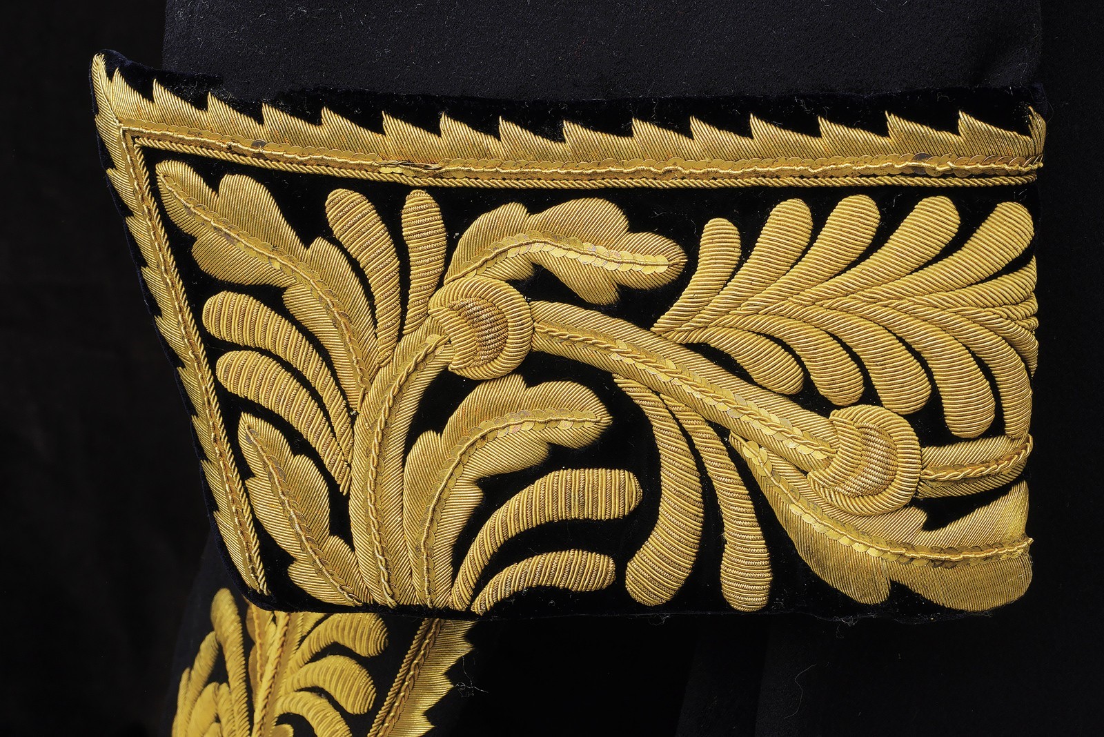 Complete diplomatic uniform of an Ambassador (Envoy Extraordinary and Minister Plenipotentiary), consisting of a black bicorne with black silk cockade and white ostrich plumes. The interior with white silk lining and gilt-stamped maker’s label “Lesley & Roberts, Hanover Square (London).” Tailcoat (frac) of very fine dark-brown cloth with sumptuous gilded-thread decoration and gilt buttons bearing the British Royal Arms with the Order of the Garter. The interior bears the same tailor’s label, hand-inscribed: “His Ecc. E. Keeling.” he ensemble is completed by a pair of trousers