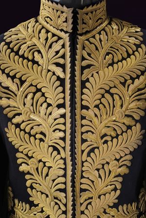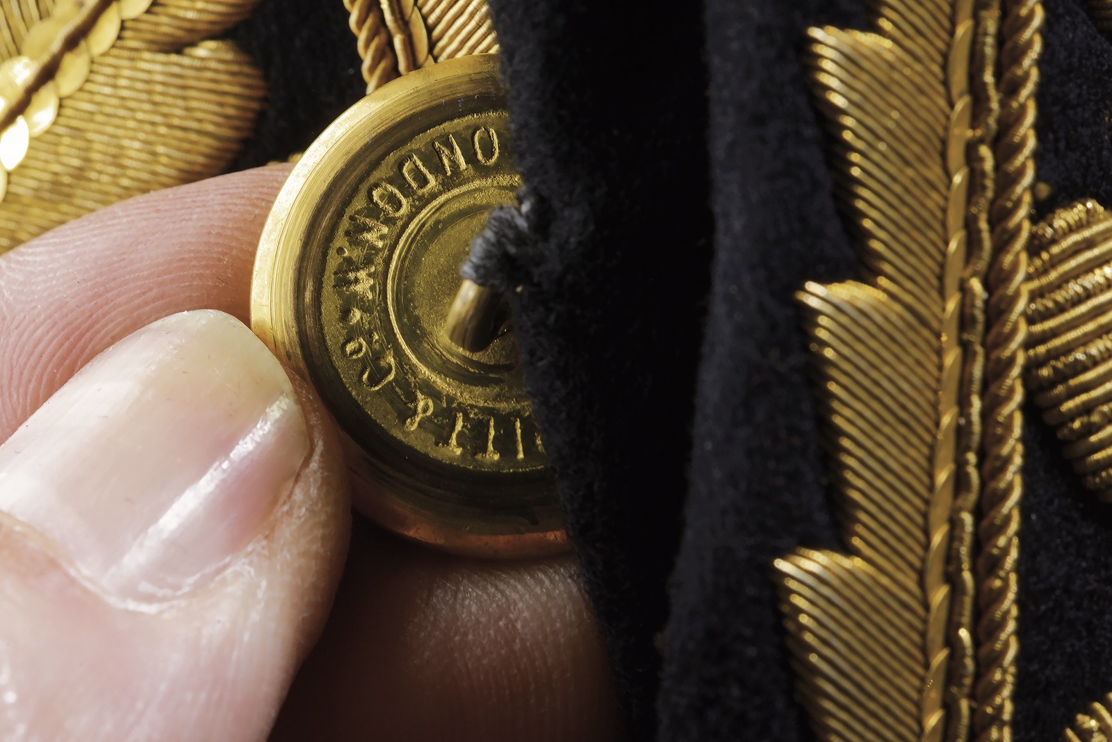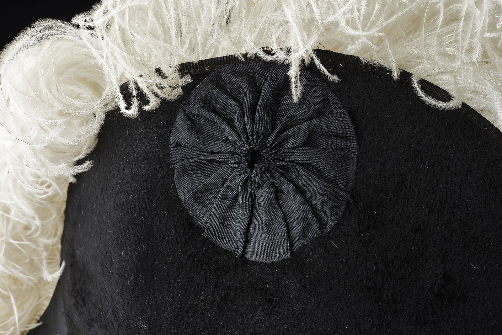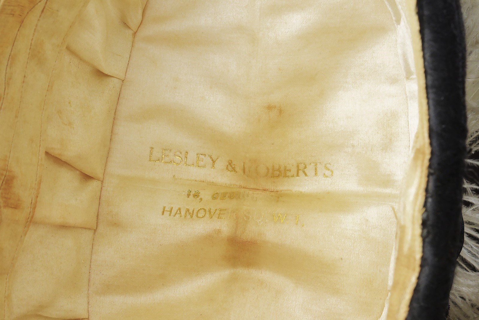 Complete diplomatic uniform of an Ambassador (Envoy Extraordinary and Minister Plenipotentiary), consisting of a black bicorne with black silk cockade and white ostrich plumes. The interior with white silk lining and gilt-stamped maker’s label “Lesley & Roberts, Hanover Square (London).” Tailcoat (frac) of very fine dark-brown cloth with sumptuous gilded-thread decoration and gilt buttons bearing the British Royal Arms with the Order of the Garter. The interior bears the same tailor’s label, hand-inscribed: “His Ecc. E. Keeling.” he ensemble is completed by a pair of trousers