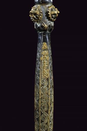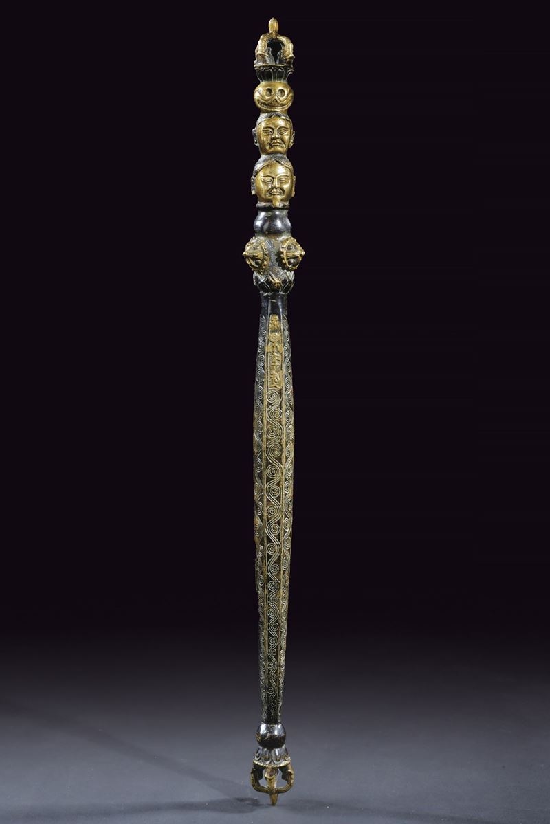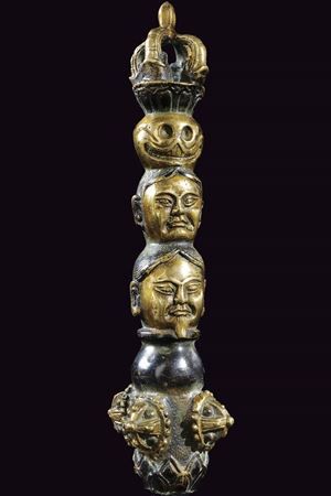 Structure made from a single piece of brass-coloured metal, decorated in relief and with piercedvajra elements. Partially blued to highlight the brass-coloured parts. The Tibetan ritual khatvanga (also spelled katvanga or katvanka) is a symbolic staff or club topped with a skull, often surmounted by a vajra. It has a deep meaning in Vajrayana Buddhism. It represents the union of wisdom and method, symbolizing the non-dual nature of deities who carry it. The skull represents the impermanence of the body and the triumph of wisdom over illusion, while the vajra stands for the thunderbolt of sudden enlightenment and spiritual power. Commonly associated with goddess like Vajravarahi, the khatvanga is typically carried in the left arm socket or balanced across the shoulders during Tantric rituals. Originating in Indic Tantric traditions and later integrated into Tibetan Buddhism, it also has connections to earlier tribal shamanic tools. Ultimately, the khatvanga serves as a powerful emblem of transformation, enlightenment, and the transcendence of duality.