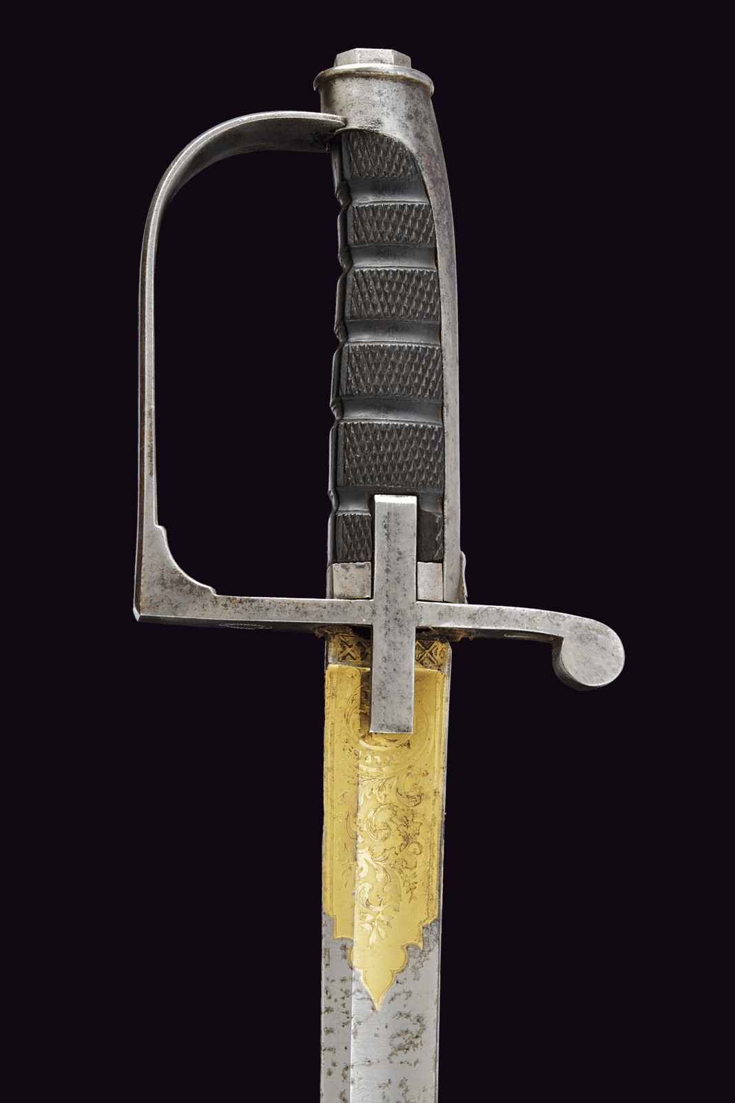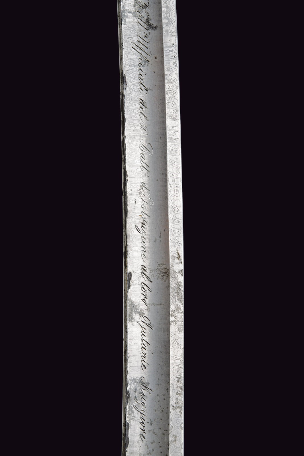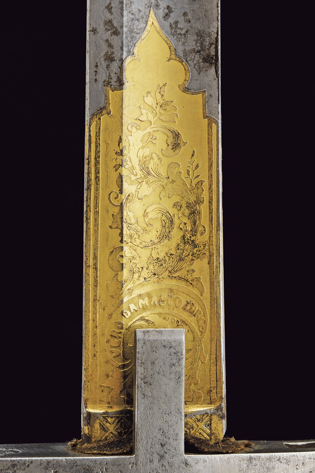 Curved damask blade with tip hollowed on the back, featuring a wide fuller that doubles at the weak. On the right side is the dedication: “I Sott'ufficiali del 2° Batt. d'Istruzione al loro Aiutante Maggiore”. At the base, a segment completely inlaid in gold and engraved with flowers, with the inscription “VERO DAMASCO TURCO” (True Turkish Damascus) and “COUPANTLEFEA” (?). The tang is also gilded. Typical iron hilt with a stirrup guard. Brown wooden handle with knurled sections and a long cap. Complete with its iron scabbard with two lugs. Slight pitting on the iron parts (less noticeable on the blade, a little more evident on the scabbard). Uncommon with the dedication.