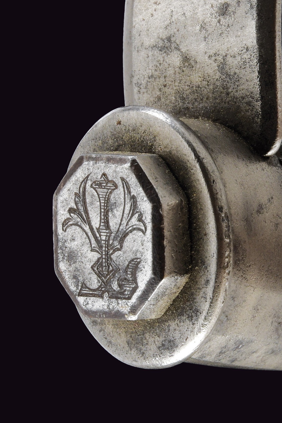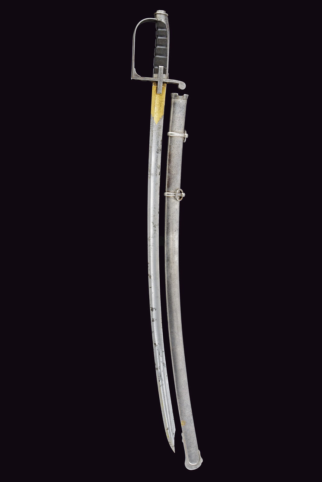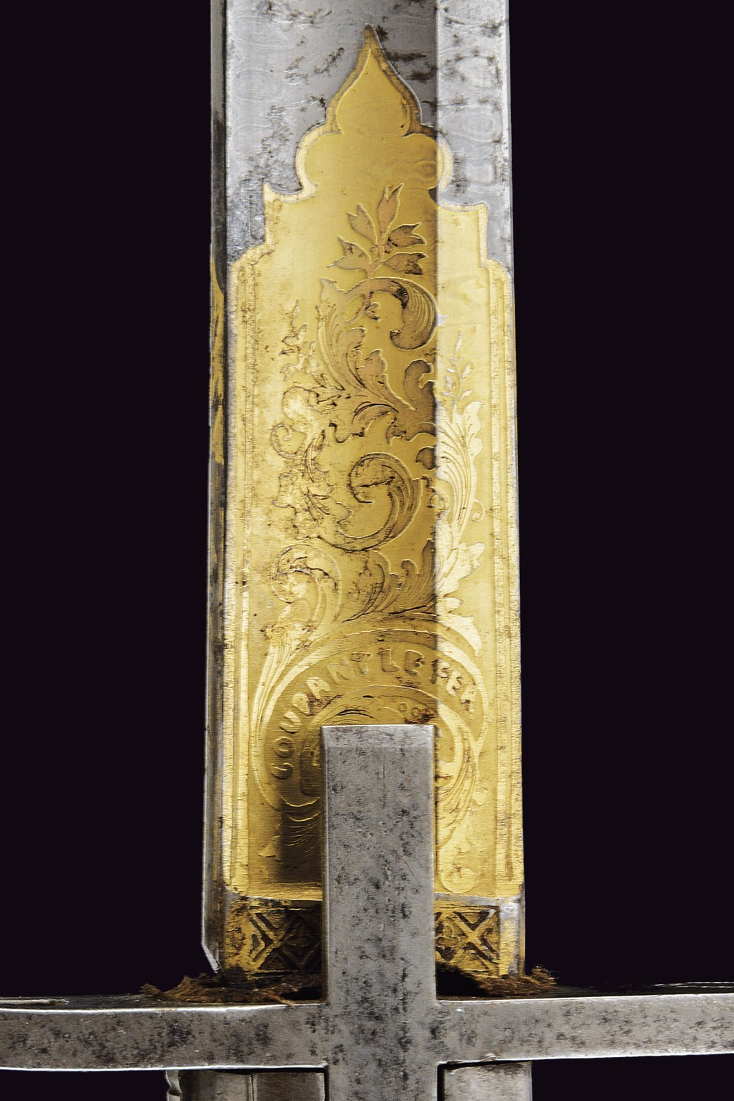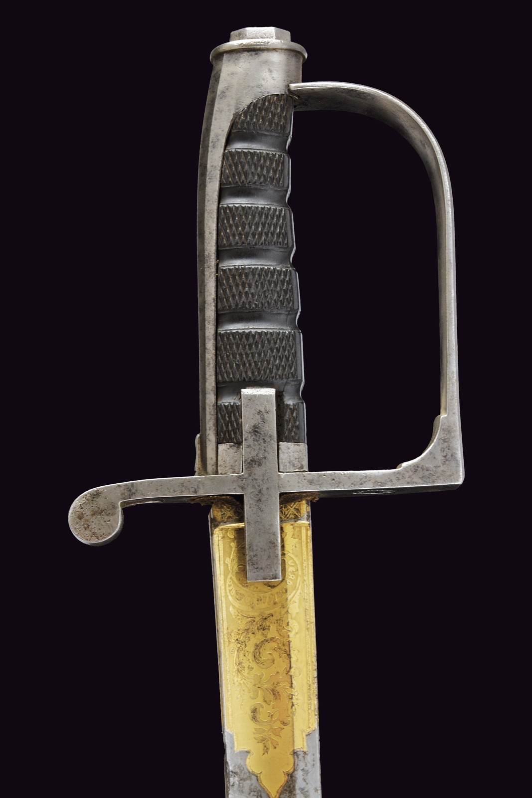 Curved damask blade with tip hollowed on the back, featuring a wide fuller that doubles at the weak. On the right side is the dedication: “I Sott'ufficiali del 2° Batt. d'Istruzione al loro Aiutante Maggiore”. At the base, a segment completely inlaid in gold and engraved with flowers, with the inscription “VERO DAMASCO TURCO” (True Turkish Damascus) and “COUPANTLEFEA” (?). The tang is also gilded. Typical iron hilt with a stirrup guard. Brown wooden handle with knurled sections and a long cap. Complete with its iron scabbard with two lugs. Slight pitting on the iron parts (less noticeable on the blade, a little more evident on the scabbard). Uncommon with the dedication.