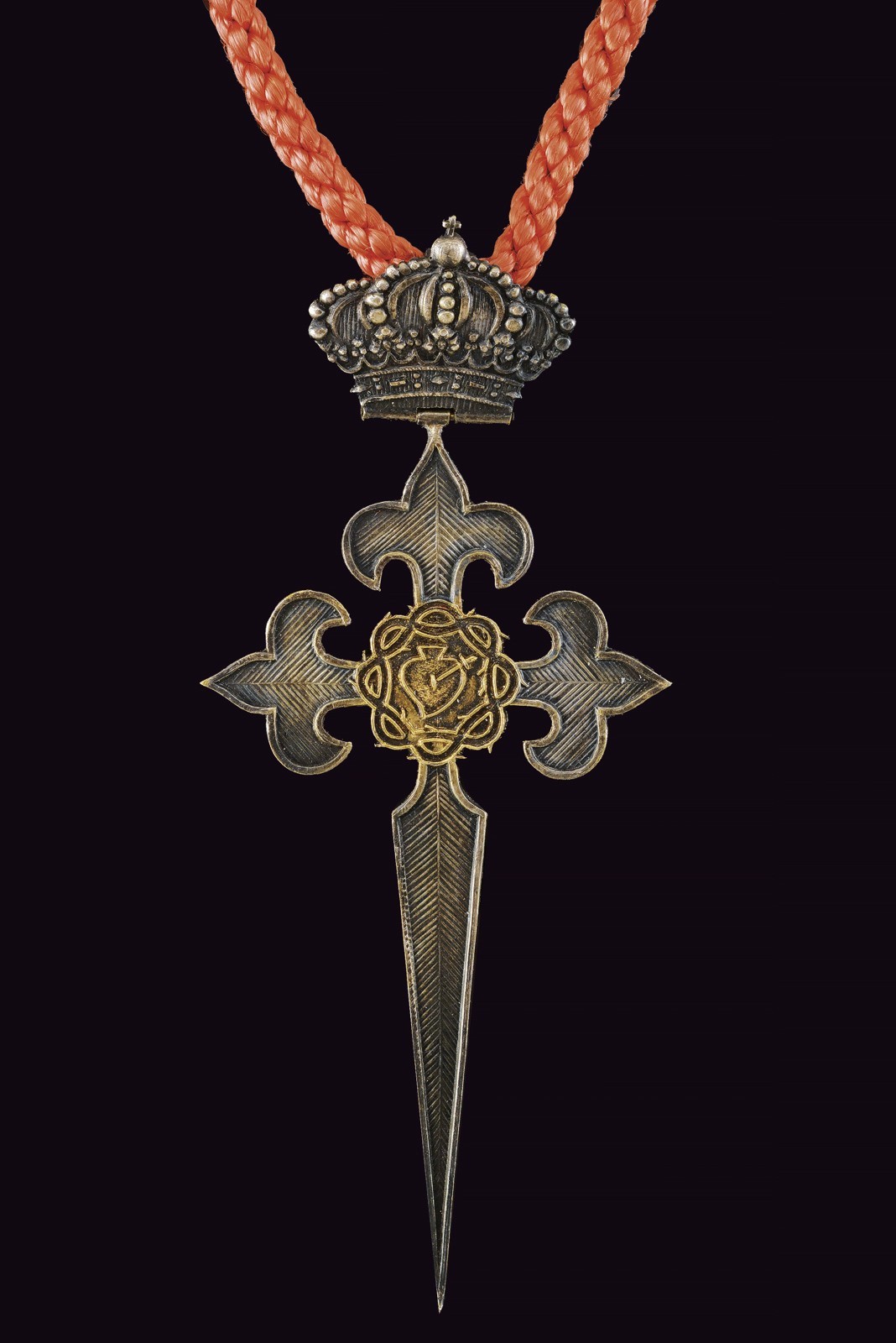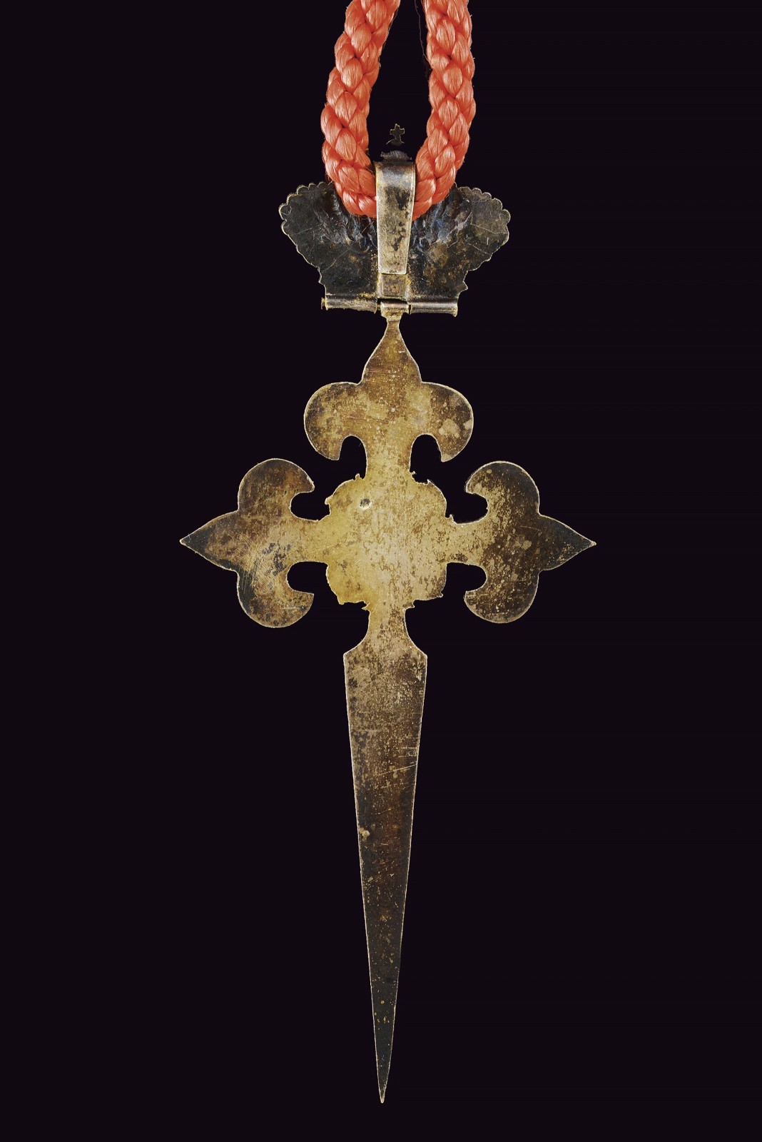 In silver with a central gilded medallion, surmounted by a crown with a hinged attachment and equipped with a long red cord. Rare.