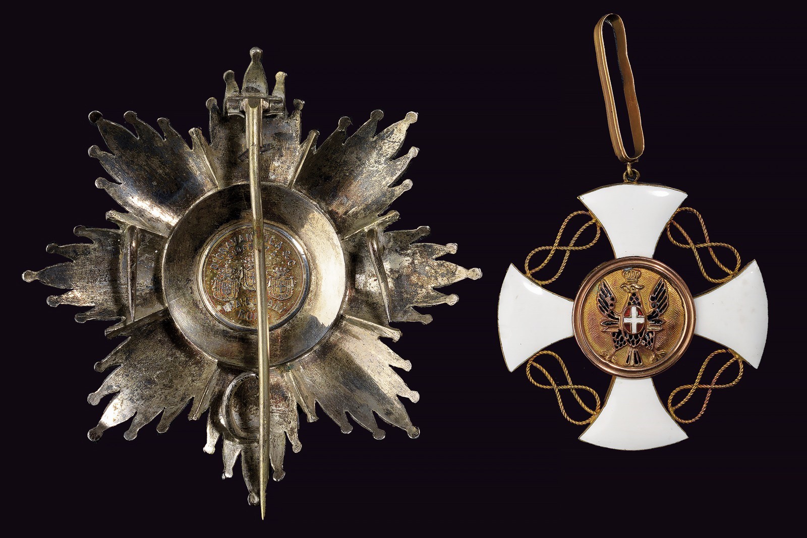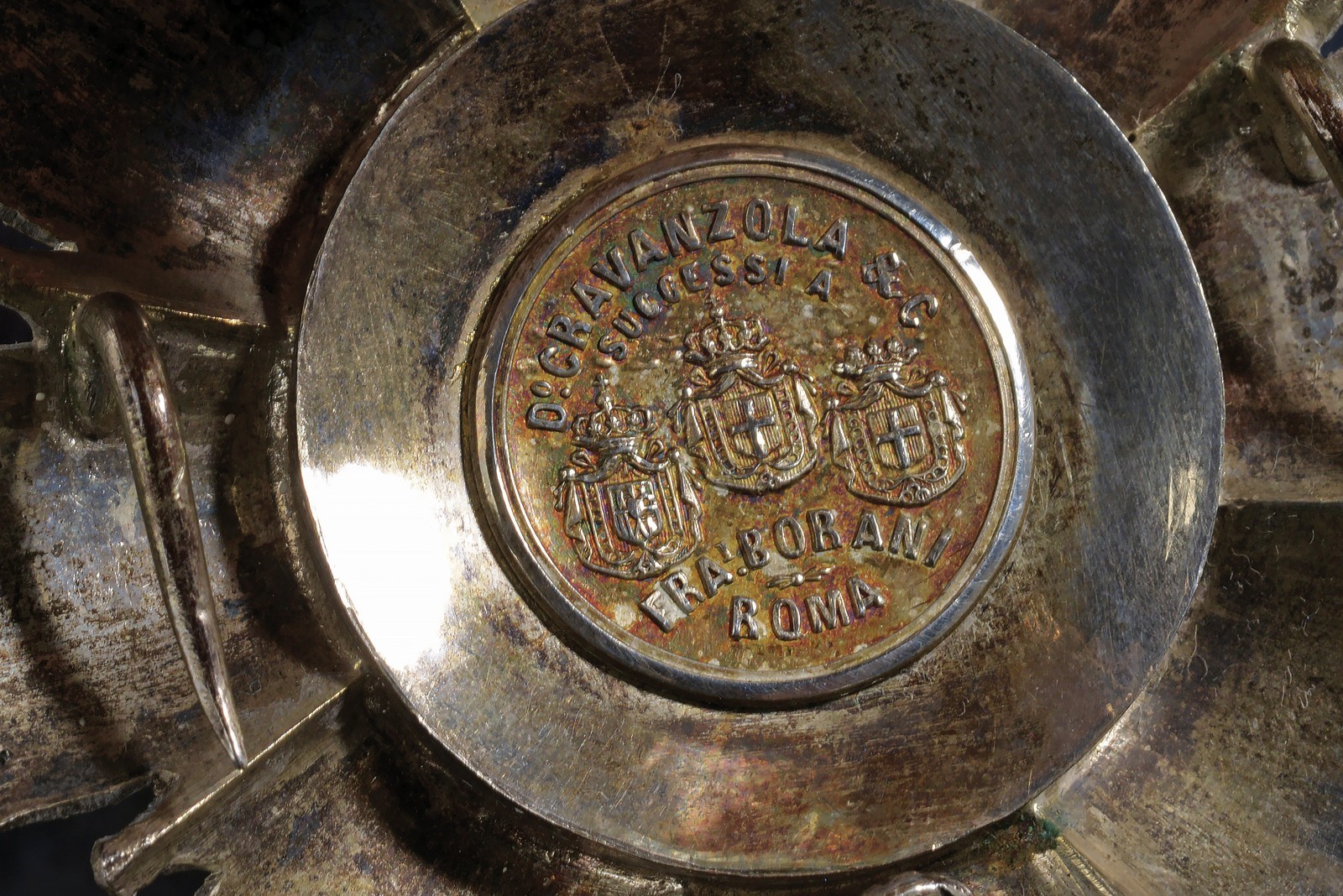 Grand Cross set. Cross made of gilded metal and enamel. Silver plate with gold and enamel appliqués, vertical pin between two hooks, marked "GRAVANZOLA & C. SUCCESSORI A . FRA.I BORANI ROMA" and "GRAVANDOLA ROMA".