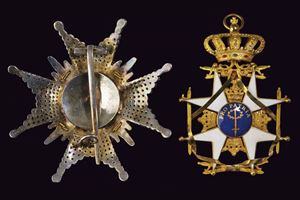 Grand Cross set. Gold and enamel pendant. Openwork silver plate with enamelled centre, gold crowns and swords. Rare.