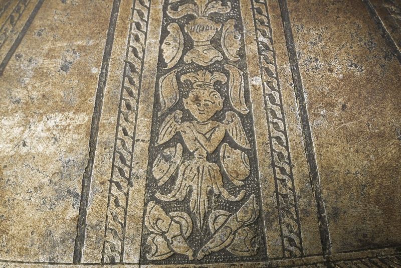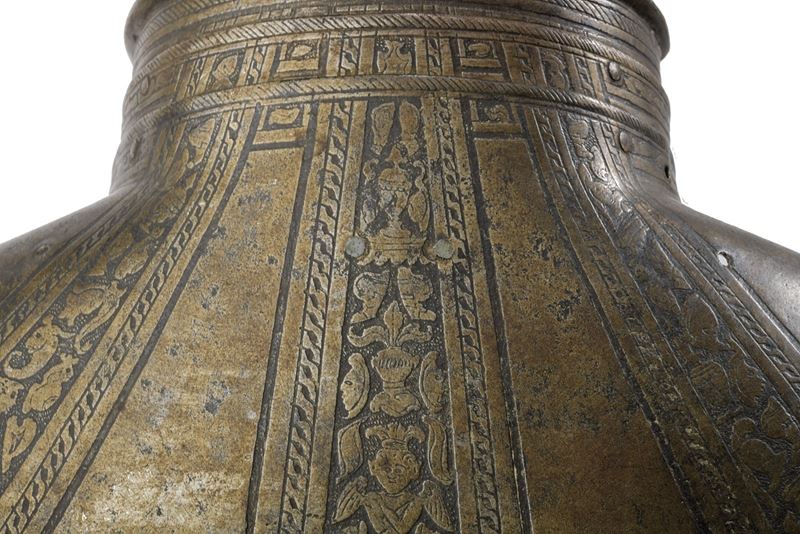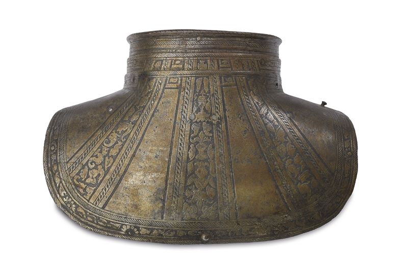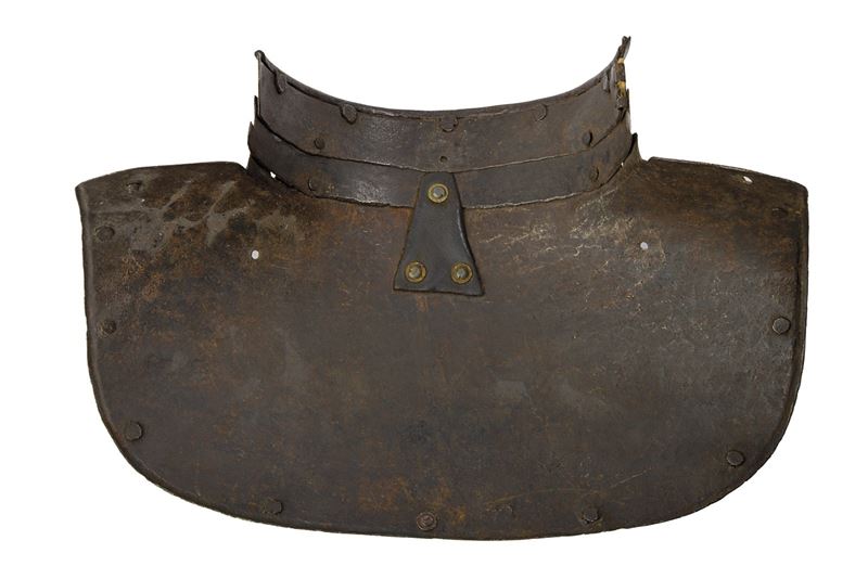 Two neckguard plates, the first with a turned border; back plate completely engraved with bands surmounted by trophies.