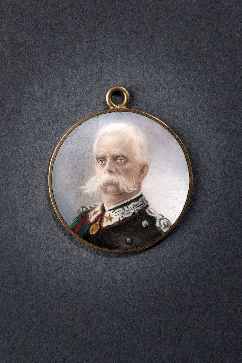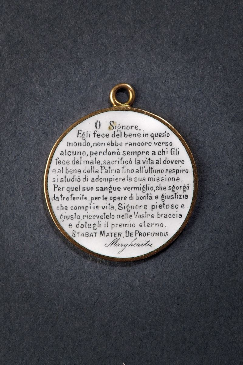 Polychrome enamel medallion with portrait of King Umberto I of Savoy in general's uniform. On the back of the portrait there is a prayer by Queen Margherita: “O Lord, he held no grudges against anyone and always forgave those who hurt him, he sacrificed his life for his country and strove to fulfil his mission until his last breath. For his red blood, shed from three wounds, and for the good and just deeds he accomplished in life, merciful and just Lord, receive him into your arms and grant him eternal reward.STABAT MATER, DE PROFUNDIS. Margherita.” .The thin frame with gold suspension ring.