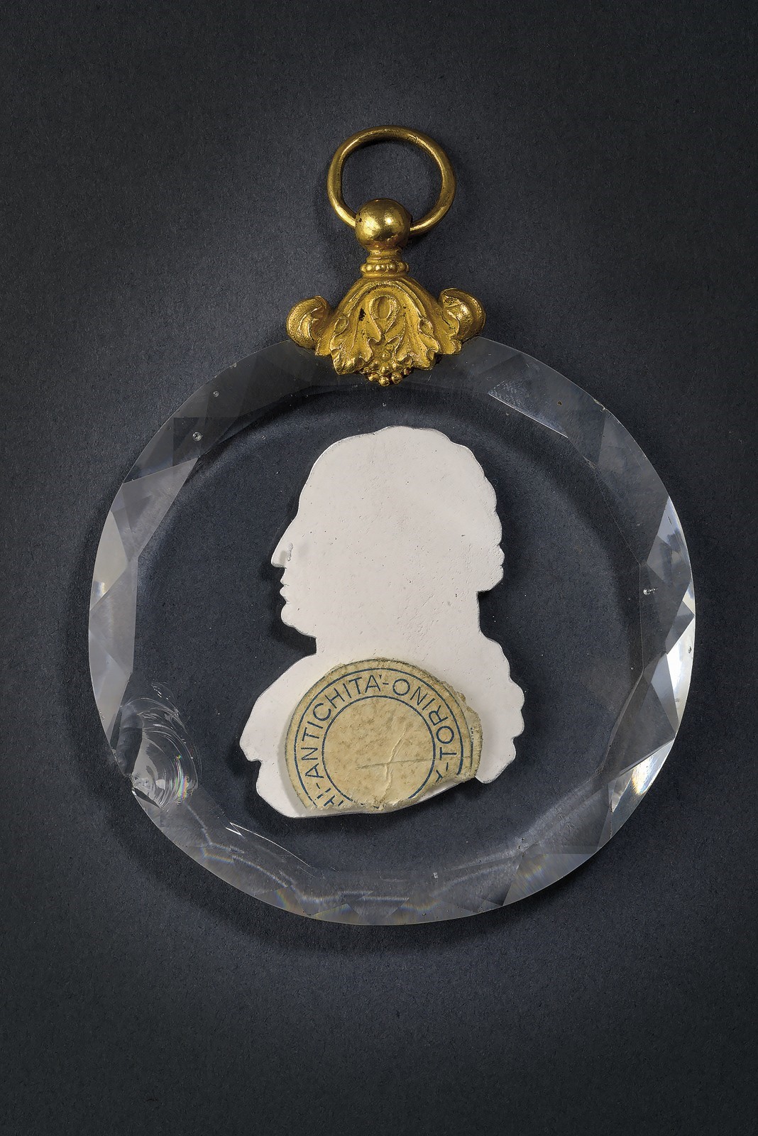 Portrait of the king made of silver-plated paste within a crystal circle; faceted border with triangular cuts; small chip on the lower right edge. At the top, gilded metal frame with foliage and suspension ring.